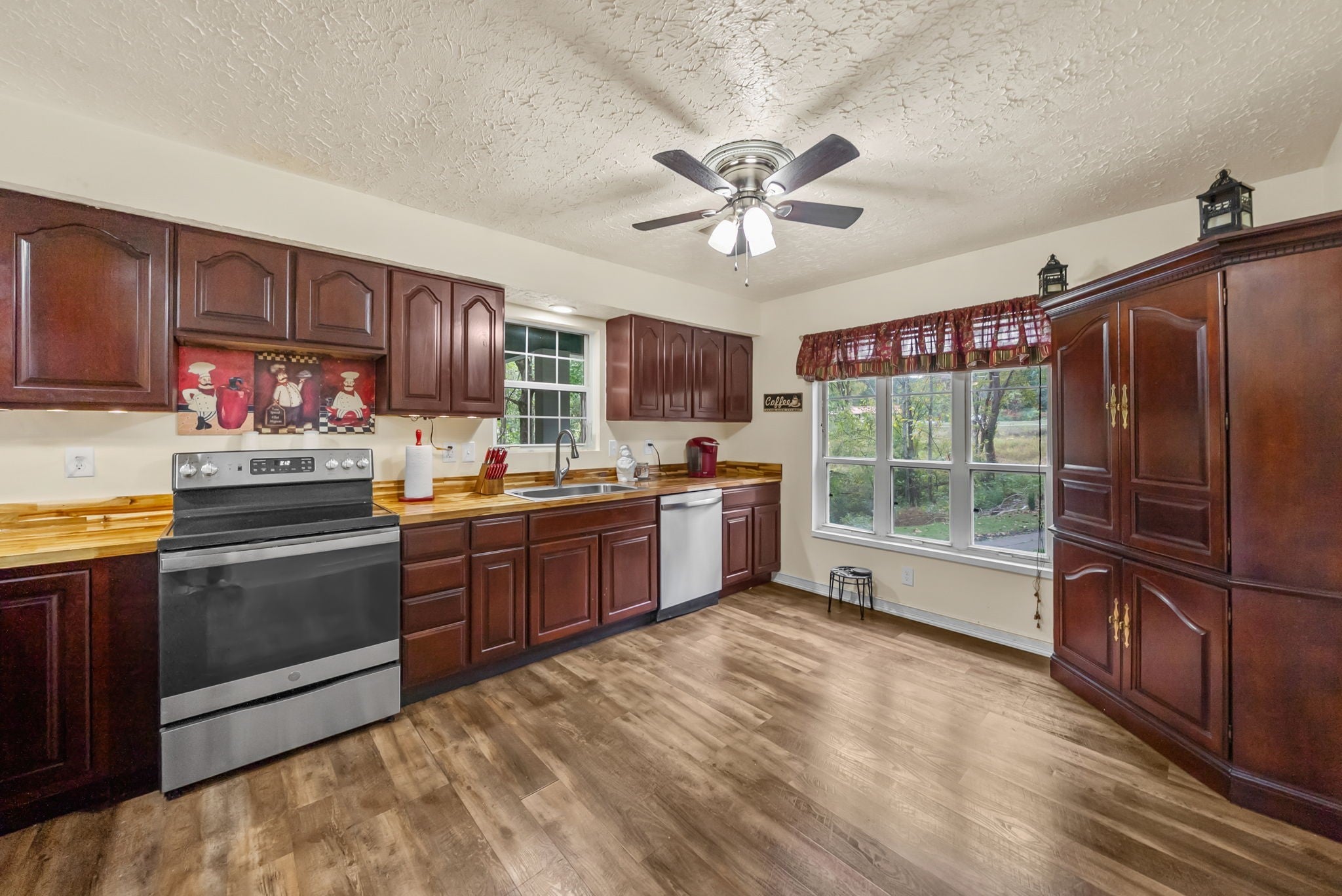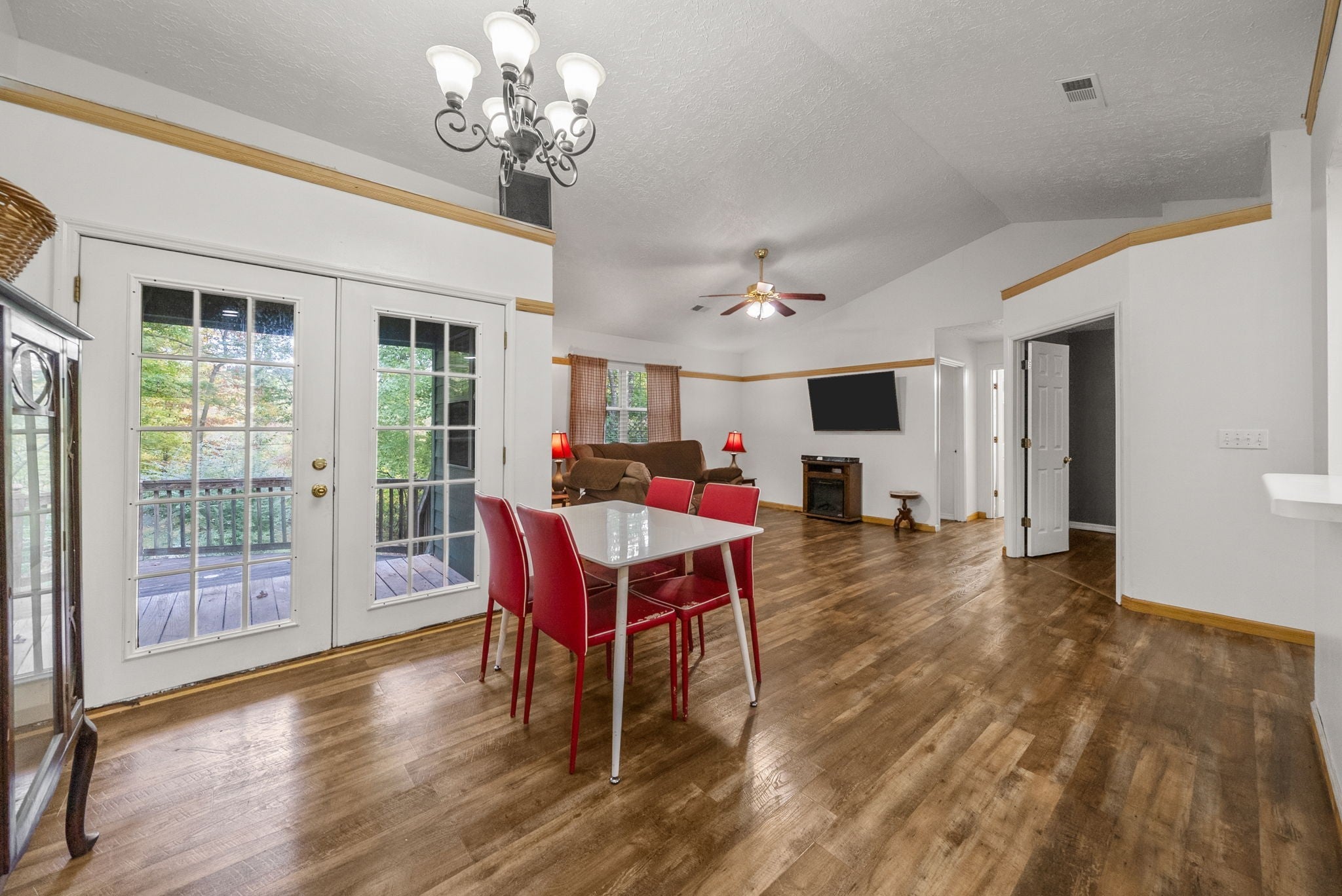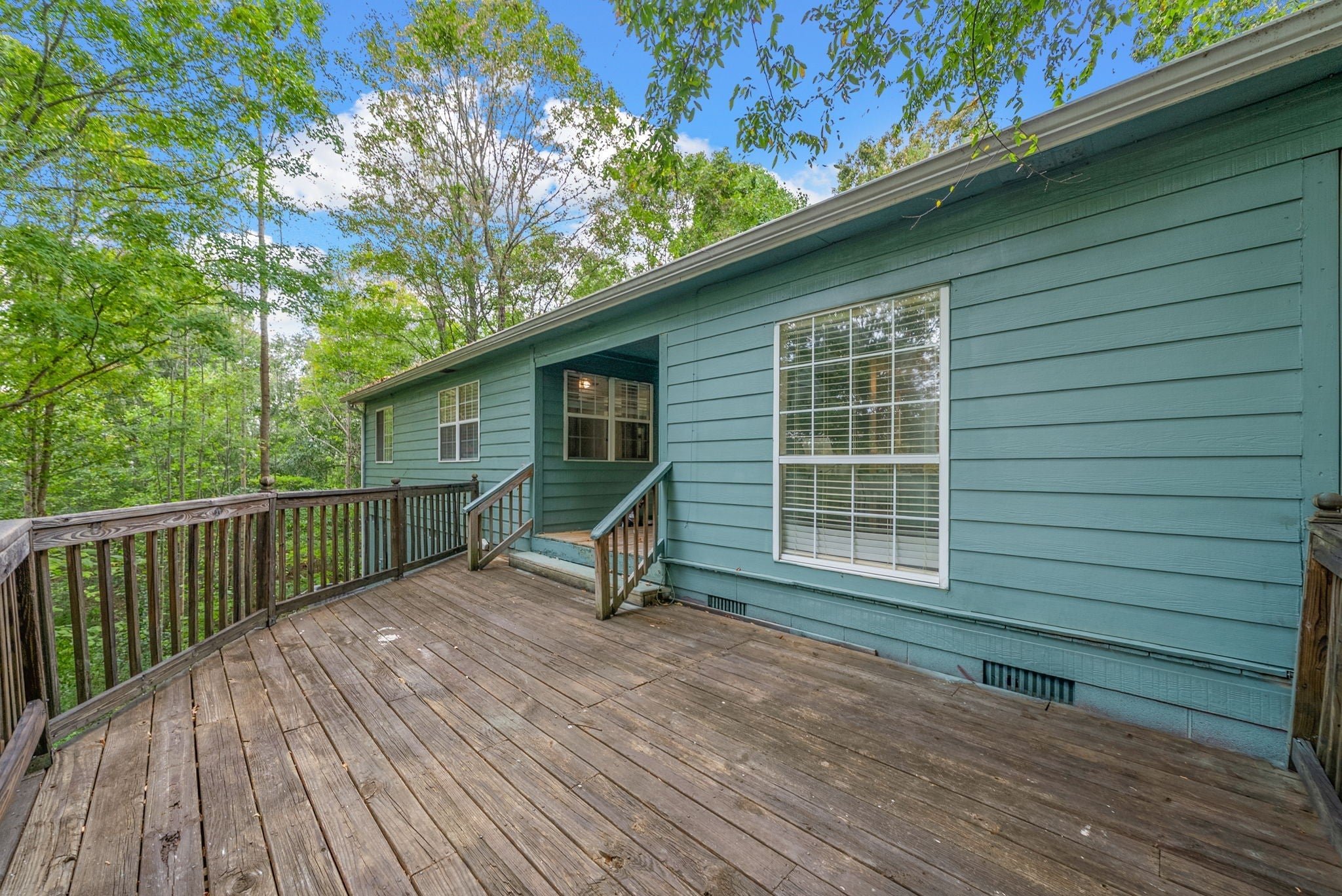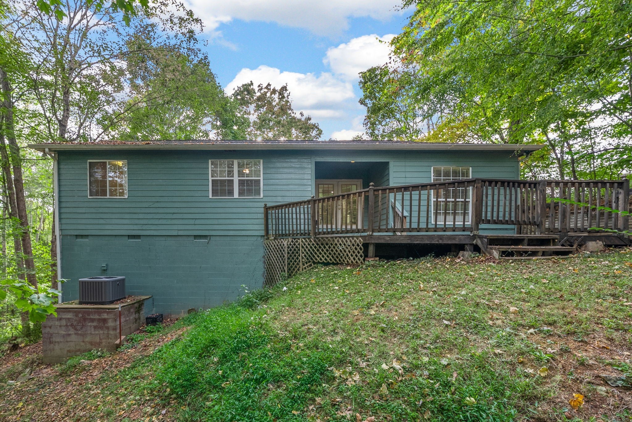 Nestled on a serene and secluded 3.4-acre wooded lot, this lovingly maintained one-story home offers the perfect blend of privacy, charm, and convenience. Built in 1997 and owned by the same family since, this property is move-in ready! Inside you will walk into tall ceilings in the open concept living and dining room, a warm and inviting kitchen featuring rich cherry wood cabinets and gorgeous butcher block countertops, and a primary bedroom with a spacious closet. Outside is a cozy patio, freshly stained back deck perfect for listening to the crickets, personal storage building, and a cleared trail through the woods! Major updates include the roof around 7 years old, HVAC/ductwork around 5 years old, and water heater/washer/dryer around 3 years old! All TV's convey as well! This home is a rare find for those seeking peace, space, and value! Motivated seller is offering buyer concessions! **This home is listed well below the current market value!** Don't miss an opportunity to purchase a home with equity!