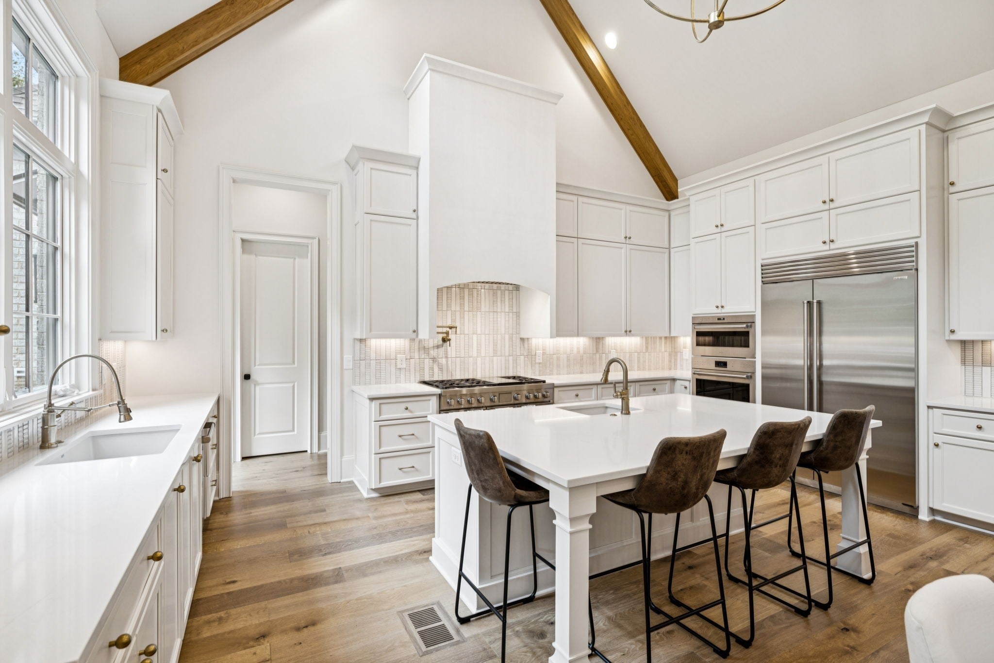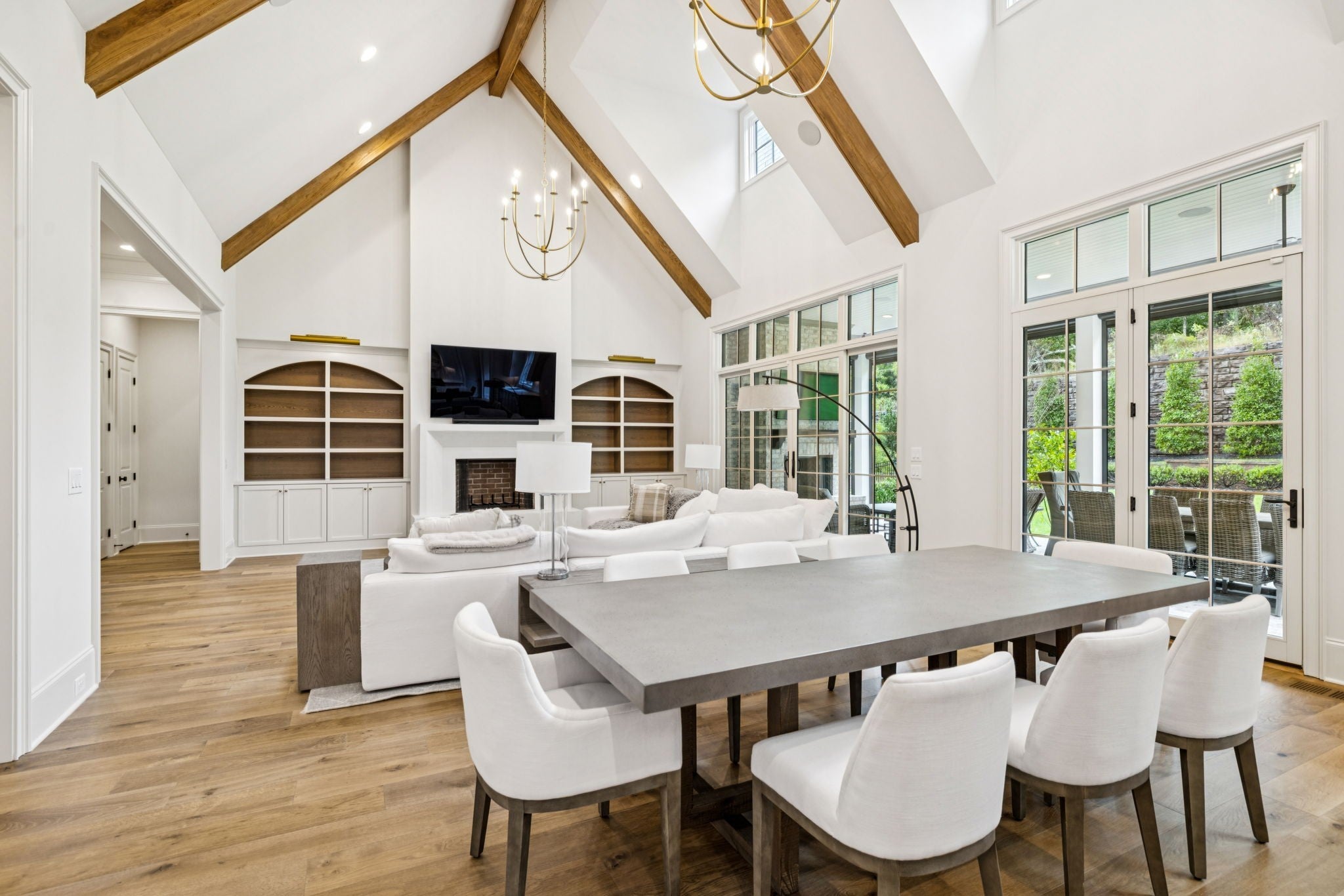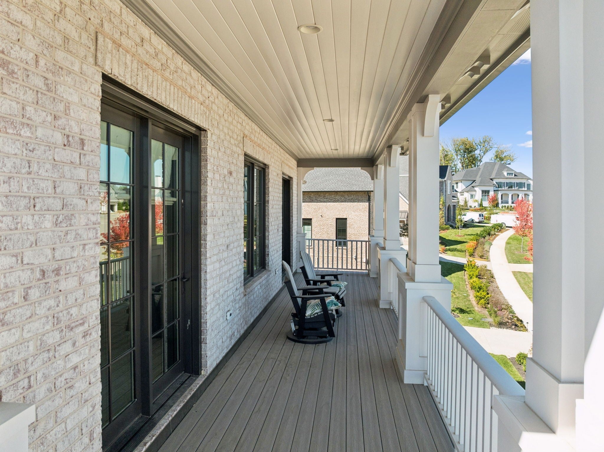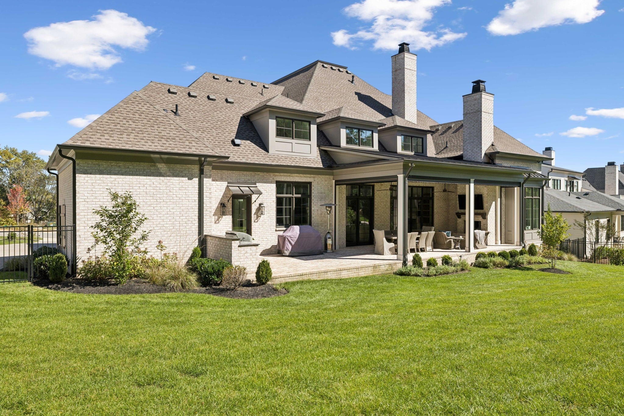 Experience The Grove living in this beautiful Georgian-style home built by Ford Homes! Featuring not one, but two charming covered front porches. The flexible floor plan is a true highlight, featuring a highly sought-after main-level Primary Suite, complete with a vaulted ceiling and a huge walk-in closet. The main floor is designed for effortless entertaining: an open Great Room full of natural light with stunning exposed wood beams, a dedicated dining area, and an exquisite chef's kitchen. Step outside to the ideal outdoor oasis: a covered porch with retractable screens and a wood-burning fireplace for year-round enjoyment, plus an uncovered grilling patio. The main floor also offers an additional second bedroom and a private study. The second level has three more bedrooms, a large equipped game/media room with a wet bar. Make sure to visit The Grove's clubhouse and amenity center to see the pool, tennis, restaurant, golf, and more!