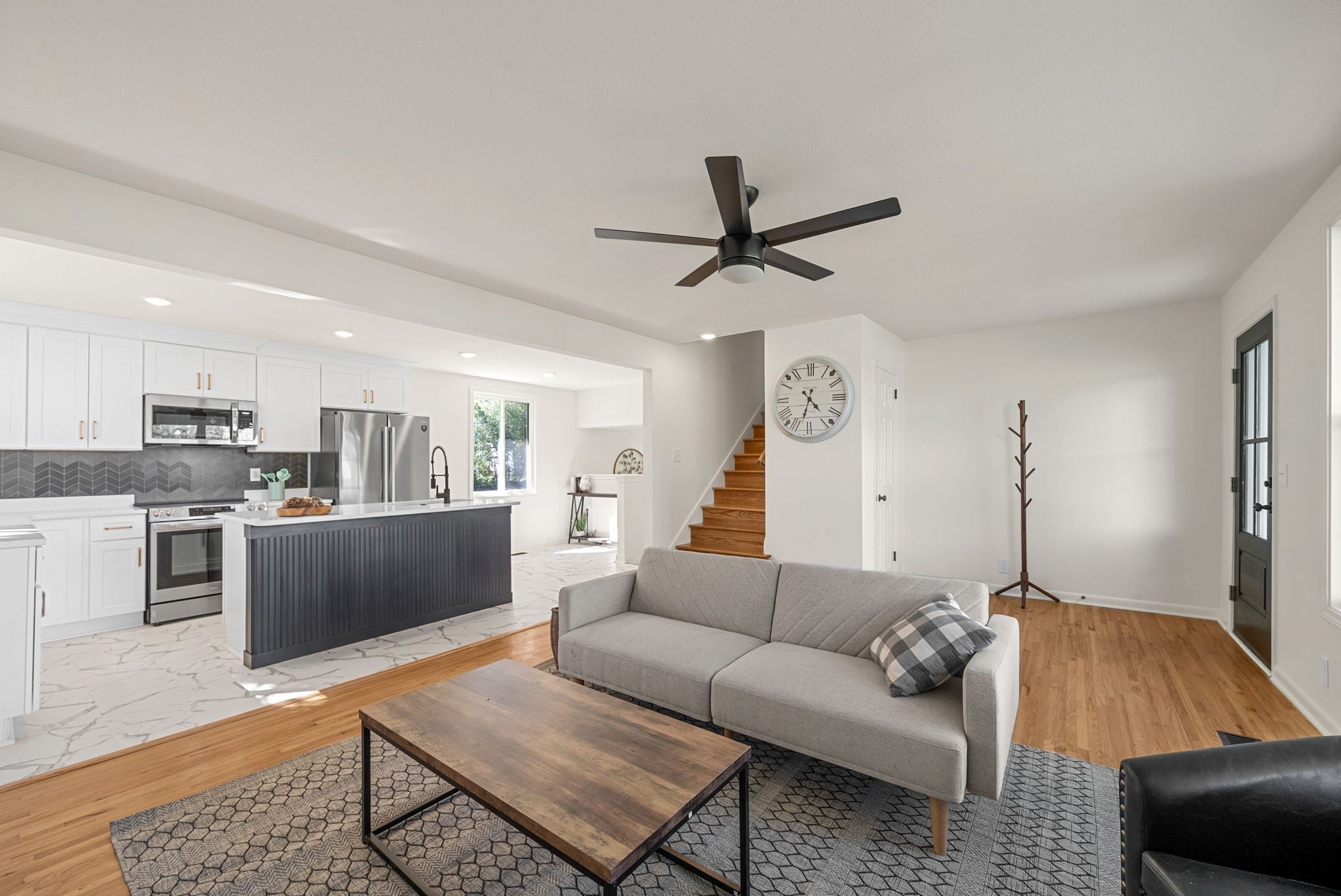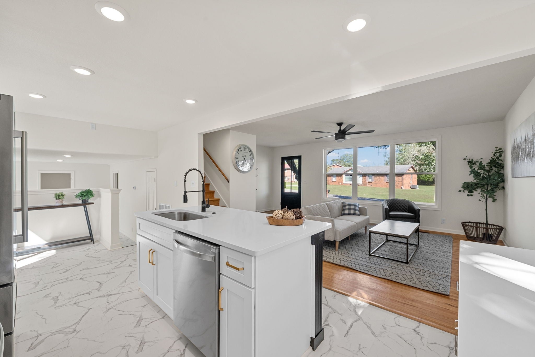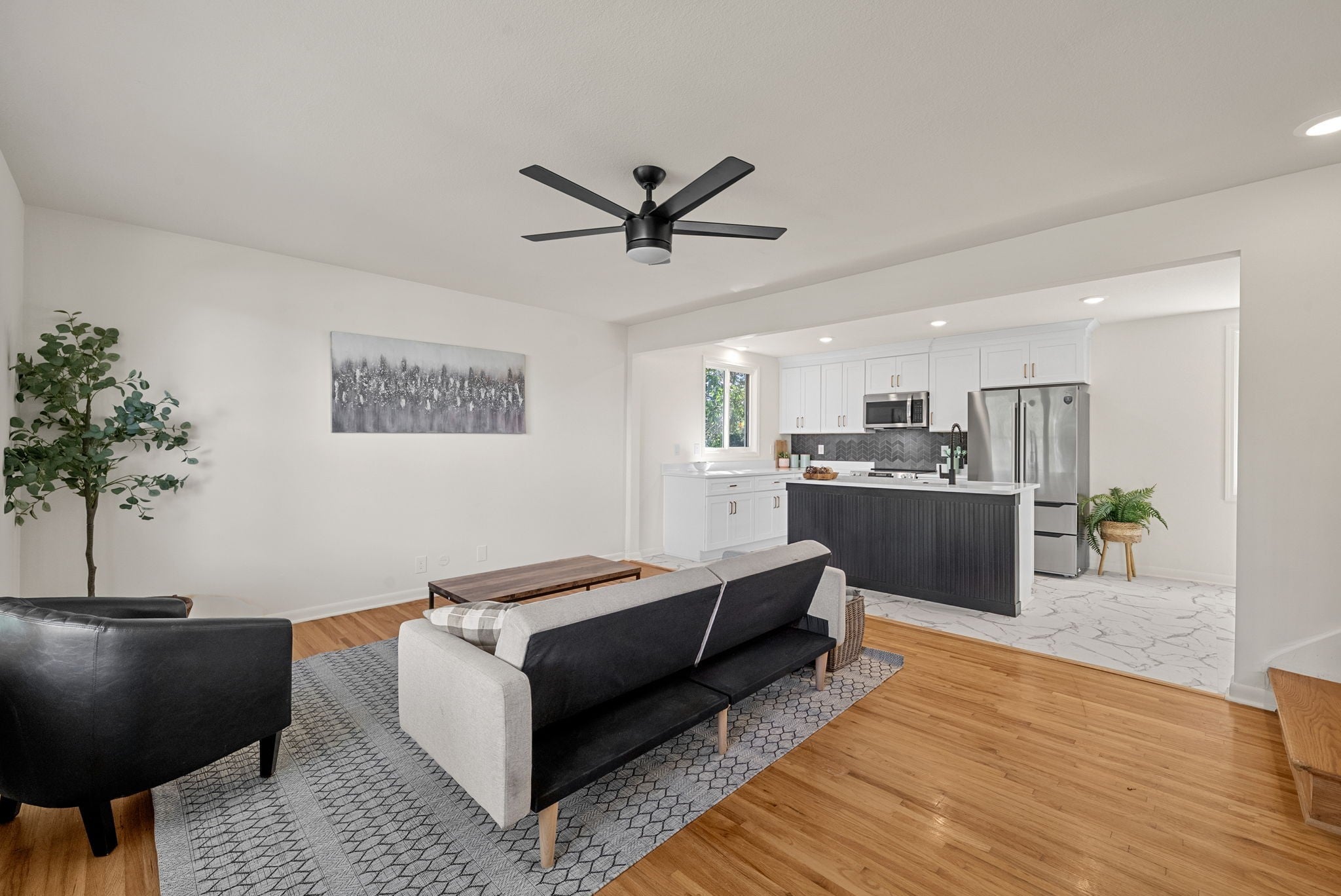Don't miss out on this top to bottom renovation with plenty of natural light, style, and luxury for its price point! This house is easily one of the most inviting on the block -- the exterior greets you with freshly painted brick, brand new batten siding, all new tinted windows throughout the house, and clean landscaping. Once you walk in the front door, you'll notice an open concept feel in this tri-level floorpan with original hardwood floors in the spacious living room that flows seamlessly into the kitchen after the renovation. Kitchen comes equipped with modern pure white quartz countertops & custom wooden cabinetry, a new $5,000 appliance package, and an island with a bar. There's also a small dining nook before stepping down into a flex space that could be used as a second living space or larger dining room. Also on the lower level is the much improved Owner's Suite complete with walk-in closet and full bathroom, all conveniently located right next to a very generous laundry room / mud room that accesses the garage. The upper level of the house holds three bedrooms and another full bathroom, with one of the bedrooms having direct access to the bathroom. You'll find the backyard has plenty of space for play and the neighborhood is pleasantly quiet on a dead end street with reduced through traffic.