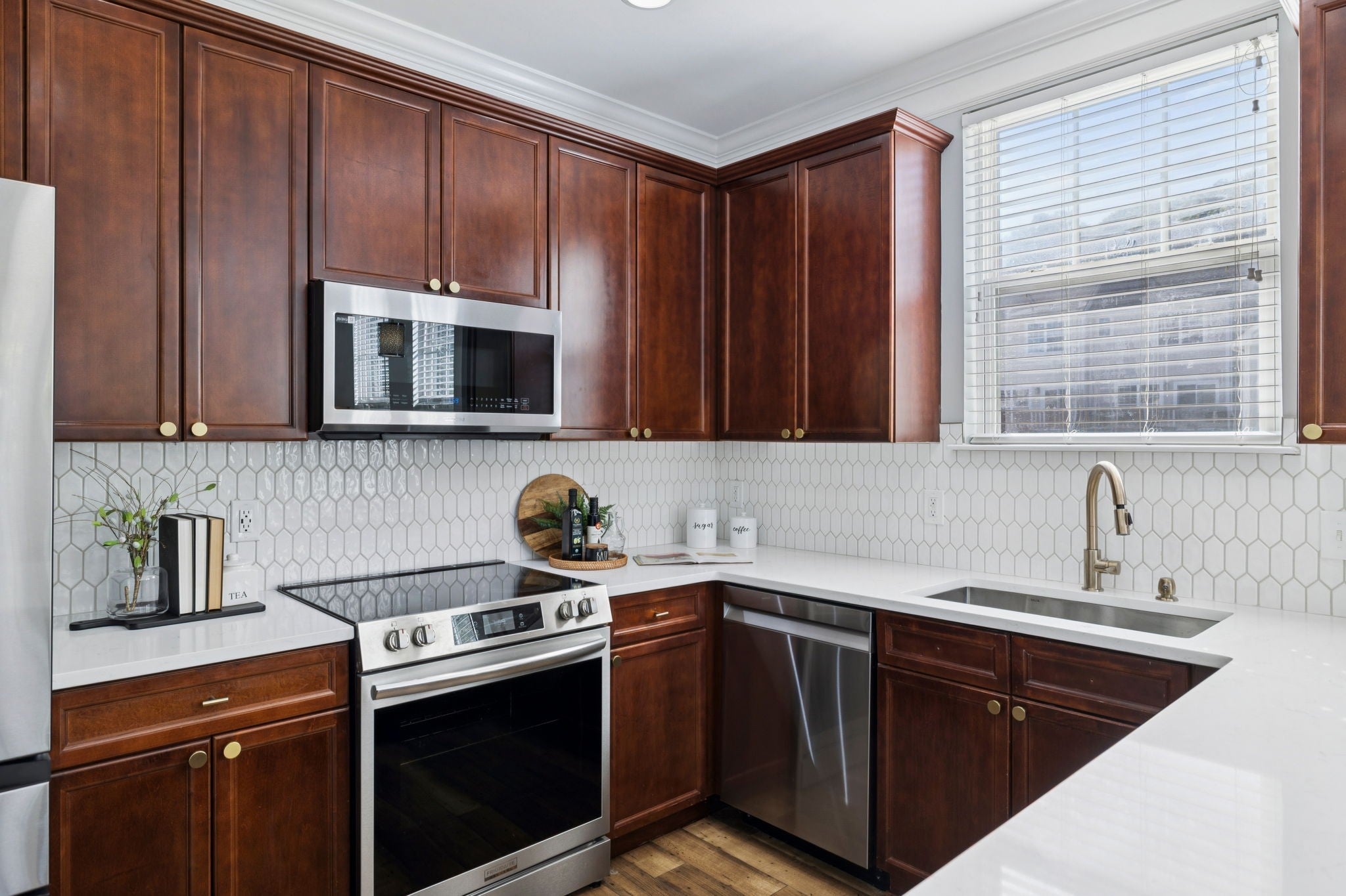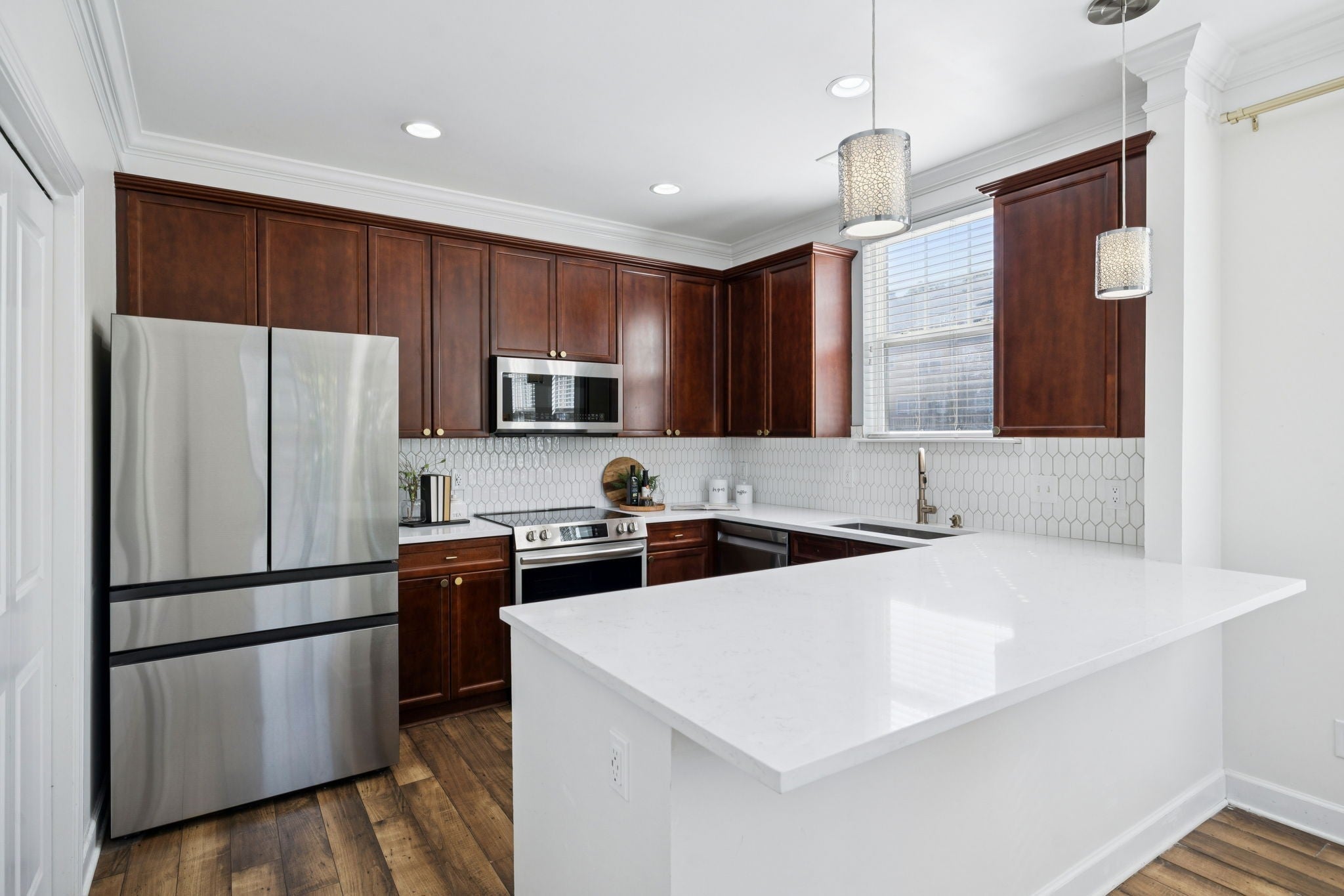 Renovated End Unit brick townhome located in the desirable Lenox Village Community * Private Entrance through the fenced rear courtyard * The upper level spacious main living area with an adjoining kitchen and dining room has abundant natural light* Updated Kitchen includes NEW White Quartz countertops with NEW white decorative backsplash, All NEW Stainless appliances, NEW Stainless Sink with Faucet and NEW Cabinet Hardware * NEWER Washer/Dryer Remain *This home has a wonderful wrap around upper terrace overlooking community green space * Located on the 2nd floor is the primary bedroom suite with an Updated primary bath: NEW White Quartz Counter tops, NEW sinks and NEW plumbing fixtures, NEW Mirrors, and NEW Lighting * Flooring is mostly laminate hardwood style, neutral paint throughout * Enjoy the neighborhood walking trails, restaurants and shops *It is an easy walk to the playground and conveniently located near Downtown Nashville, Brentwood, Cool Springs and Nolensville.