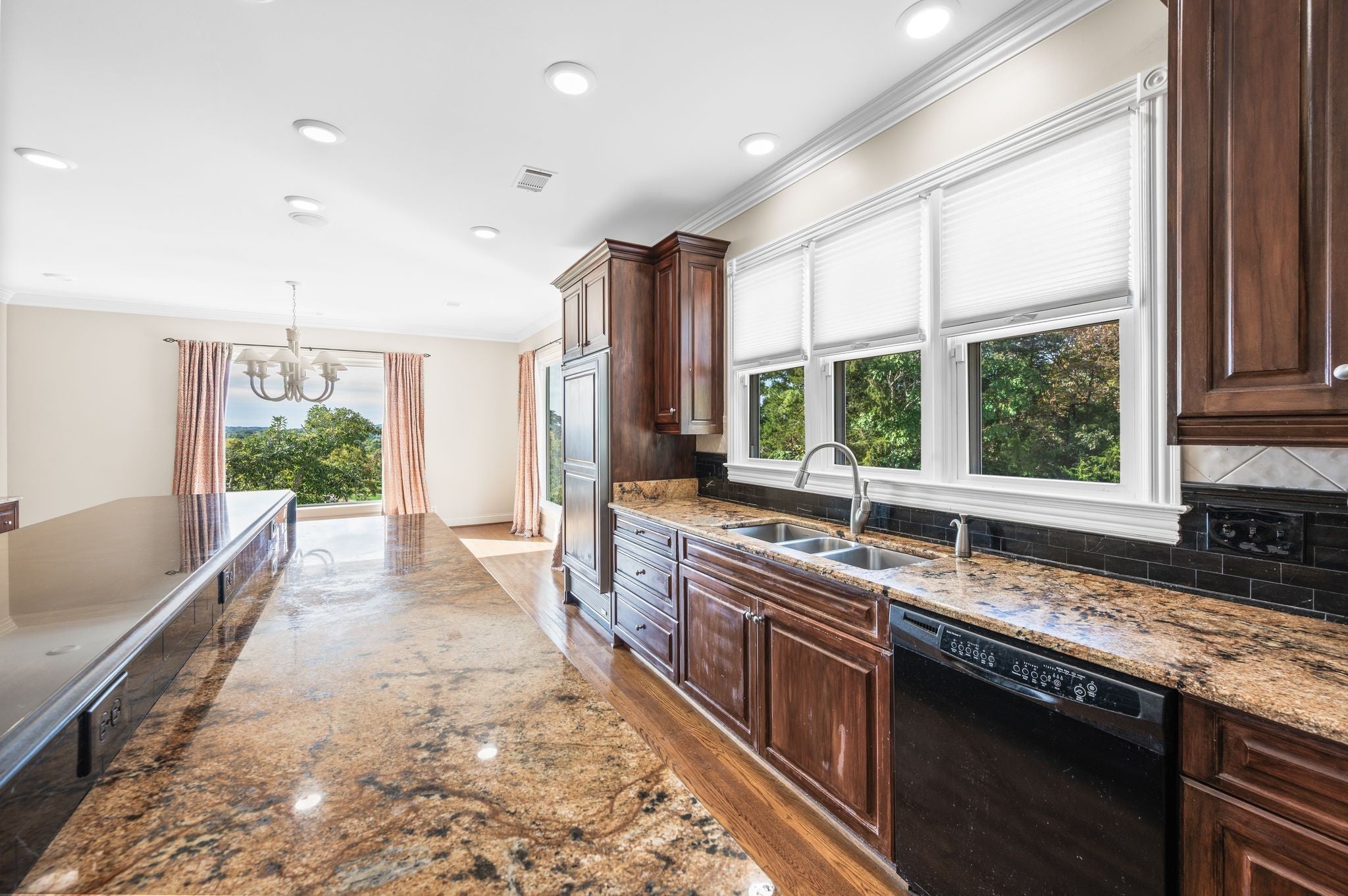 Stunning Views from every window of this beautiful Brentwood custom home, built by Keith Schumacher, nestled at the end of a quiet cul-de-sac on a private, tree-lined 1.11-acre lot.This elegant 5-bedroom, 6-bath residence offers over 7,000 square feet of luxurious living space designed for both comfort and entertaining. The main level features a grand marble foyer with a sweeping staircase, formal dining room with hardwood floors and wainscoting, a light-filled gourmet kitchen with granite countertops, double ovens, built in refrigerator and separate built in freezer, Thermador warming drawers, pantry, and breakfast room with picture windows, spacious laundry room. The formal living room impresses with soaring ceilings, a gas fireplace with ornate mantel and rich hardwood floors, while the adjoining study offers elegant wainscoting with gorgeous views. The main-level primary suite provides a peaceful retreat with His-and-Hers closets and a spa-inspired bath with jetted tub, fireplace, and patio access. A cozy den with gas fireplace and walls of windows completes the main floor. Upstairs are three spacious bedrooms with ensuite baths and walk-in closets, plus two additional laundry connections. The finished lower level is an entertainer’s dream with a media room, game room, guest suite, and full bath. Additional highlights include a spacious four-car garage with extended driveway, expansive patio for outdoor gatherings, irrigation and central vacuum system, and impeccable attention to detail throughout.