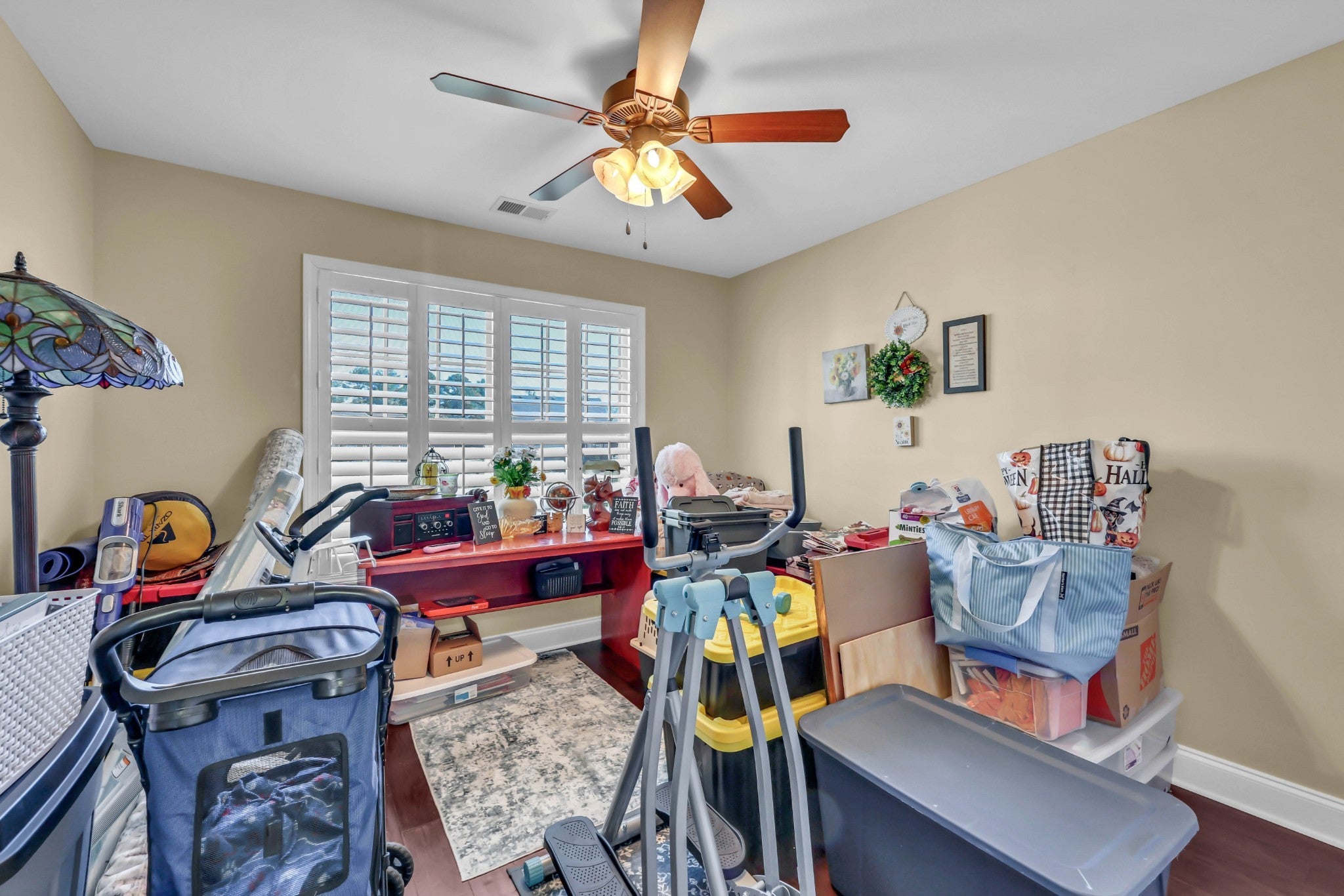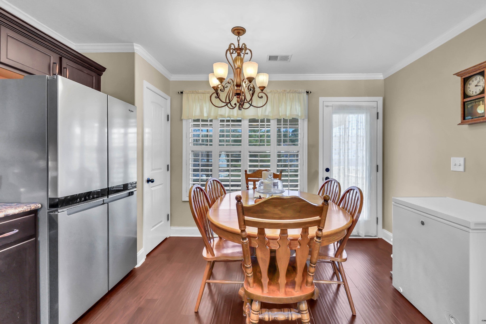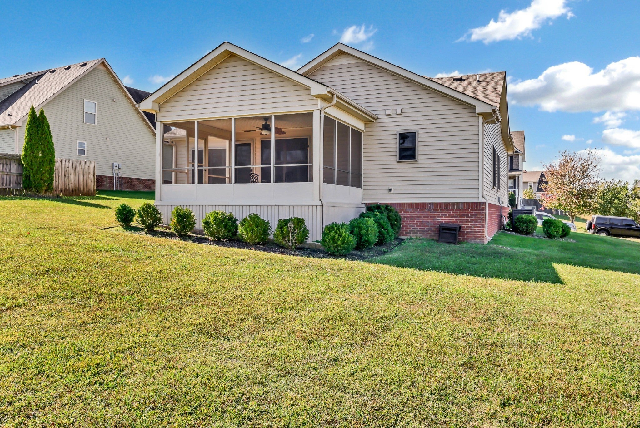 Welcome to this charming 3-bedroom, 2-bath home featuring a spacious's bedrooms and a large bonus room over a two-car garage. Step inside to find gorgeous wood flooring throughout the downstairs and a cozy living room that opens to a stunning eat-in kitchen complete with tiled backsplash, crown molding, and a pantry. Enjoy relaxing evenings on the screened-in back deck with a ceiling fan, perfect for Tennessee summers! The primary suite offers a serene retreat with a push-out window for extra space, a double vanity, and a large walk-in closet. This home also includes a new water heater, HVAC (1 year old), microwave, stone steps, insulated attic doors, plantation shutters, and custom built-in cabinetry for added storage. Le creme satin screen doors. Garage is equipped with a storm shelter. Come see why this home checks all the boxes. Style, comfort, and functionality all in one beautiful package!
