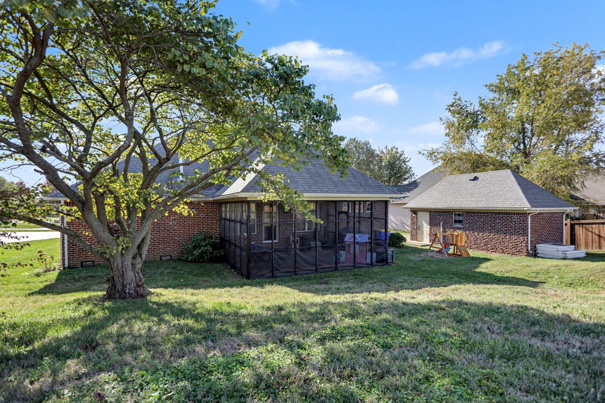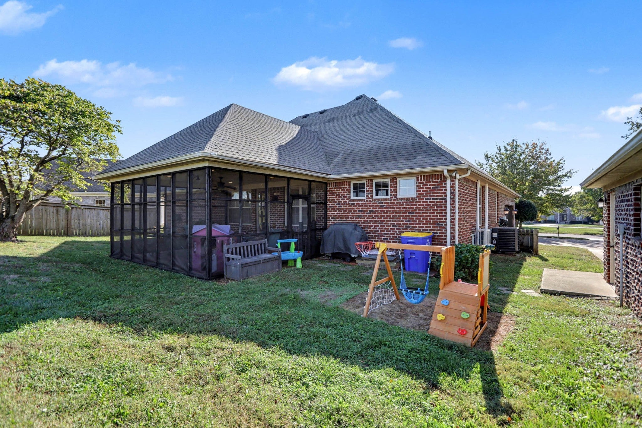 NEW or NEARLY-NEW everything. Within the last 5 years, the sellers have replaced the roof on both the house and garage; the main level central heat and air; they added a second heat & air unit for the upstairs; plus, the house is turnkey with a new dishwasher, stove, garbage disposal, refrigerator, washer & dryer, and ceiling fans. Perched on a pleasant lot overlooking a peaceful loop, this beautiful, all-brick home features voluminous spaces, sparkling hardwoods, and newer big-ticket components. Substantial double doors off of the covered front porch are stylish and hint at the style and ambiance of this fine home. A gorgeous new fireplace with a rock wall & new mantle and reflective firebox is vented and anchors the spacious living room. The kitchen features an abundance of counterspace and cabinetry as well as a sizable breakfast nook. The formal yet open dining room is perfect for entertaining. Take in the gorgeous sunsets from your screened-in back patio. Retreat to the privately located owner's suite with a huge walk-in closet and spa-like bath. Owner-suite dimensions in a second bedroom makes it a perfect room for guests. Enjoy crafting in the recently added hobby room with built-in bookshelves, or set up a home office or media room in the spacious bonus room above the 2-car garage. There is even more tinkering and storage space in the nicely-done detached garage with nice stairs to the loft storage. The sellers love this neighborhood and the grassy area in the loop where you can toss ball, chip, or watch the kids play. This home and area have so many great features.