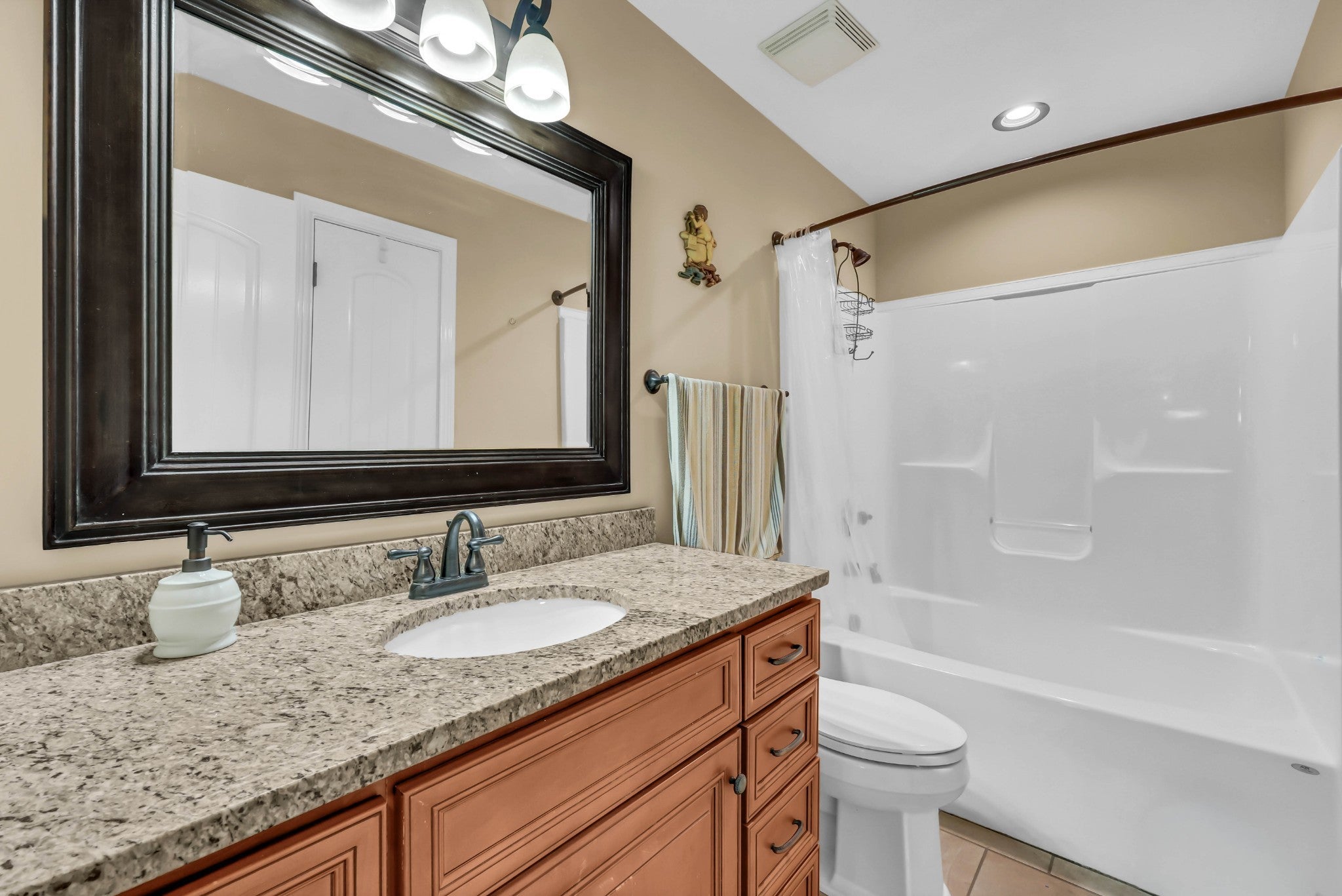 Welcome to this beautiful all brick and stone home perfectly positioned in a quiet cul de sac in a desirable neighborhood. Exceptional craftsmanship, curb appeal, and quality finishes make this home truly stand out. The exterior showcases professional landscaping, stone detail, custom lighting, flood and soffit lights, and a sidewalk that connects the covered front porch to the covered back porch and deck—perfect for relaxing or entertaining outdoors. Inside, you will find elegant tile and hardwood floors throughout with no carpet, grand eight foot doors, and an open layout filled with natural light. The kitchen features granite countertops, under cabinet lighting, a gas stove, and seamless flow to the dining and living areas. Granite continues in the bathrooms and laundry room, which also includes a convenient wash sink. Each bedroom is equipped with recessed lighting and ceiling fans for year-round comfort. The home is wired for a music and intercom system, a First Alert alarm system, and includes emergency lighting for added peace of mind. The primary suite offers a jacuzzi hot tub, and the spacious bonus room features a wet bar ideal for entertaining or relaxing. With full brick and stone construction and no vinyl, every detail reflects quality and timeless design.