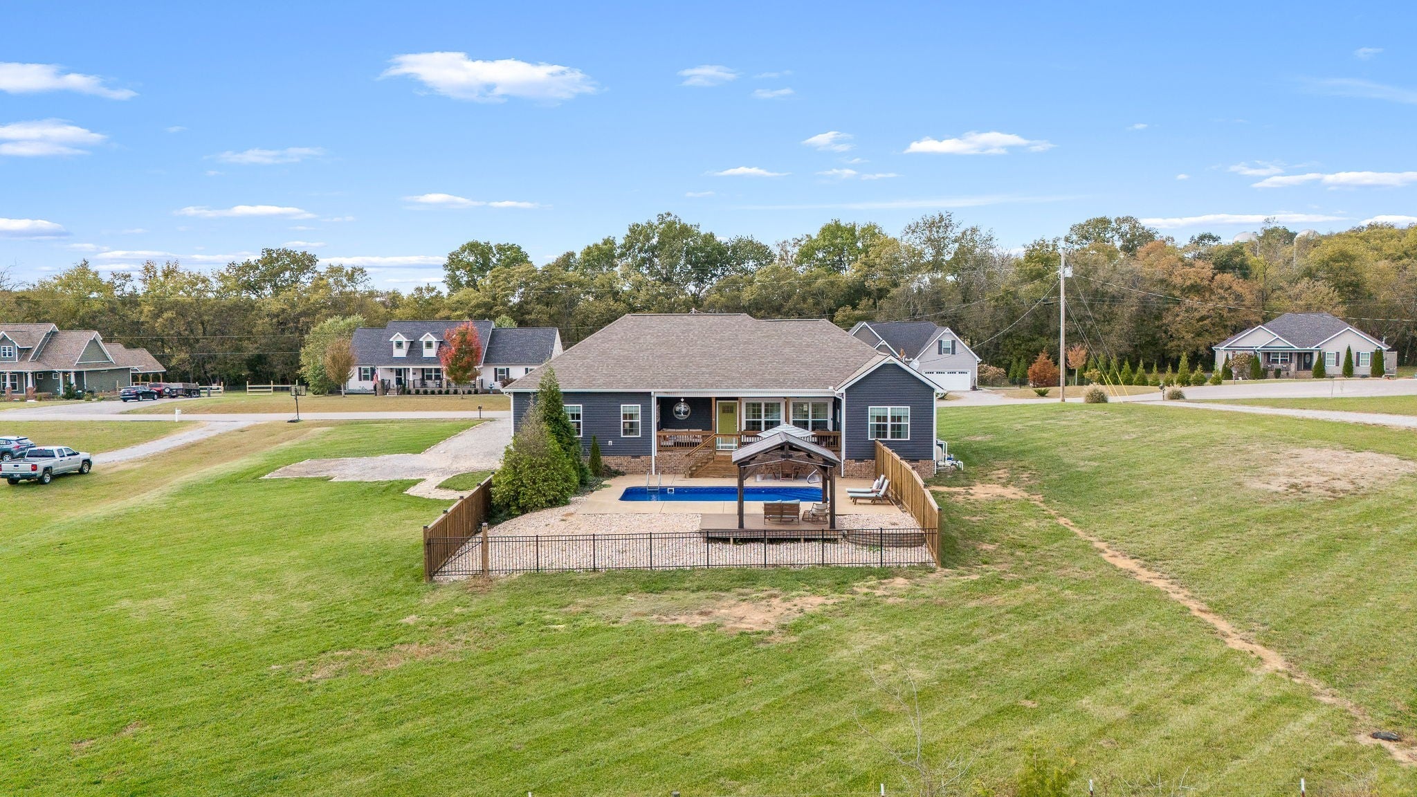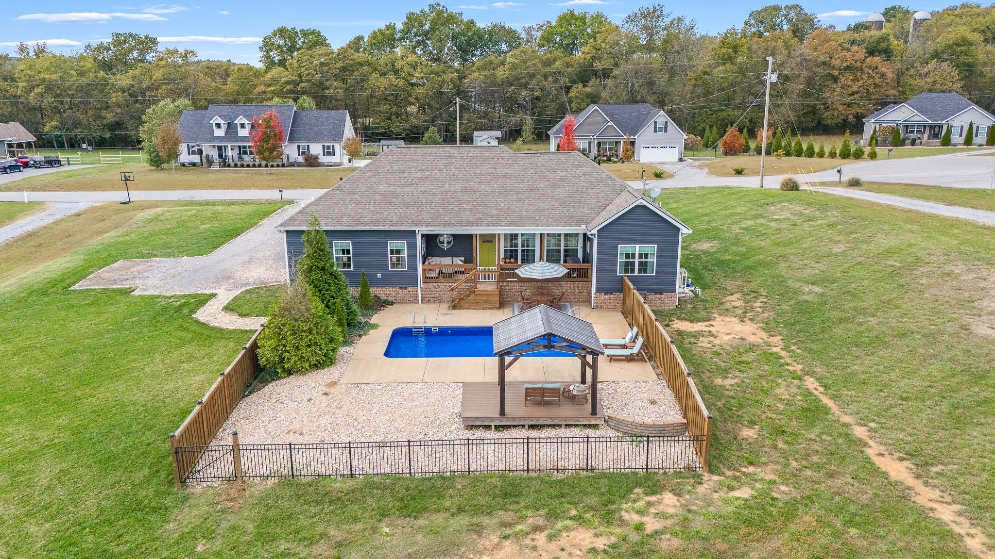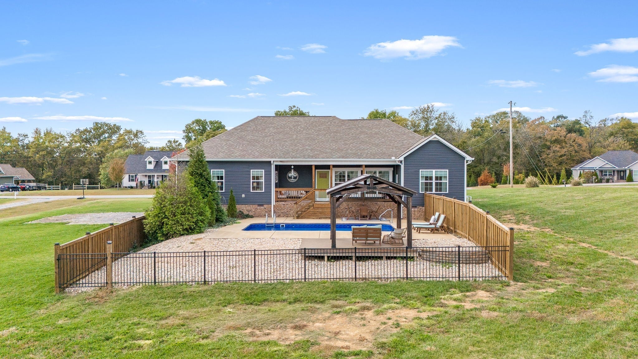 Custom-Built One-Level Home on Over an Acre with Scenic Views. Welcome to this beautifully maintained, custom-built one-level home offering peaceful views and thoughtful design throughout. Situated on a spacious 1.04-acre lot, this 3-bedroom, 2-bath residence features an open-concept floor plan perfect for both everyday living and entertaining. The inviting interior showcases hardwood and tile flooring, a stylish island kitchen with granite countertops, tile backsplash, and gas range, and abundant natural light. The primary suite is a true retreat, complete with a spa-like bathroom featuring a soaking tub, separate shower, and double vanities. Enjoy outdoor living on the covered front and back porches overlooking the fenced backyard, complete with an in-ground saltwater pool, gazebo, and room to relax or entertain. Additional highlights include a heated and cooled two-car garage, United Fiber internet availability, and quality craftsmanship throughout. Conveniently located just minutes from the interstate for easy commutes to Murfreesboro, Shelbyville, and Tullahoma, and close to the bypass for added accessibility—this home offers the perfect blend of comfort, privacy, and convenience.