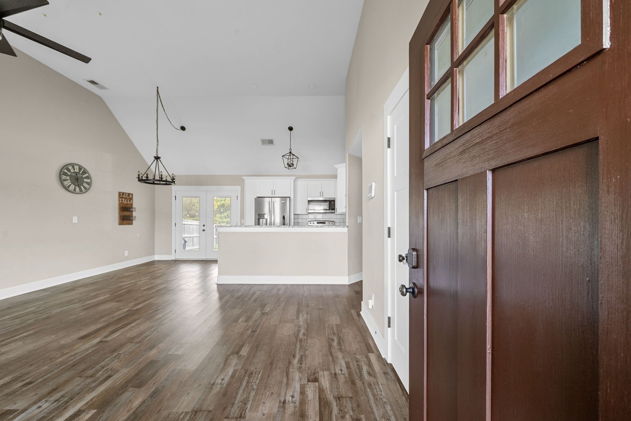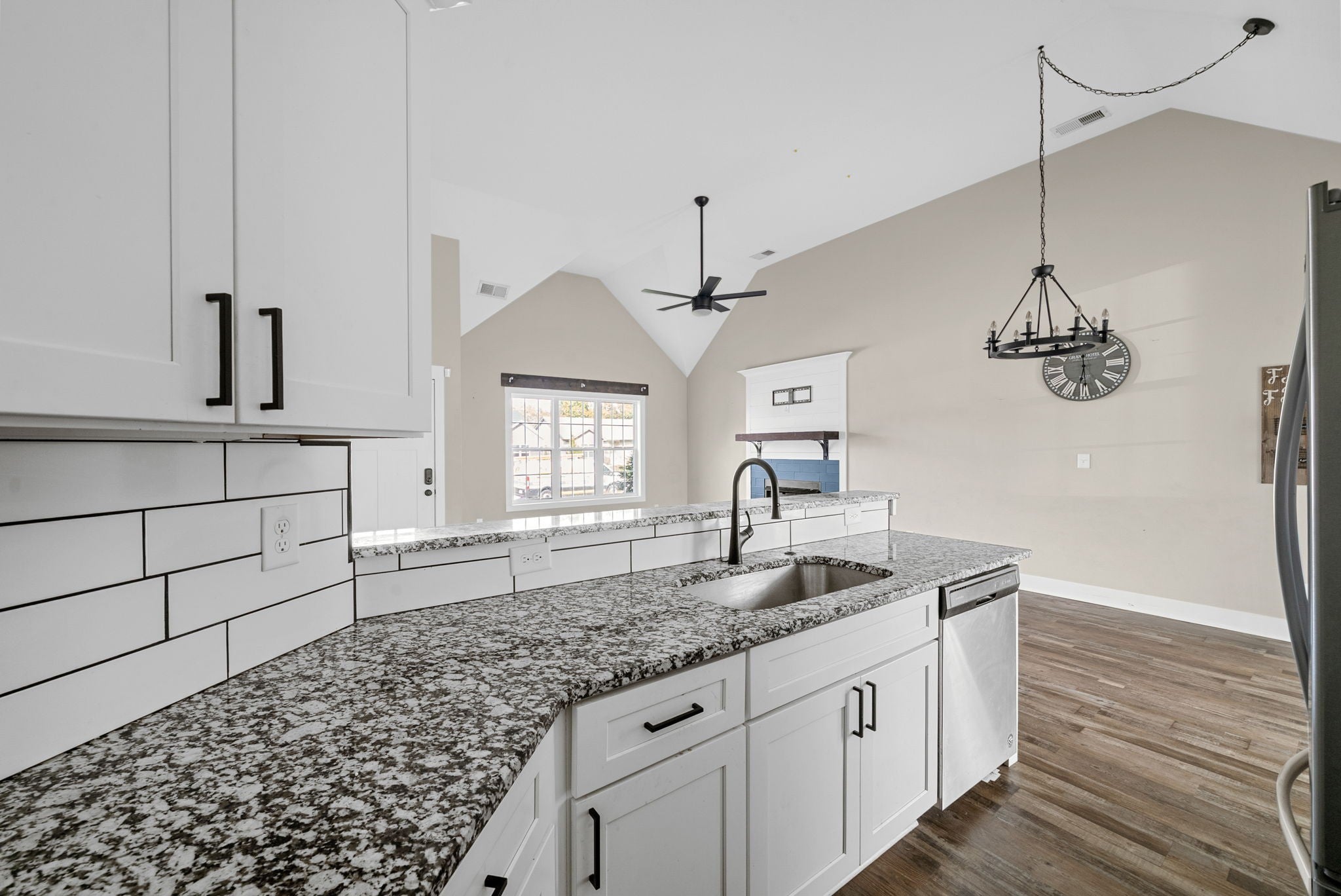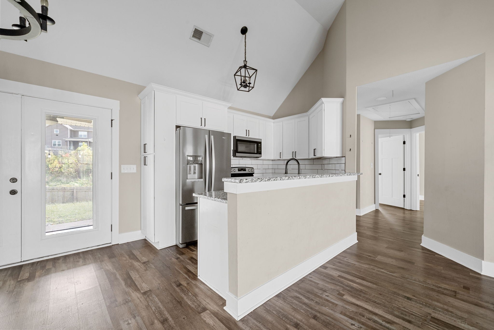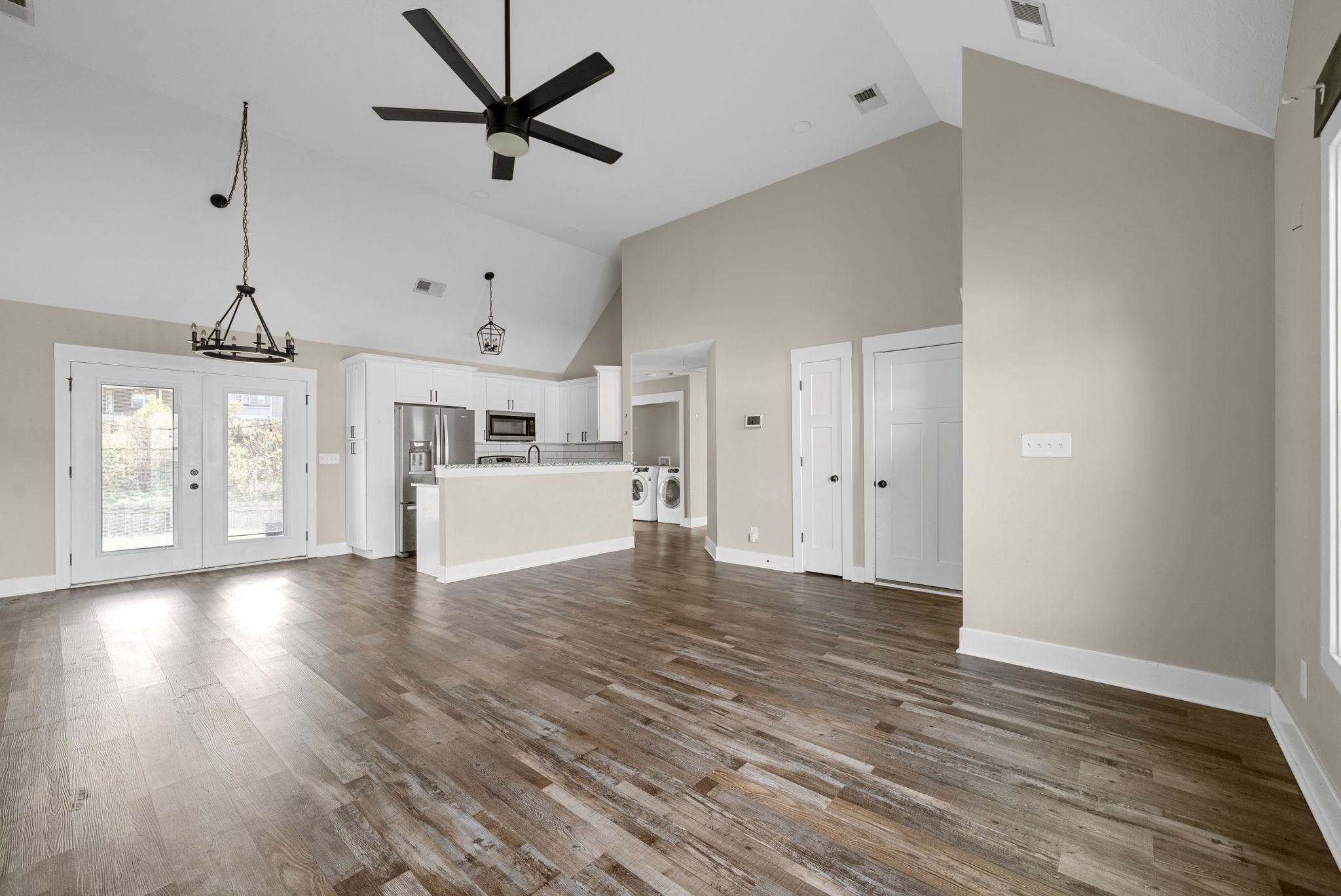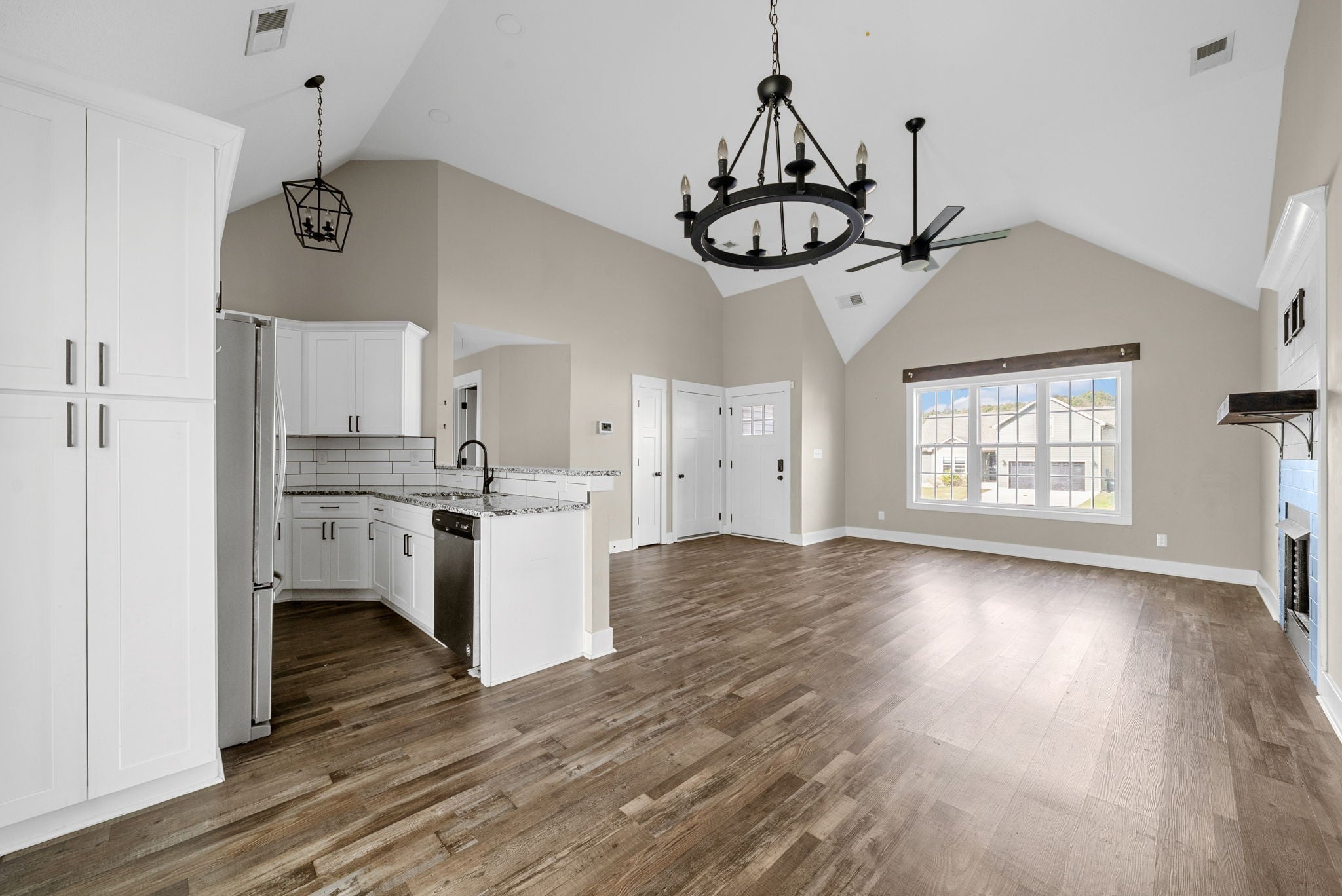 This beautiful home offers an open floor plan with high ceilings and LVP flooring through the main living areas and primary bedroom. The primary suite is a great place to unwind, featuring a soaking tub, walk-in shower, and double vanities. The living room feels warm and welcoming with a cozy fireplace. The kitchen has soft-close cabinets and plenty of space to gather with family and friends. Step outside to a fenced backyard with a covered patio and easy upkeep. With the washer and dryer included, this home is move-in ready!
