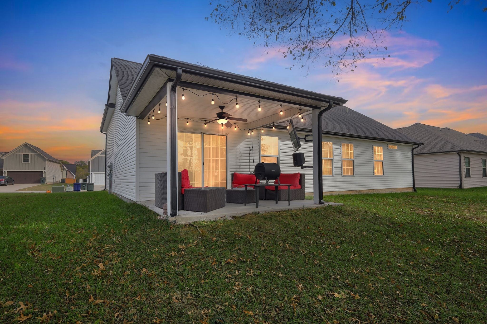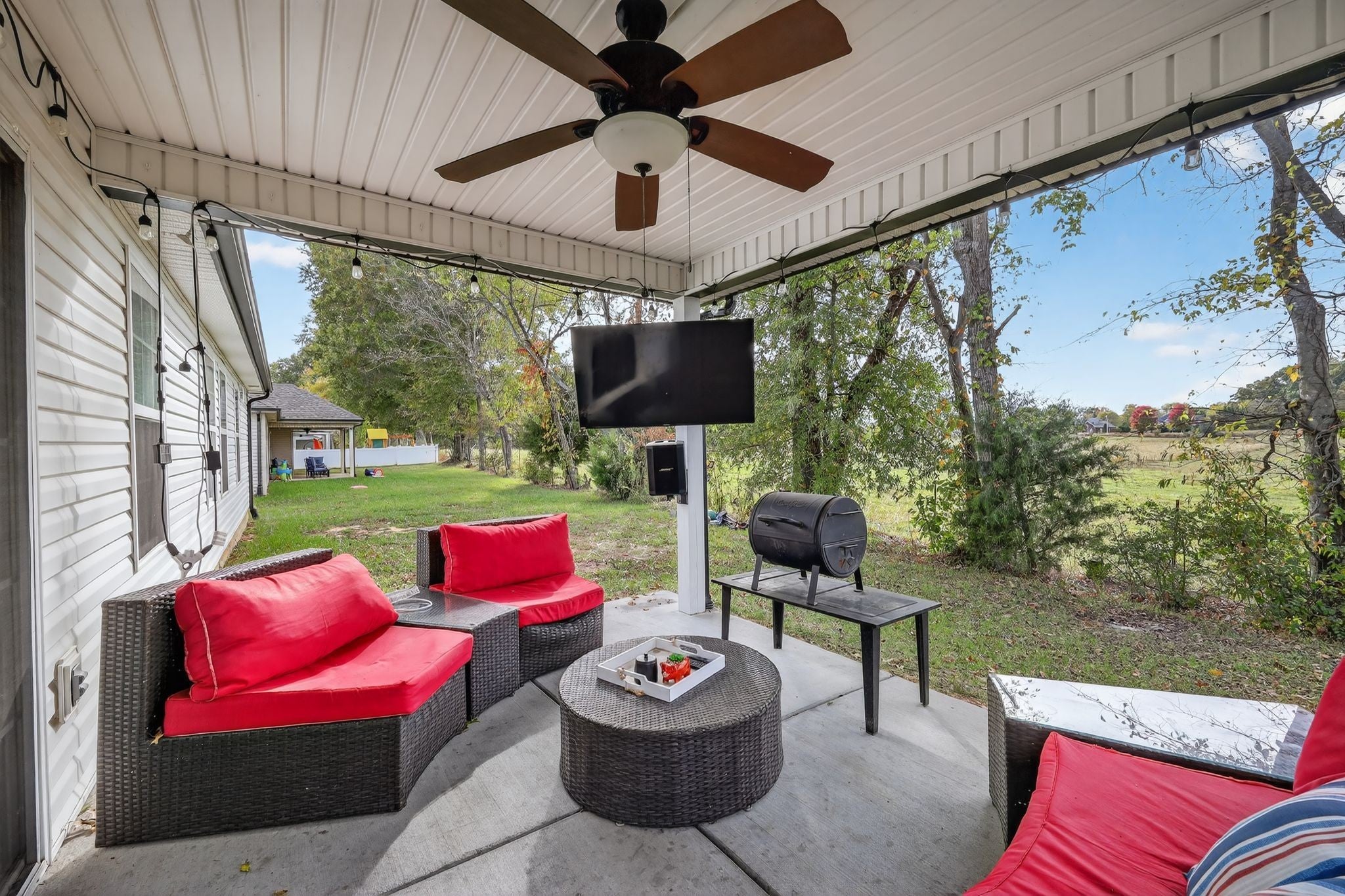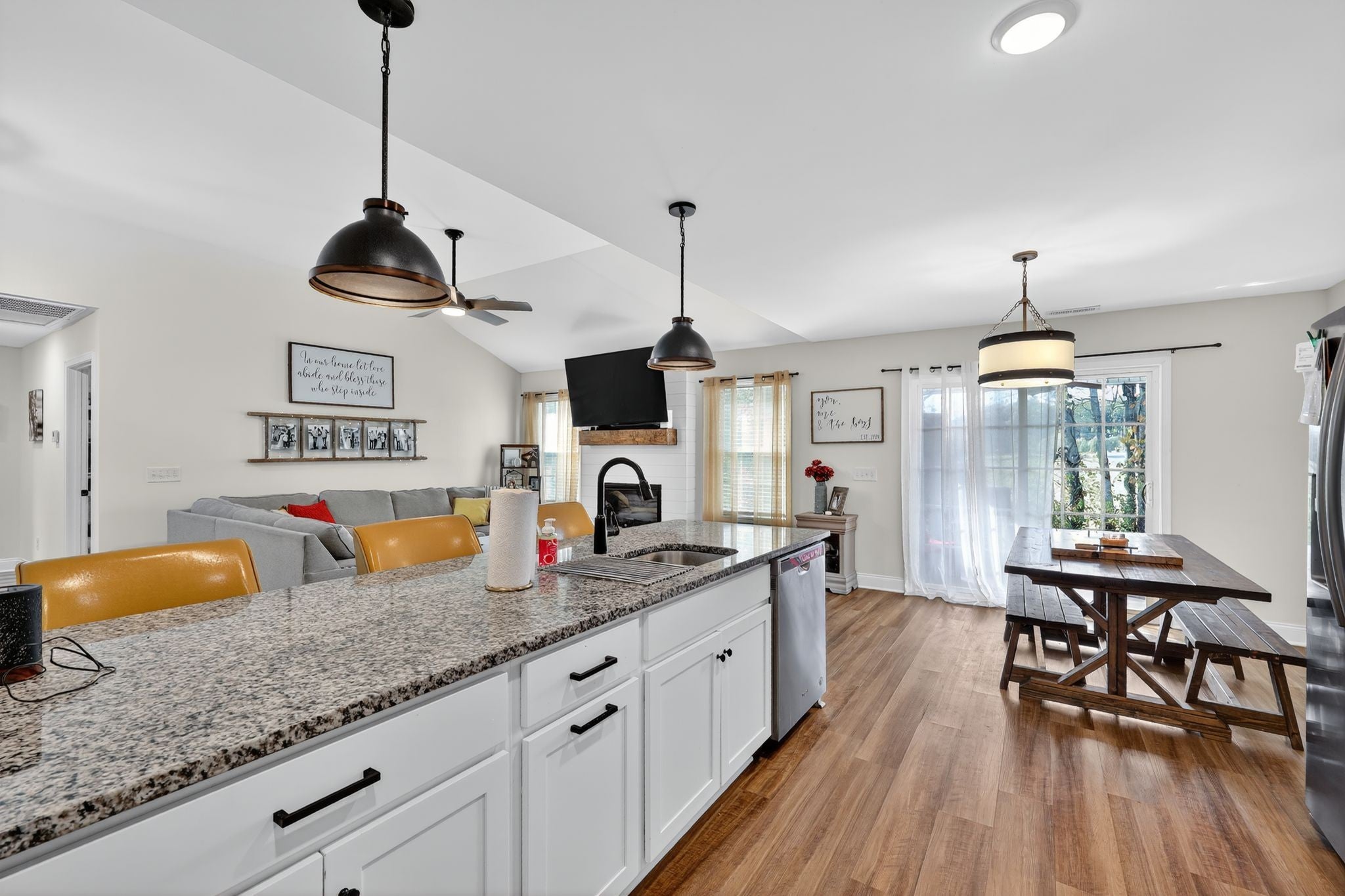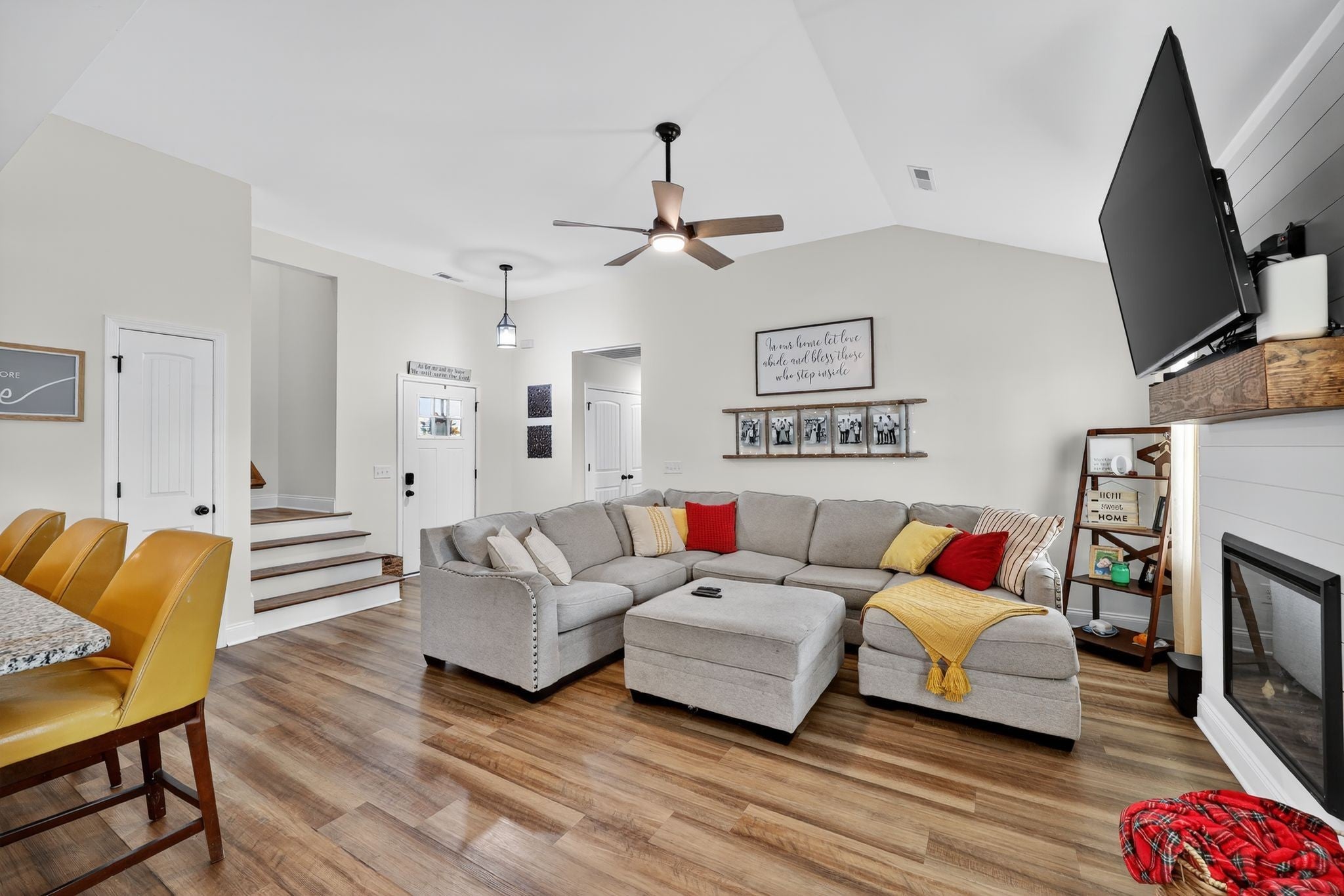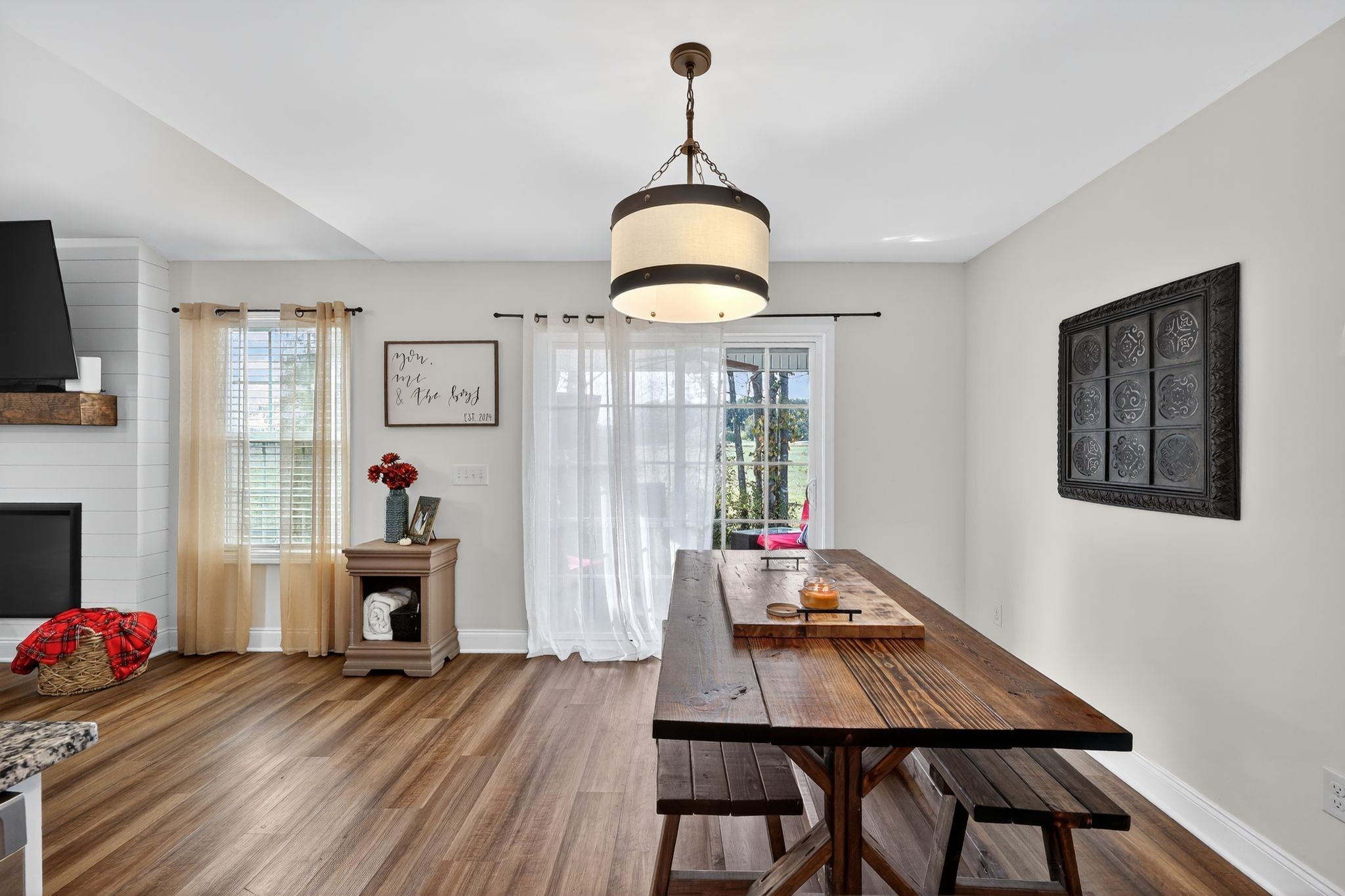 Fantastic opportunity to own lovely & light filled 4 bedroom, 2.5 bath home in the desirable Oakland Farms subdivision! Safely tucked away on a sunny lot in a quiet neighborhood across from the Legacy Golf Course, this home will leave you wanting for nothing! Spacious and open concept floor plan features light & bright living room w/charming shiplap fireplace, & lovely LVP flooring throughout! Kitchen features granite countertops & stainless steel appliances. Main level primary suite features walk in closet & private bath w/double vanity and modern tile shower. Upstairs offers a sizeable loft style bedroom and/or recreational room with half bath. Backyard features serene views via large covered concrete patio w/mounted TV; perfect for gatherings and/or quality rest & relaxation. Property backs to a cattle farm with natural tree border, creating a peaceful country setting. Easy commute to Nashville and nearby plenty of amenities; Shopping, restaurants, schools, parks, & more! Welcome!