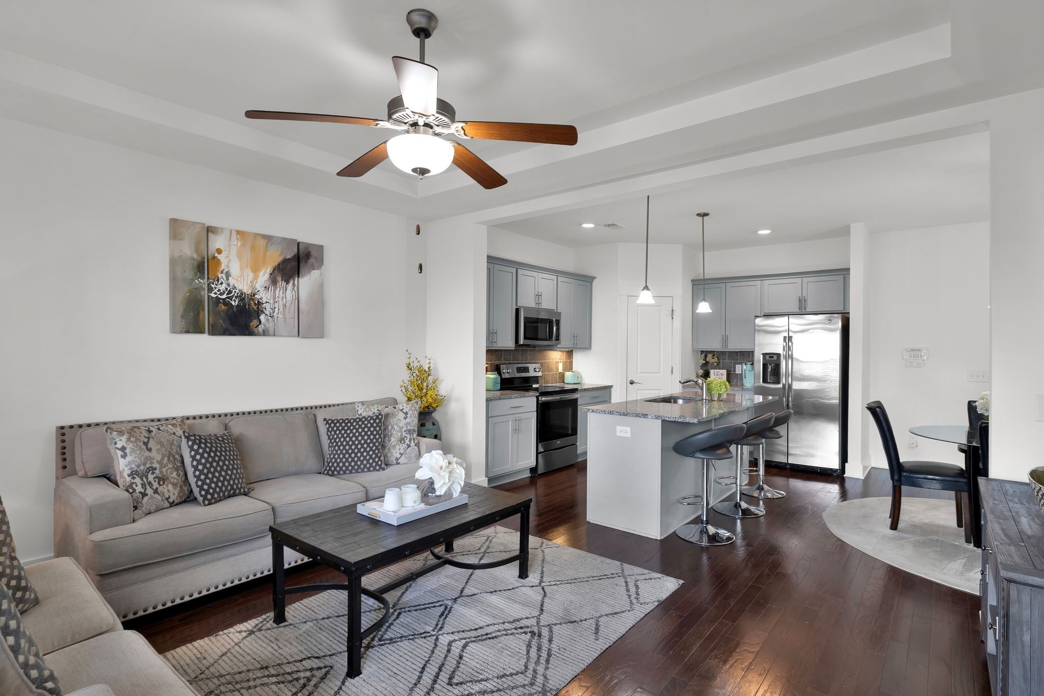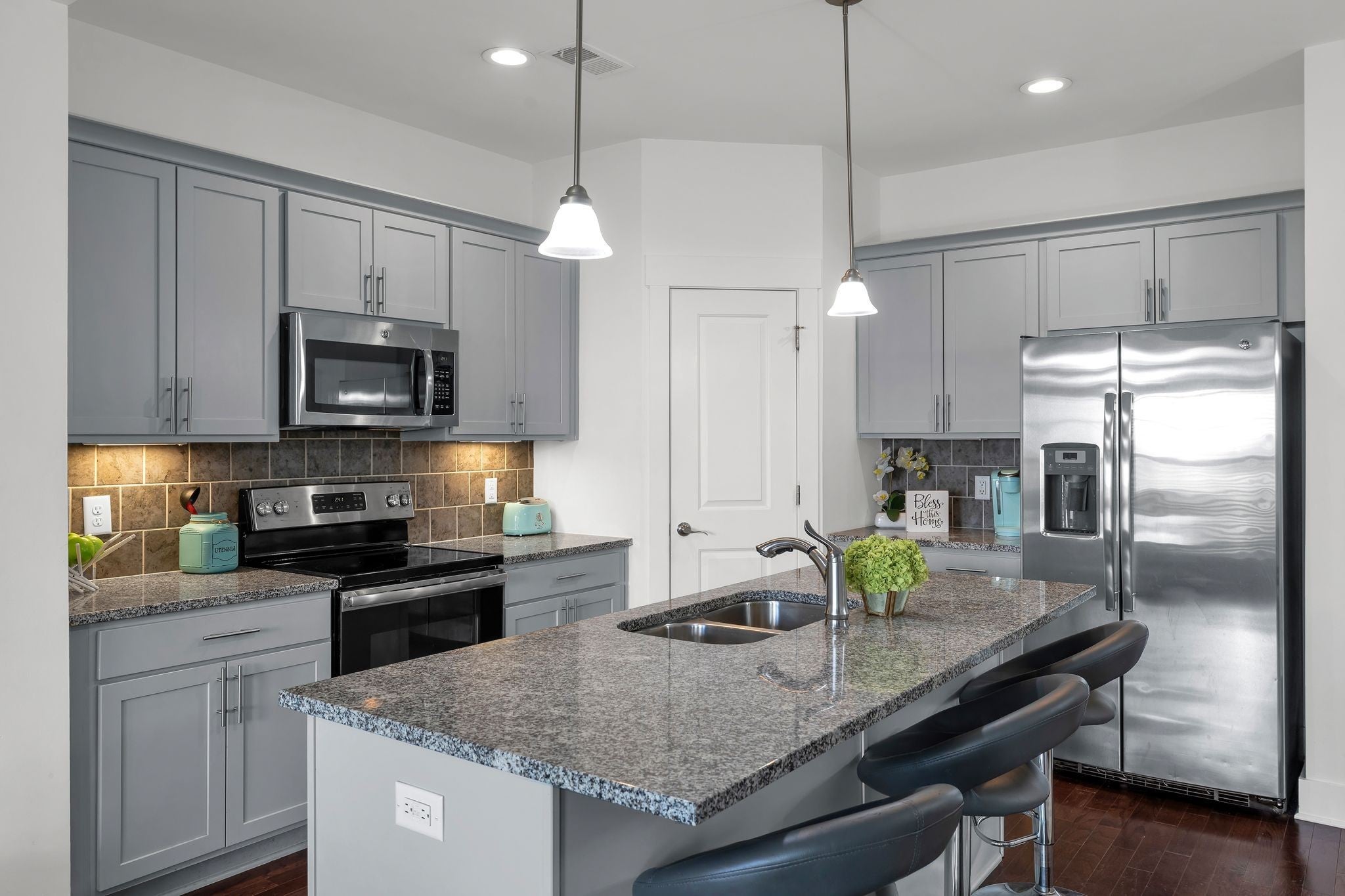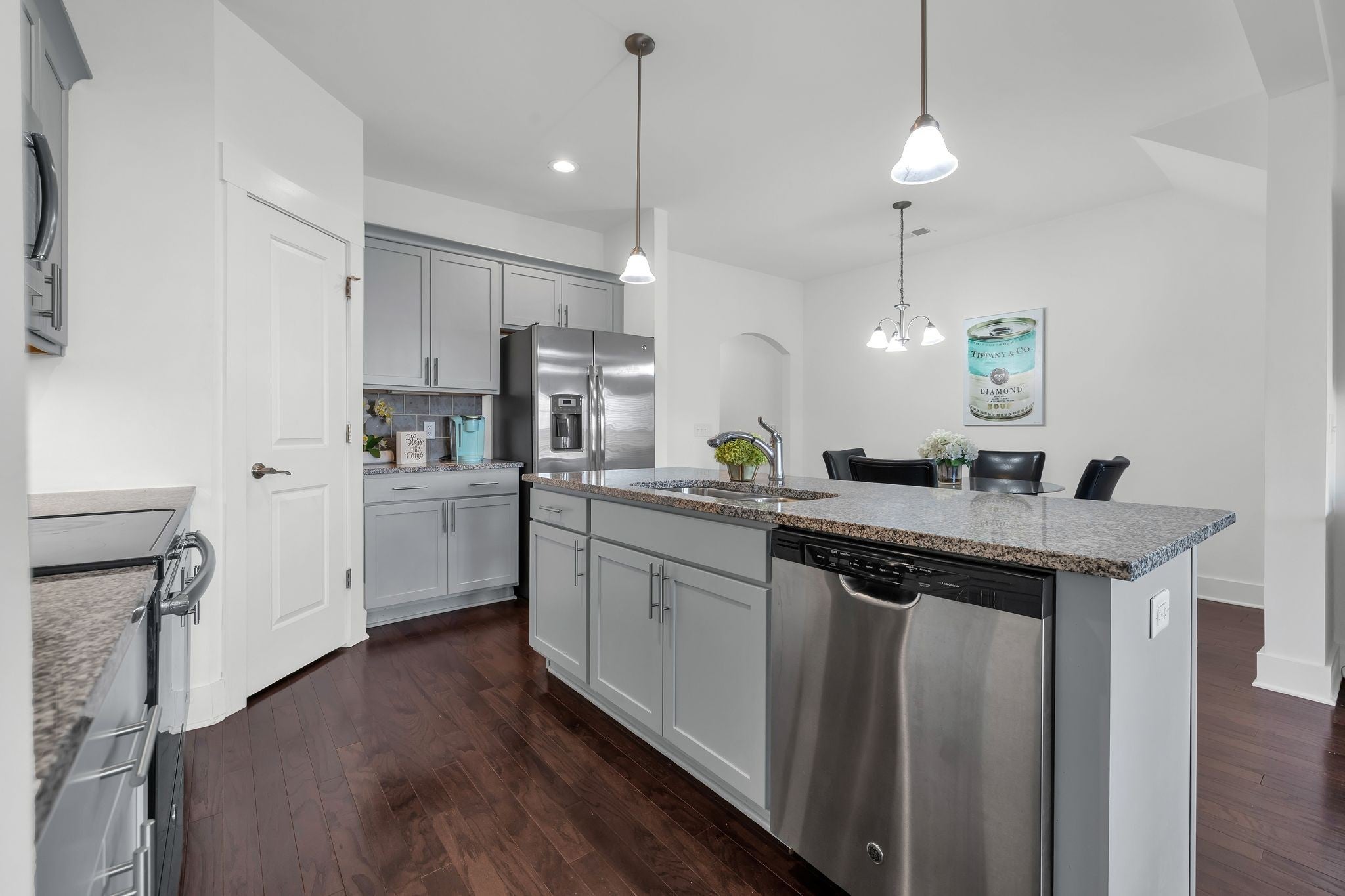 - Electric Range, Dishwasher, Microwave, Refrigerator, Stainless Steel Appliance(s)
