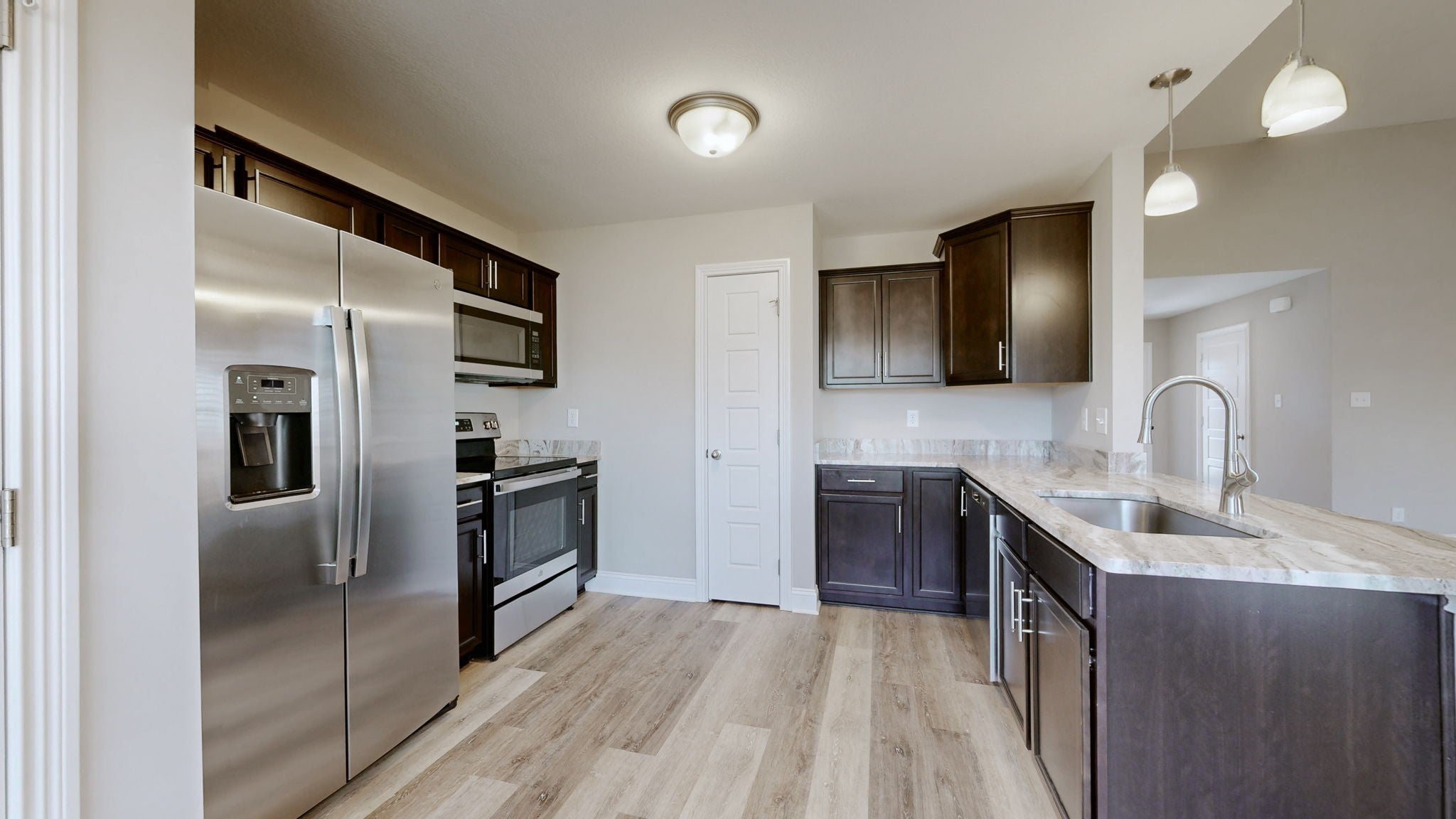 MOVE IN READY - only 3 years old! Freshly painted! Welcome to the Tucker Plan, a thoughtfully designed home that combines comfort, style, and functionality. The inviting entry foyer with a convenient coat closet leads into a spacious living room that seamlessly connects to the eat-in kitchen — perfect for both entertaining and everyday living. The kitchen features granite countertops, stainless steel appliances including the refrigerator, a pantry, and modern cabinetry that adds both beauty and practicality. The split-bedroom layout provides privacy, with the luxurious primary suite offering a walk-in closet and a double vanity in the bath. Secondary bedrooms are generously sized, ideal for guests, family, or a home office. Step outside to enjoy the back deck overlooking a peaceful preserve with no immediate rear neighbor, creating a relaxing outdoor retreat perfect for grilling or outdoor dining. Throughout the home, LVP, carpet, and tile flooring offer timeless appeal, durability, and easy maintenance. The finished 2-car attached garage provides ample parking and storage. The Tucker Plan delivers the perfect blend of modern design and everyday comfort. Just minutes from shopping and downtown, this home is ready for you to make it your own.