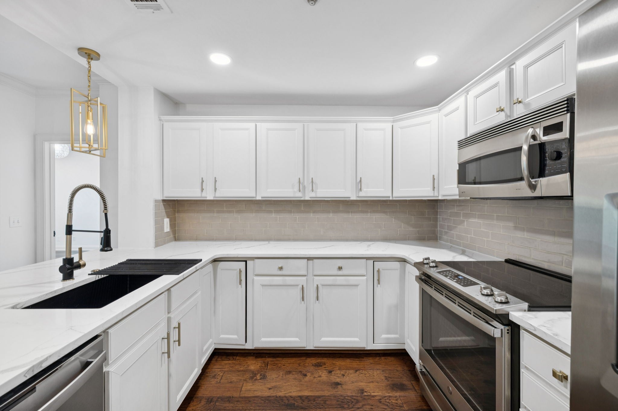 - Built-In Electric Oven, Electric Range, Dishwasher, Disposal, Dryer, Microwave, Refrigerator, Stainless Steel Appliance(s), Washer