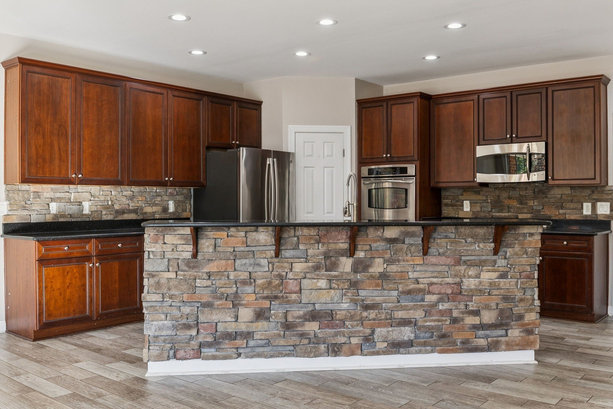 - Double Oven, Electric Oven, Cooktop, Dishwasher, Disposal, Microwave, Refrigerator, Stainless Steel Appliance(s)