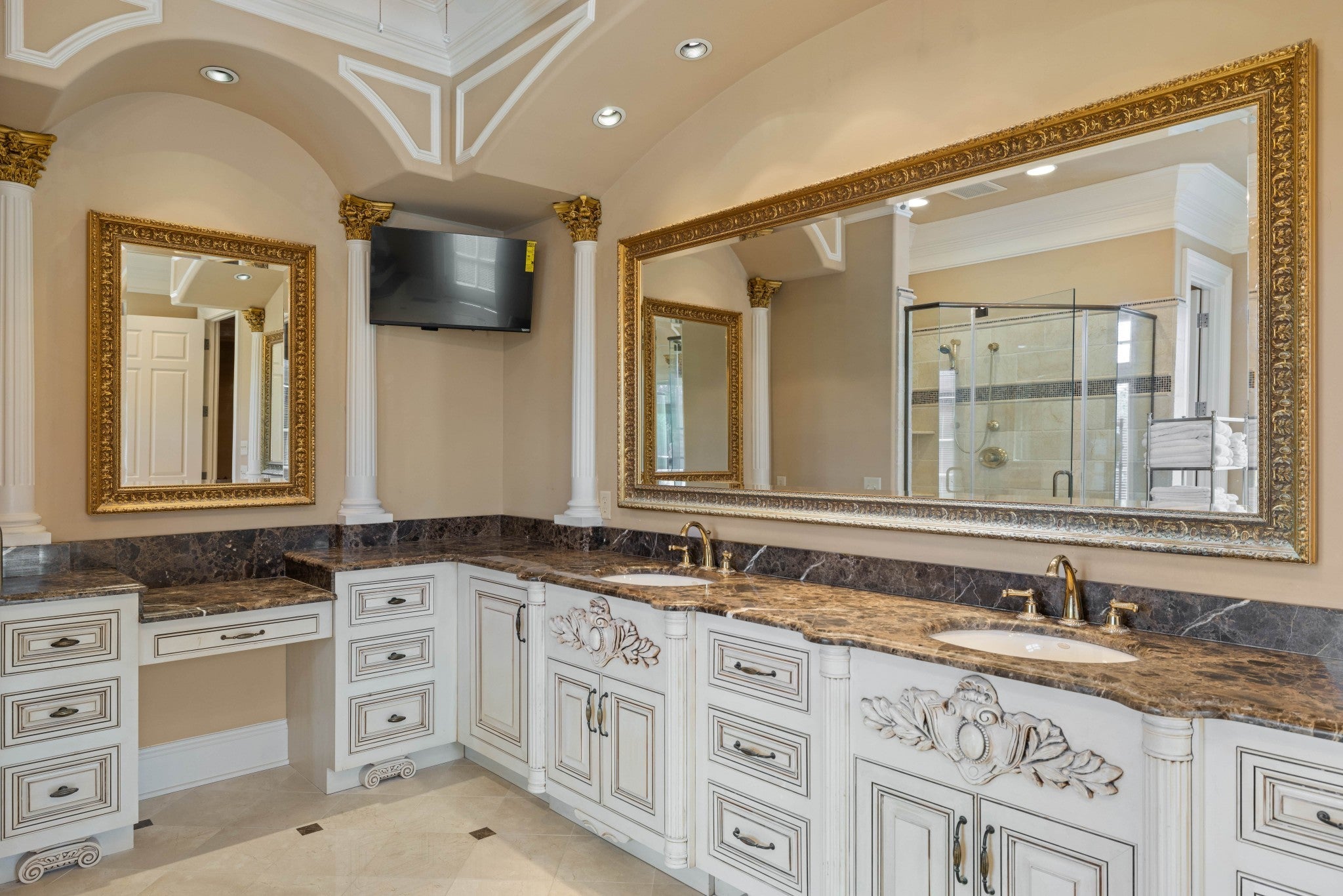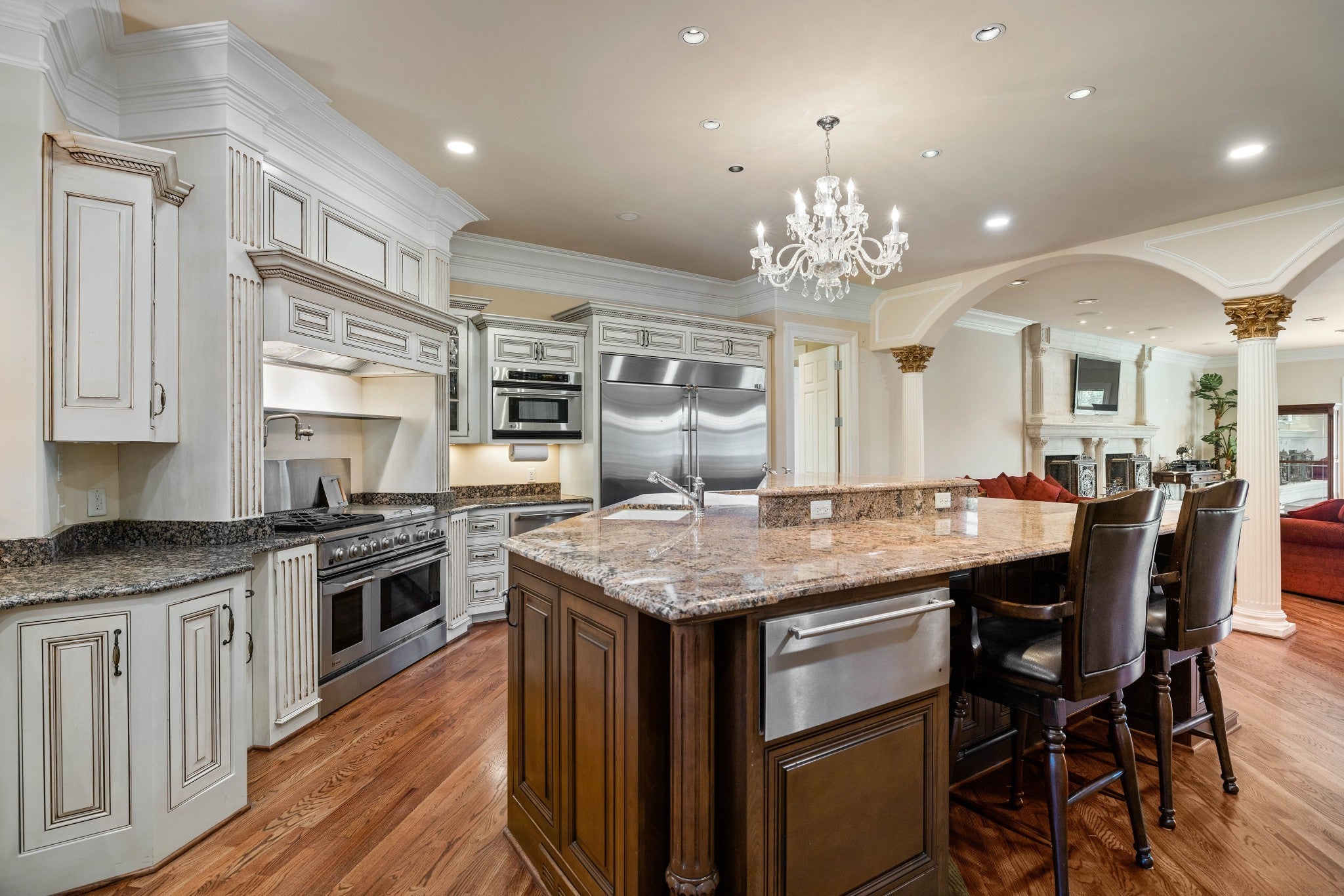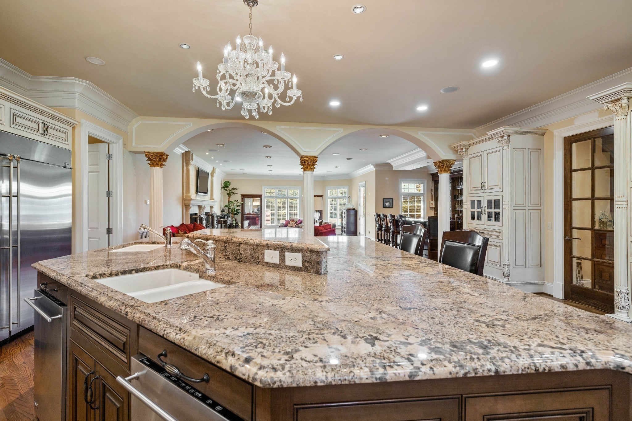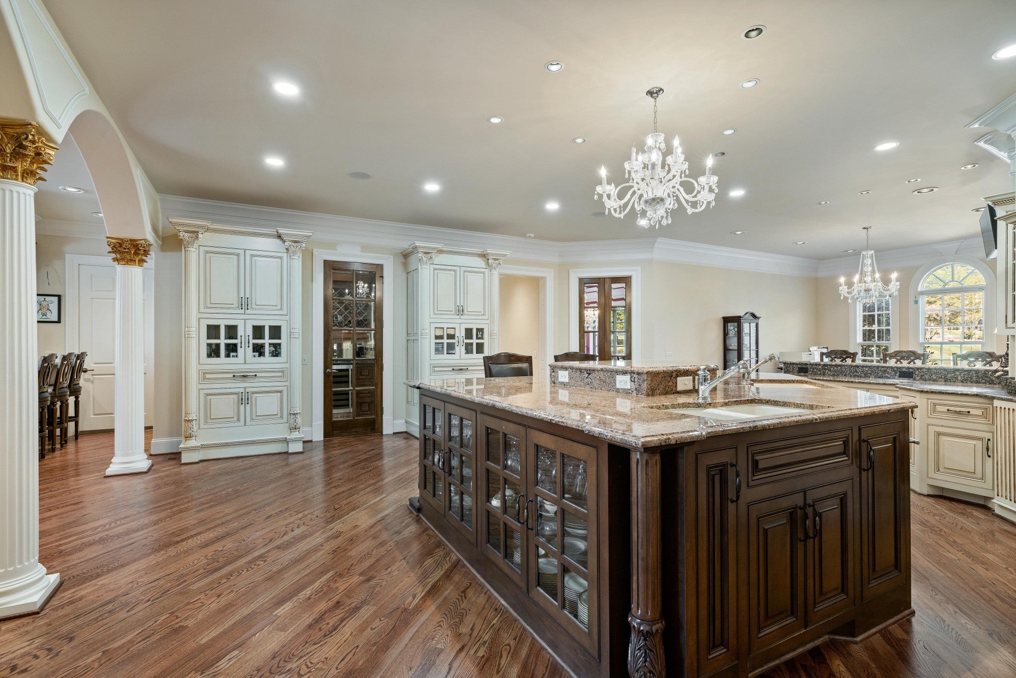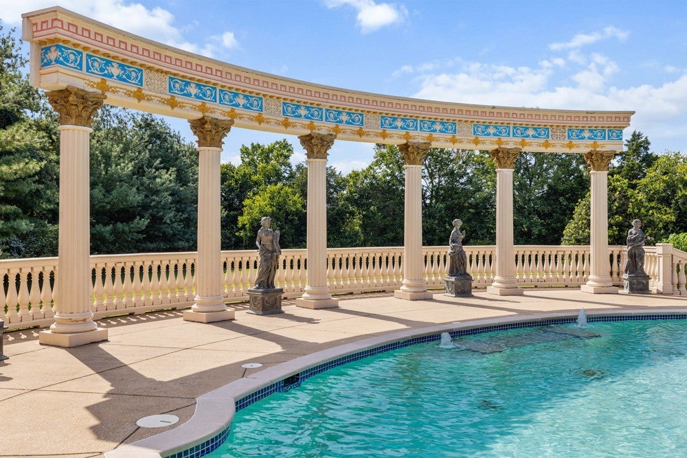 LUXURY ONLINE AUCTION: BID ENDS DEC16 @ 2:00 pm - Corinthian Estate - 6 Bedrooms | 12+ Baths | 13,730± Sq. Ft. | 2.56± Acres - A statement of timeless grandeur, Corinthian Estate stands as one of Brentwood’s most distinguished residences. Inspired by classical European design and crafted with exquisite attention to detail, this 13,730± square-foot masterpiece was built by a premier builder as his personal residence—reflecting a standard of artistry and integrity that few homes achieve. Every element of the estate showcases a devotion to quality, scale, and craftsmanship, while offering endless opportunities to tailor its grand spaces to a more contemporary vision. Upon entry, guests are welcomed by an ornate Waterford chandelier suspended beneath an elegant domed ceiling, setting a tone of timeless refinement. Rich African granite surfaces, intricate millwork, and Corinthian-style columns define the home’s architectural language—elevating every living and entertaining area. The layout flows effortlessly between formal living and dining rooms, eight fireplaces, and multiple bar and gathering areas, creating a seamless balance between warmth and grandeur. Each of the six en-suite bedrooms exudes luxury and privacy, including a spacious in-law suite and a dedicated maid’s quarters with a private kitchen—ideal for multigenerational living or extended guests. Modern conveniences abound, with two central vacuum systems, a circulating hot water system, a 12-camera security system, and an elevator providing effortless access to every level. Designed for both comfort and spectacle, Corinthian Estate also features a private theater room, exercise room, and a sun-filled solarium overlooking the outdoor entertaining area. Outside, a heated saltwater negative-edge pool, surrounded by custom colonnades and Corinthian columns, serves as the breathtaking focal point of the home—perfectly merging elegance with resort-style relaxation.