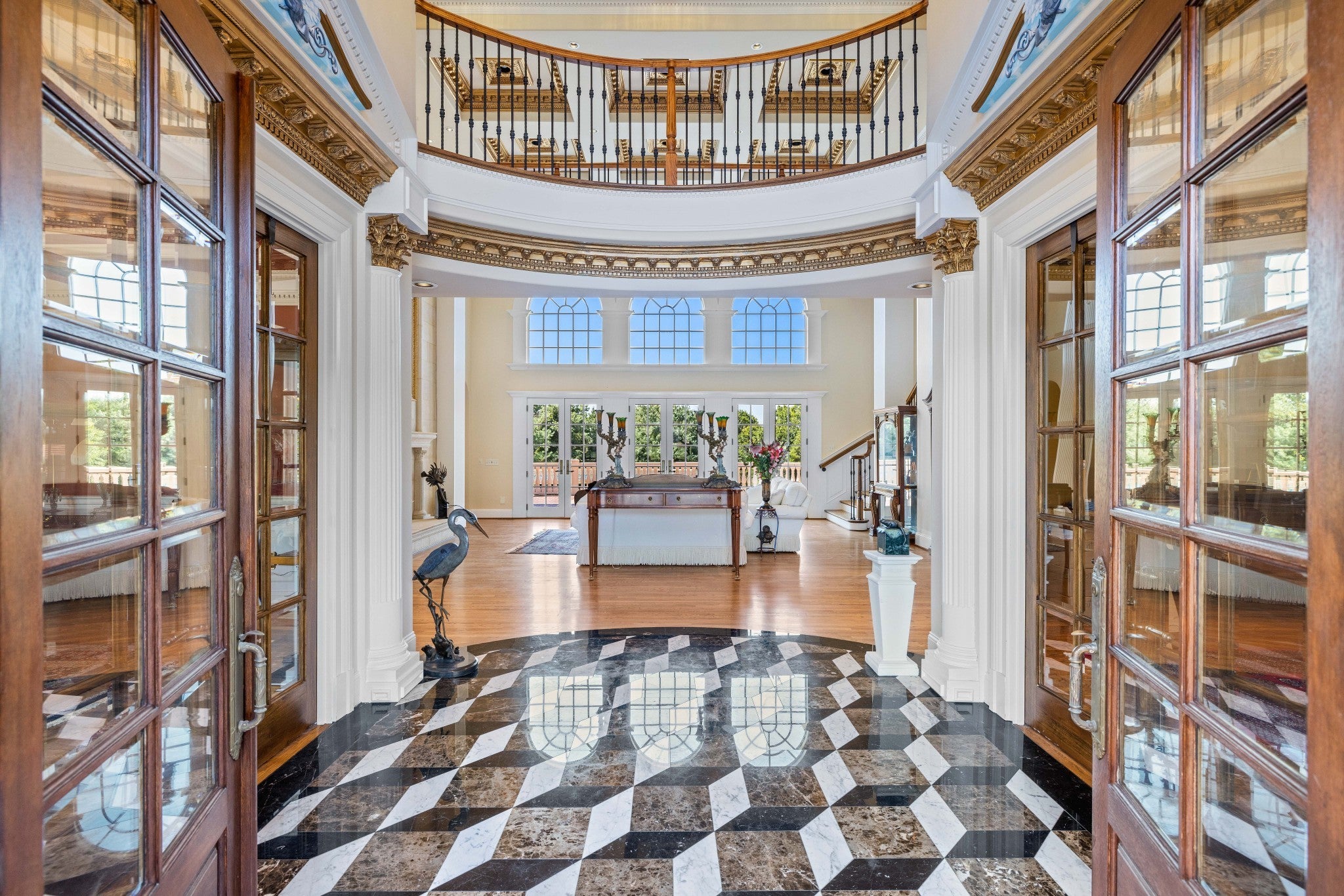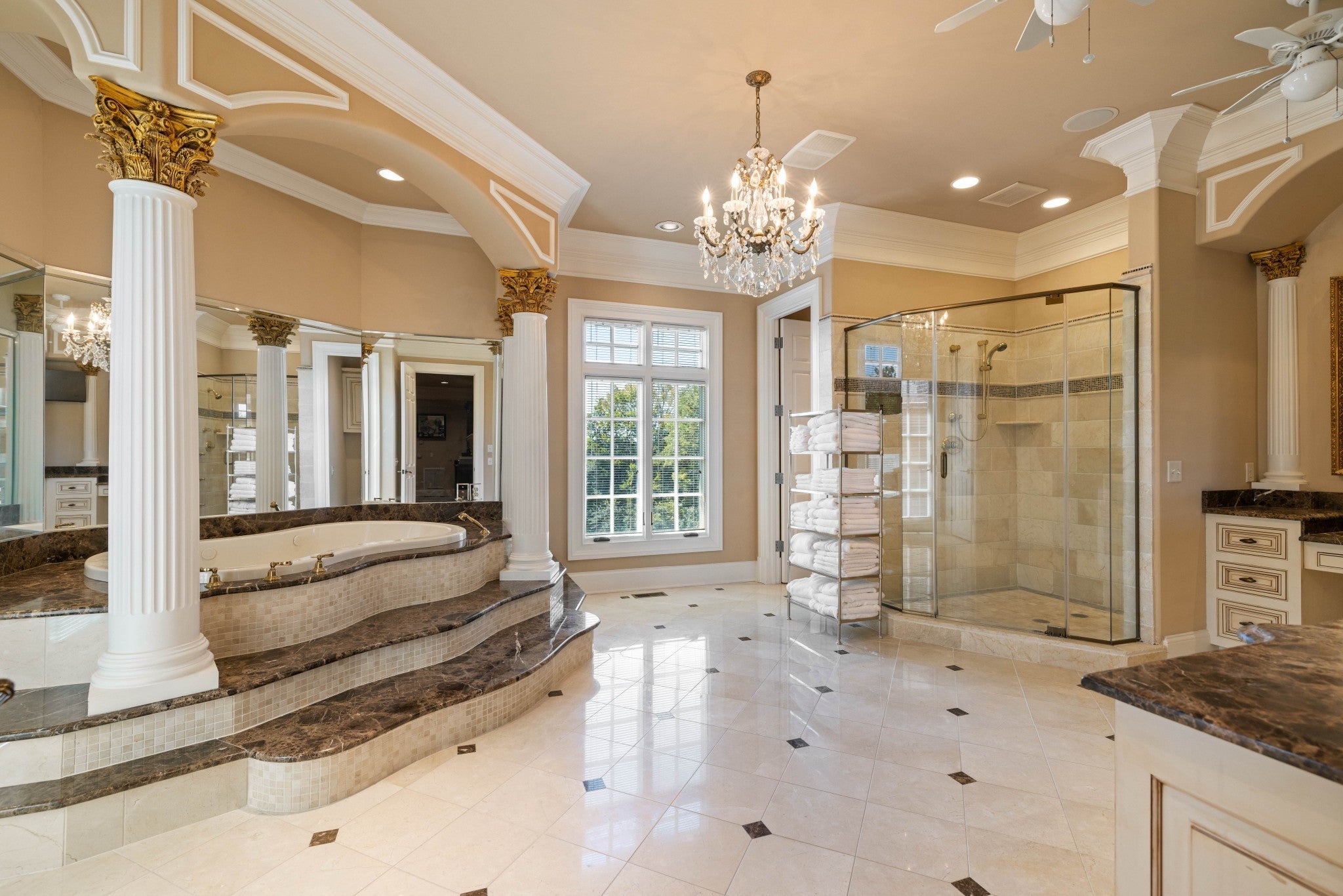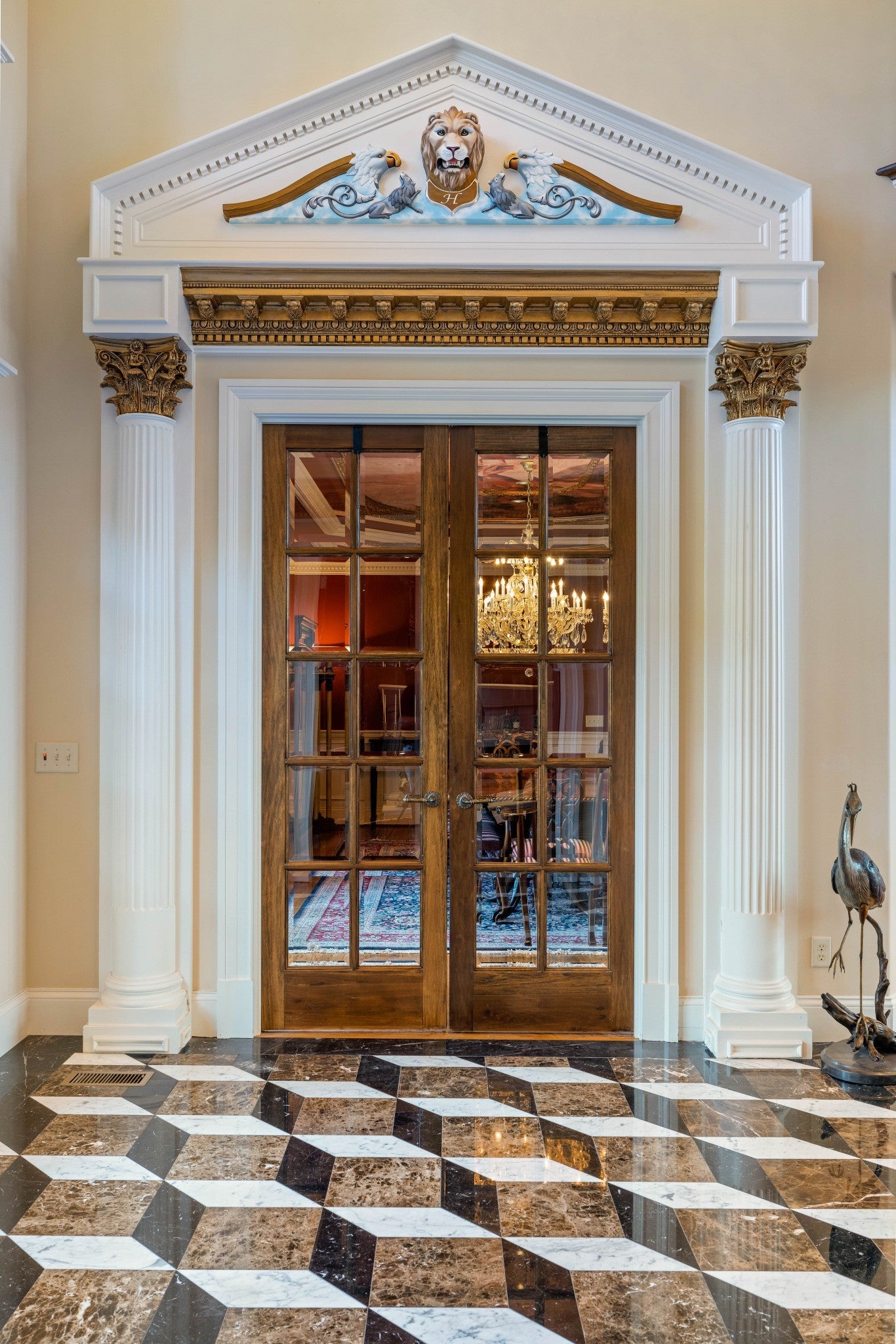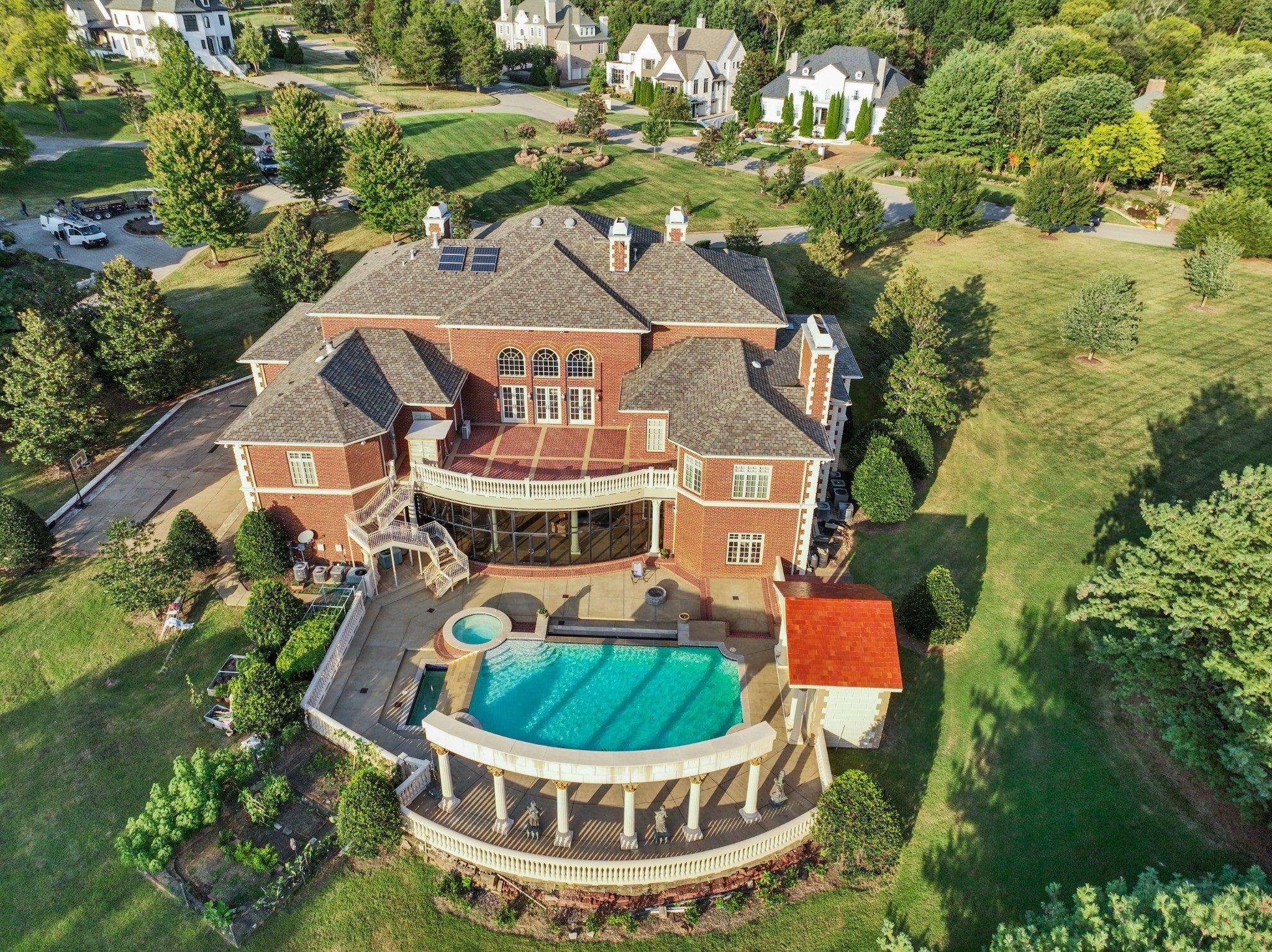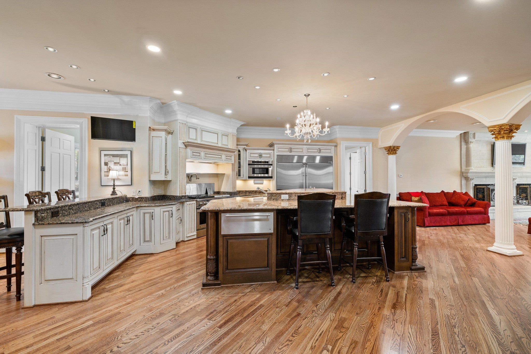 LUXURY ONLINE AUCTION: BID ENDS DEC16 @ 2:00 pm - Corinthian Estate - 6 Bedrooms | 12+ Baths | 13,730± Sq. Ft. | 2.56± Acres - A statement of timeless grandeur, Corinthian Estate stands as one of Brentwood’s most distinguished residences. Inspired by classical European design and crafted with exquisite attention to detail, this 13,730± square-foot masterpiece was built by a premier builder as his personal residence—reflecting a standard of artistry and integrity that few homes achieve. Every element of the estate showcases a devotion to quality, scale, and craftsmanship, while offering endless opportunities to tailor its grand spaces to a more contemporary vision. Upon entry, guests are welcomed by an ornate Waterford chandelier suspended beneath an elegant domed ceiling, setting a tone of timeless refinement. Rich African granite surfaces, intricate millwork, and Corinthian-style columns define the home’s architectural language—elevating every living and entertaining area. The layout flows effortlessly between formal living and dining rooms, eight fireplaces, and multiple bar and gathering areas, creating a seamless balance between warmth and grandeur. Each of the six en-suite bedrooms exudes luxury and privacy, including a spacious in-law suite and a dedicated maid’s quarters with a private kitchen—ideal for multigenerational living or extended guests. Modern conveniences abound, with two central vacuum systems, a circulating hot water system, a 12-camera security system, and an elevator providing effortless access to every level. Designed for both comfort and spectacle, Corinthian Estate also features a private theater room, exercise room, and a sun-filled solarium overlooking the outdoor entertaining area. Outside, a heated saltwater negative-edge pool, surrounded by custom colonnades and Corinthian columns, serves as the breathtaking focal point of the home—perfectly merging elegance with resort-style relaxation.