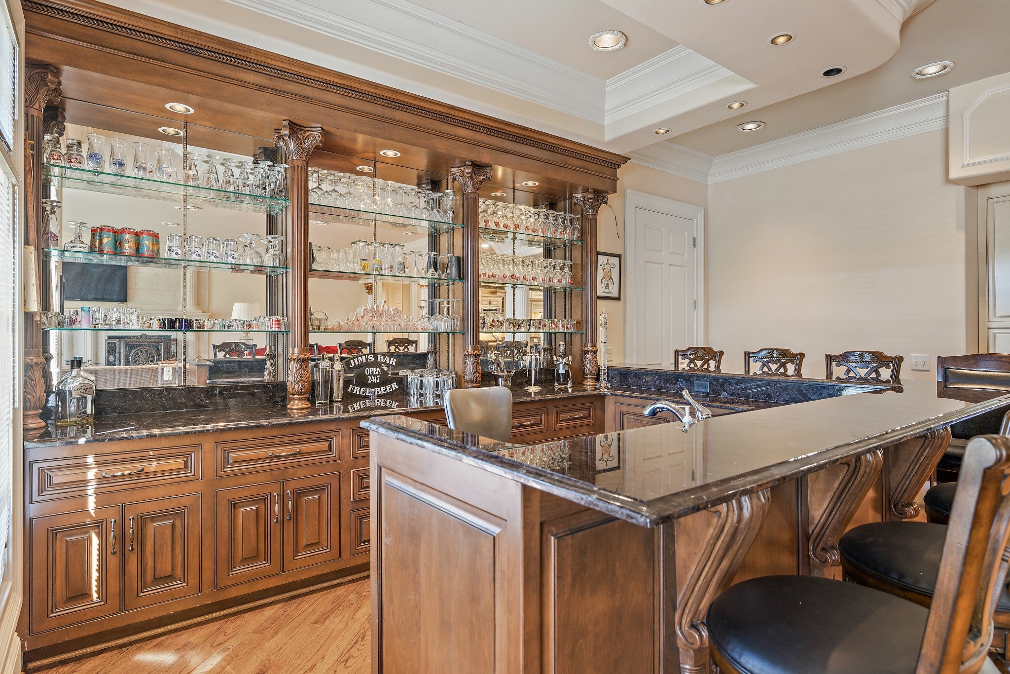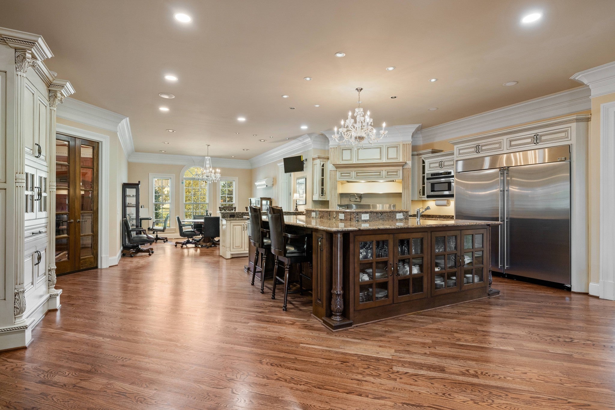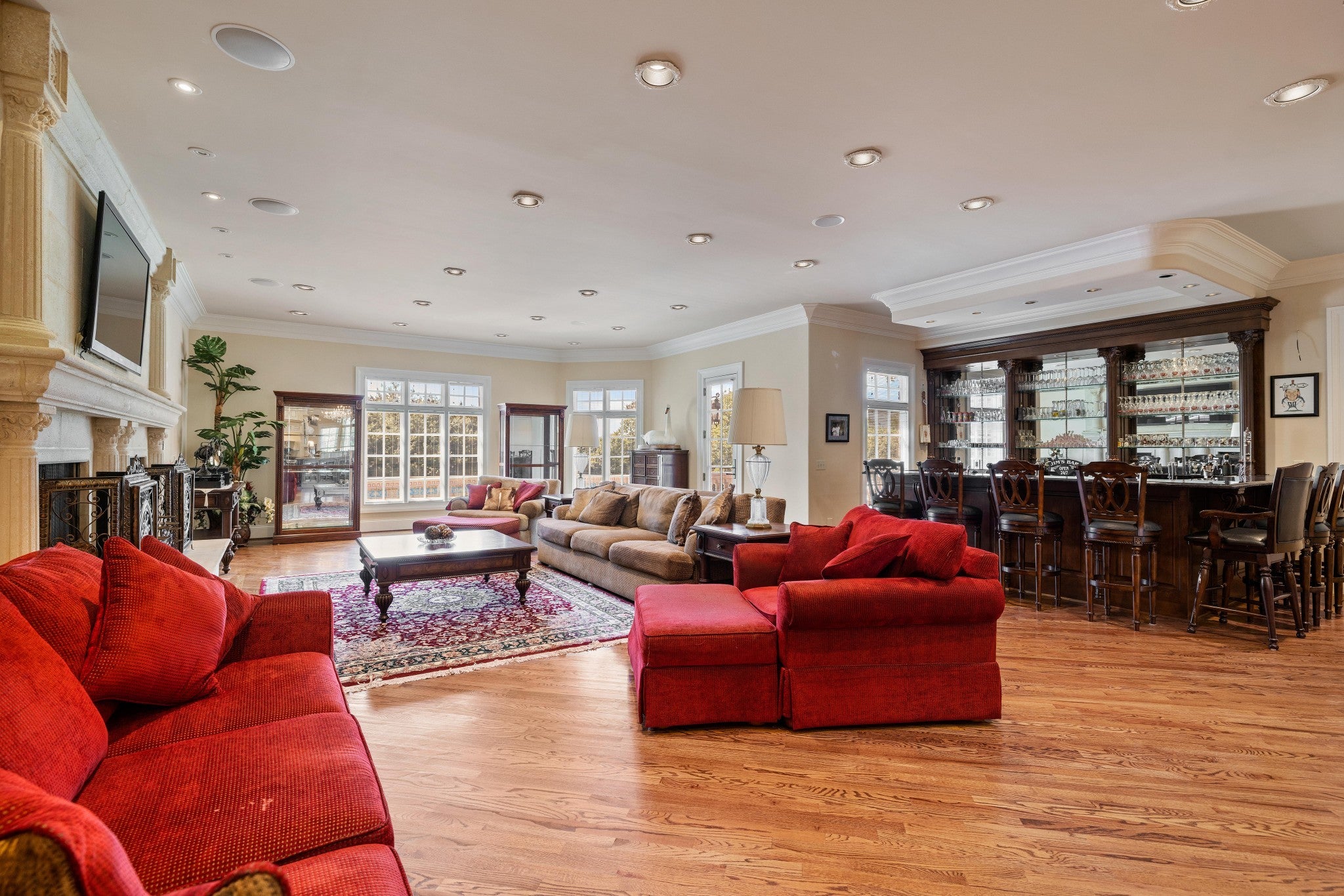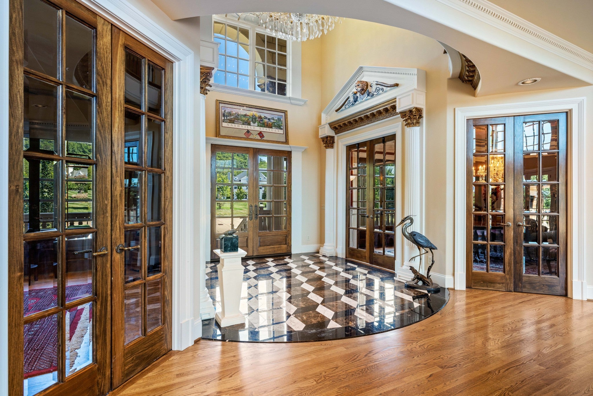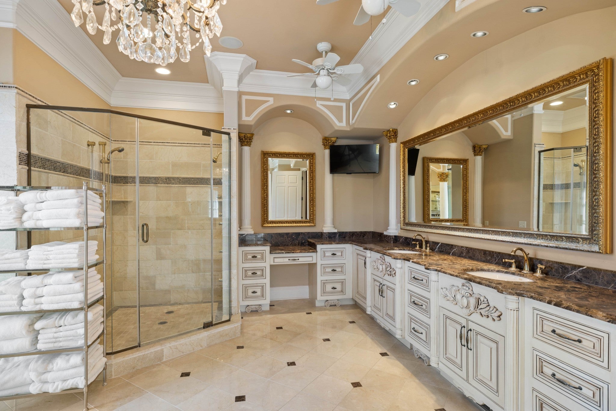 LUXURY ONLINE AUCTION: BID ENDS DEC16 @ 2:00 pm - Corinthian Estate - 6 Bedrooms | 12+ Baths | 13,730± Sq. Ft. | 2.56± Acres - A statement of timeless grandeur, Corinthian Estate stands as one of Brentwood’s most distinguished residences. Inspired by classical European design and crafted with exquisite attention to detail, this 13,730± square-foot masterpiece was built by a premier builder as his personal residence—reflecting a standard of artistry and integrity that few homes achieve. Every element of the estate showcases a devotion to quality, scale, and craftsmanship, while offering endless opportunities to tailor its grand spaces to a more contemporary vision. Upon entry, guests are welcomed by an ornate Waterford chandelier suspended beneath an elegant domed ceiling, setting a tone of timeless refinement. Rich African granite surfaces, intricate millwork, and Corinthian-style columns define the home’s architectural language—elevating every living and entertaining area. The layout flows effortlessly between formal living and dining rooms, eight fireplaces, and multiple bar and gathering areas, creating a seamless balance between warmth and grandeur. Each of the six en-suite bedrooms exudes luxury and privacy, including a spacious in-law suite and a dedicated maid’s quarters with a private kitchen—ideal for multigenerational living or extended guests. Modern conveniences abound, with two central vacuum systems, a circulating hot water system, a 12-camera security system, and an elevator providing effortless access to every level. Designed for both comfort and spectacle, Corinthian Estate also features a private theater room, exercise room, and a sun-filled solarium overlooking the outdoor entertaining area. Outside, a heated saltwater negative-edge pool, surrounded by custom colonnades and Corinthian columns, serves as the breathtaking focal point of the home—perfectly merging elegance with resort-style relaxation.