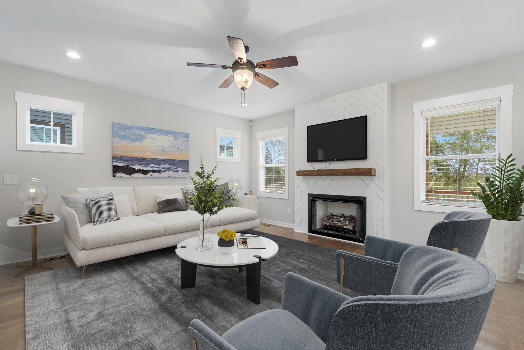 Fall in love with this beautifully crafted modern home by a local builder, perfectly located just minutes from downtown, yet tucked away on a quiet street. Step inside to discover designer finishes throughout, including engineered hardwood flooring, 9-foot ceilings, and a custom gas fireplace anchoring the living space. The kitchen shines with quartz countertops, soft-close solid wood cabinetry, stainless steel appliances, and a gas range. Retreat to the spacious primary suite, featuring a tray ceiling, oversized walk in shower and a generous walk-in closet. Out back, enjoy the large covered deck and fully fenced yard lined with bamboo for added privacy - a perfect setting for entertaining or quiet evenings. Additional highlights include a tankless natural gas water heater and exceptional craftsmanship throughout.