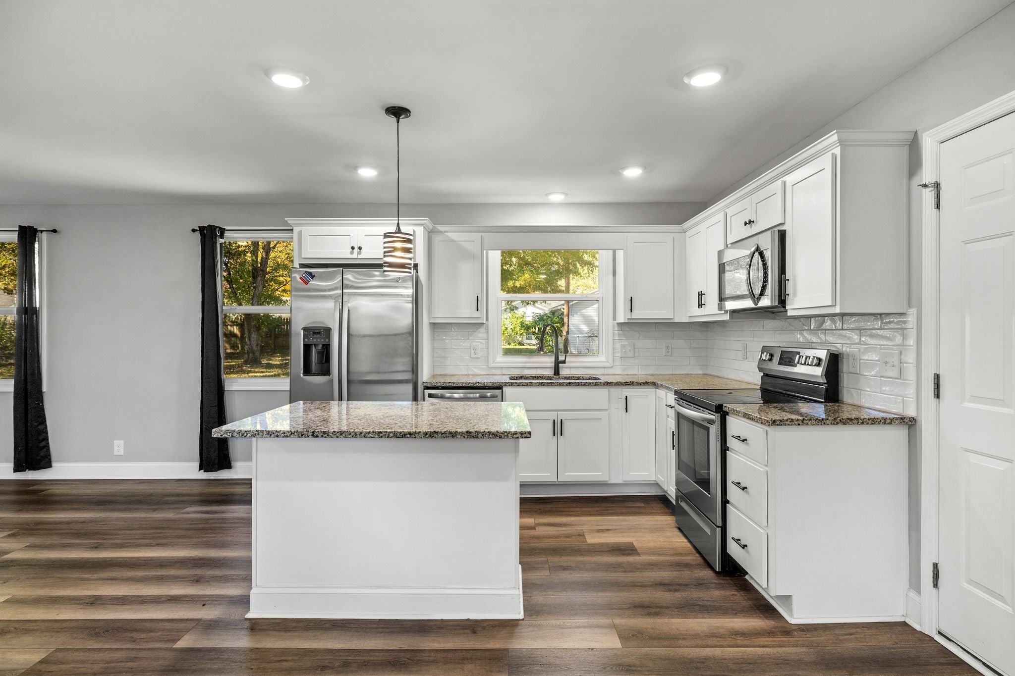 ~RENOVATED ALL BRICK RANCH HOME WITH A REAR GARAGE ~NEWER ROOF, HVAC, DUCTWORK, PLUMBING, WATER HEATER, WINDOWS, FRONT DOOR & FRONT PORCH POSTS, GUTTERS, SOFFIT, GARAGE DOOR ~NEWER INSIDE AS WELL INCLUDING FLOORING, KITCHEN CABINETS, GRANITE, STAINLESS STEEL APPLIANCES, KITCHEN ISLAND, TILE BACKSPLASH, FIXTURES, CELING FANS, DOORS, BATHTUB, VANITIES, TOILETS, ETC. ~NEW SEWER LINE FROM HOME TO CONNECTION IN 2023 ~A MUST SEE RENOVATION!