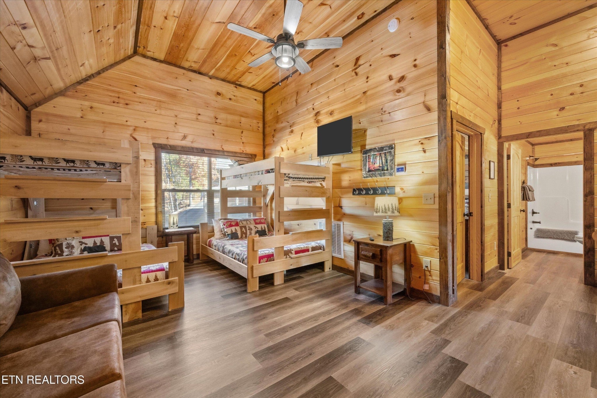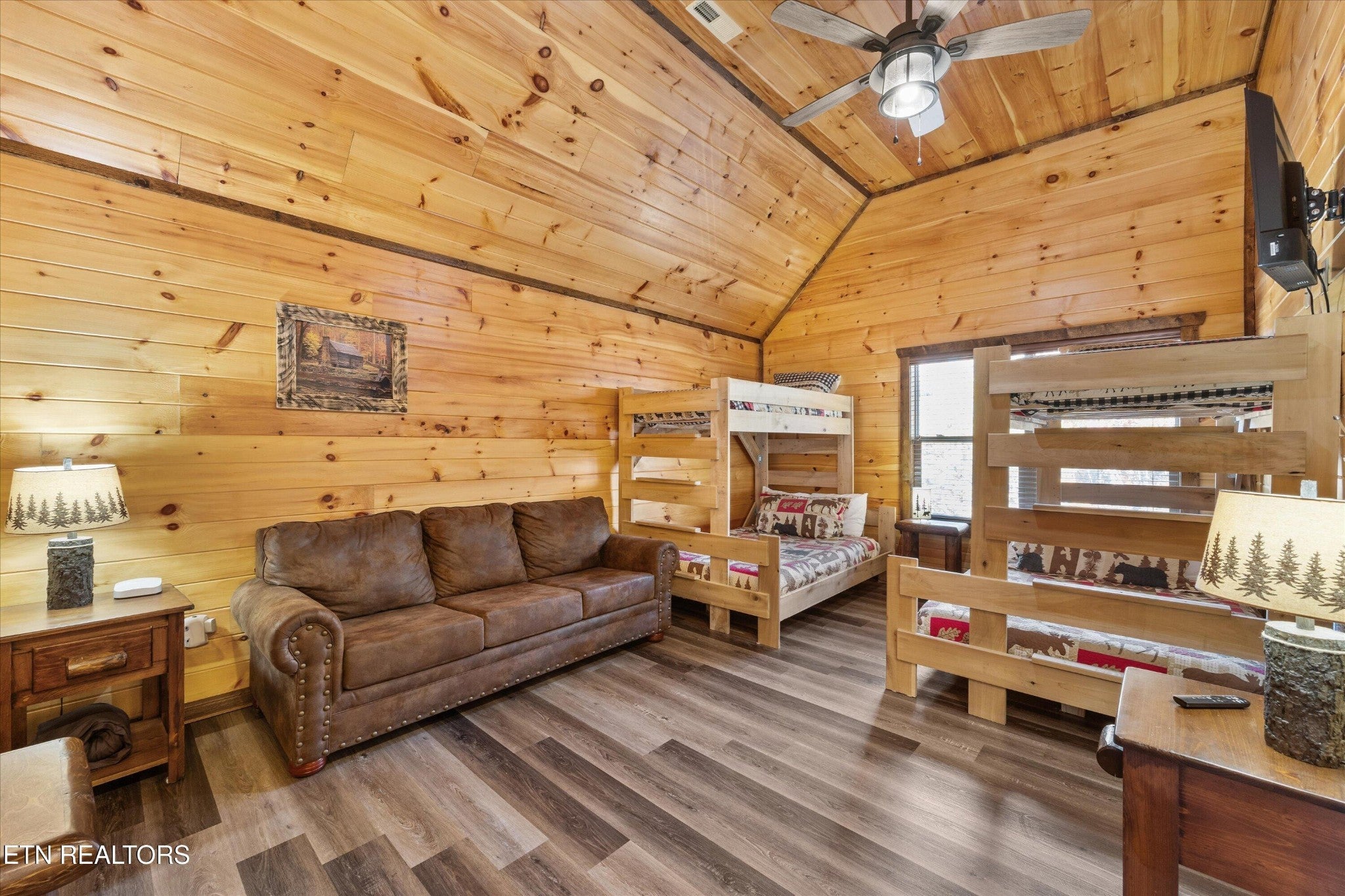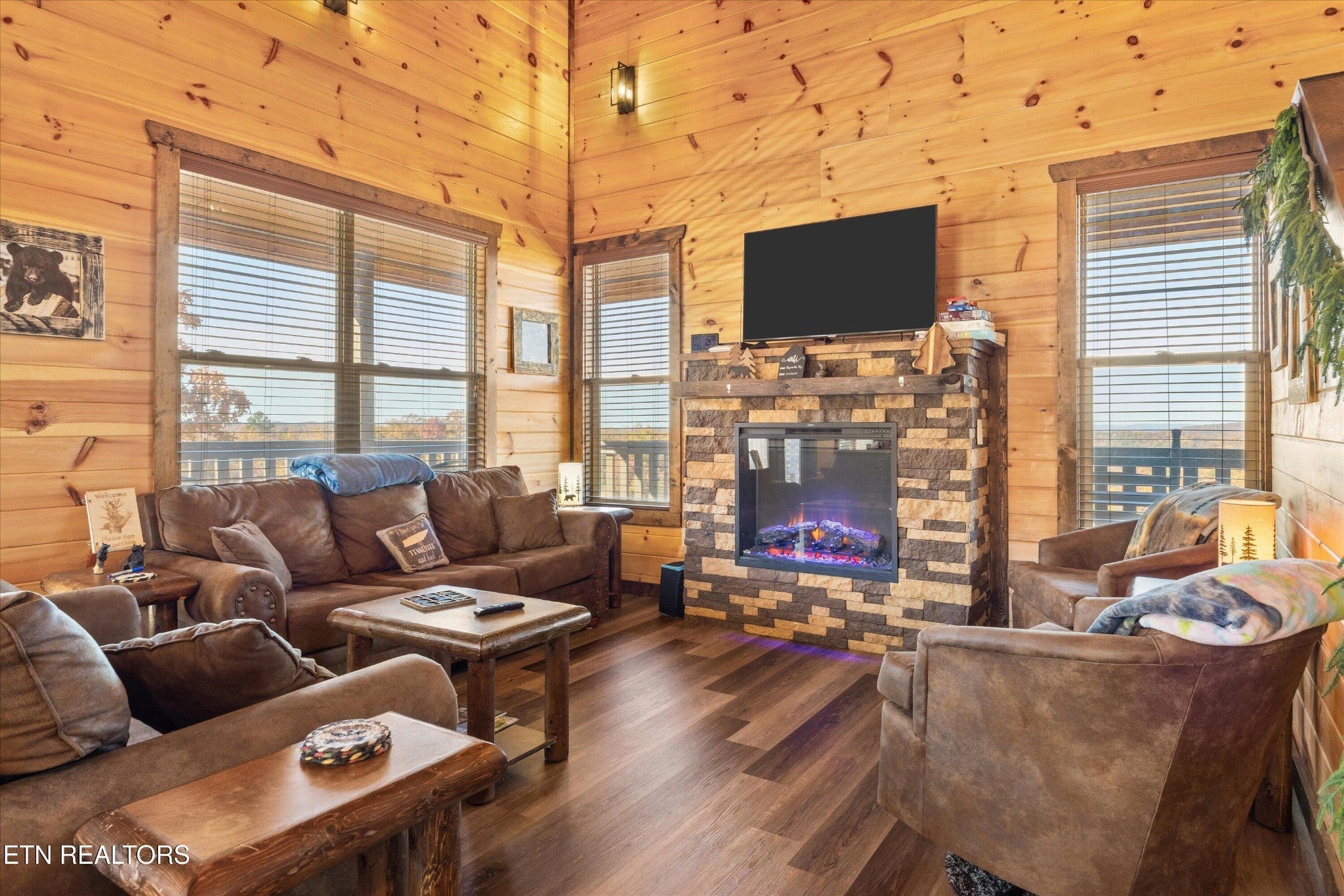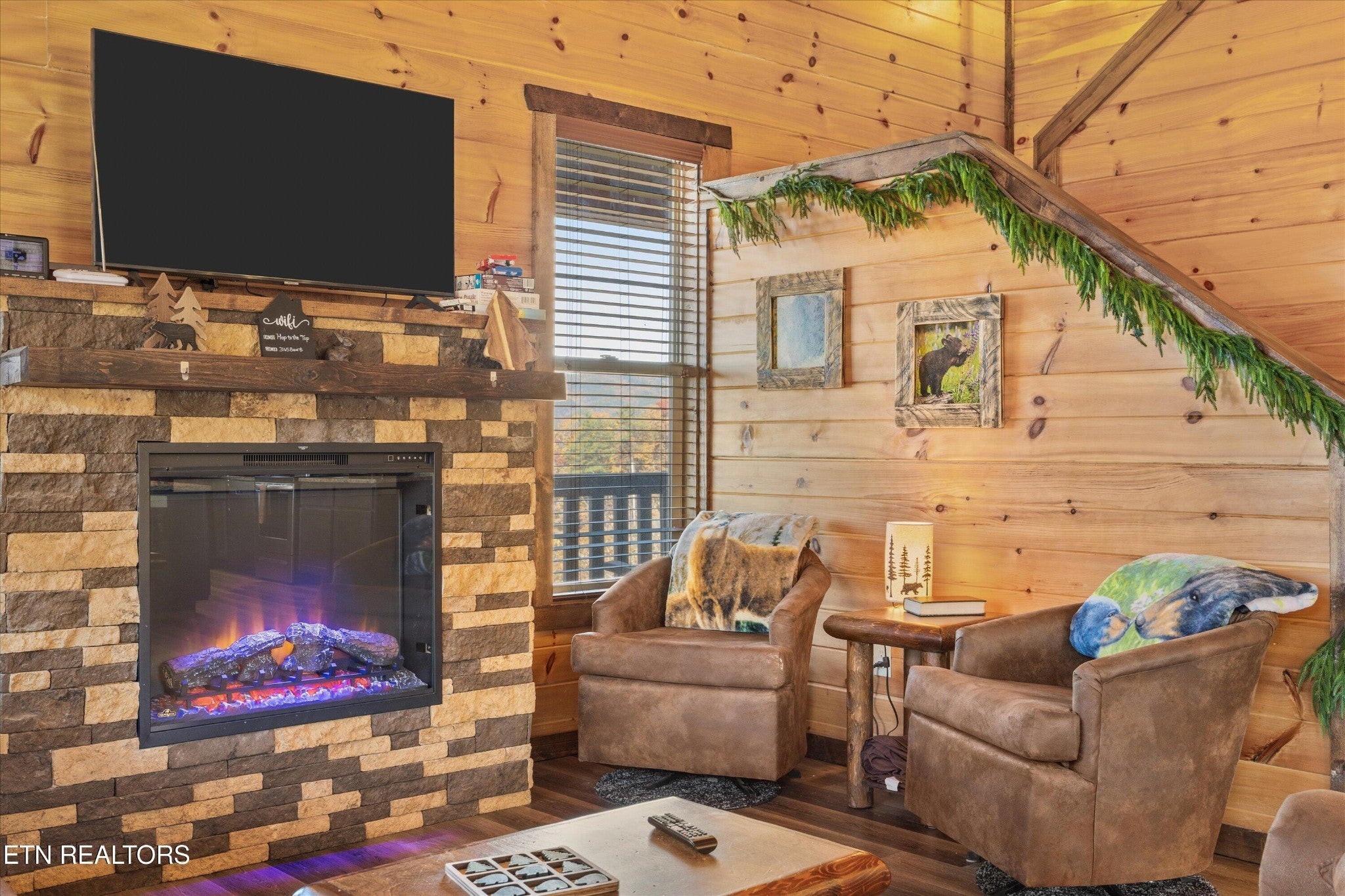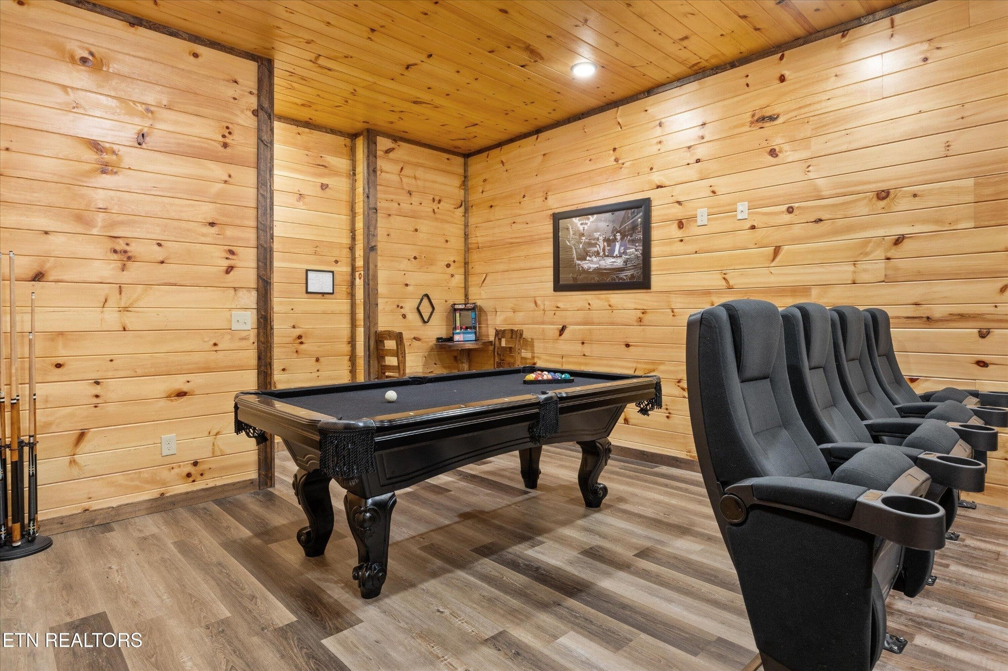Welcome to your ultimate Smoky Mountain escape! This incredible cabin offers jaw-dropping, unobstructed mountain views and every amenity you could dream of from a private indoor swim spa to a wraparound porch made for sunrise coffee and sunset cocktails. The main level features two king bedrooms, a full bath, a cozy living room with an electric fireplace, and a smart TV. The open-concept dining area easily seats 10, and the kitchen comes fully stocked with everything you need. Head upstairs to find the ultimate hangout space with a loft with two custom-built bunk beds (twin-over-full), another pullout sofa, and a TV perfect for movie nights or kid adventures. You'll also find a king suite, an additional king bedroom, and a full bathroom. Downstairs is where the fun really begins with your very own theater room with reclining seats and a futon, pool table, air hockey, classic arcade console, and that amazing indoor swim spa. Step outside to your second porch to find a bubbling outdoor hot tub, fire pit with seating for the whole crew, and plenty of space to soak in the view. This property is all about relaxation and play with easy access to Sevierville, Pigeon Forge, and Gatlinburg, you're never far from adventure, dining, and entertainment. And with a spacious driveway, there's plenty of parking for everyone. Whether you're looking for a family getaway, an income-producing short-term rental, or the perfect mountain retreat this cabin has it all.