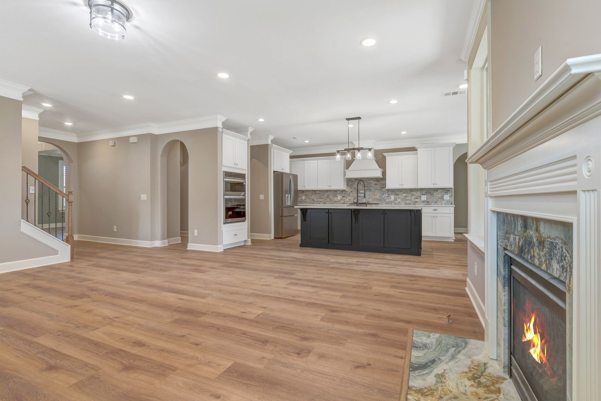 - Built-In Electric Oven, Double Oven, Gas Range, Dishwasher, Disposal, Microwave, Refrigerator, Stainless Steel Appliance(s)