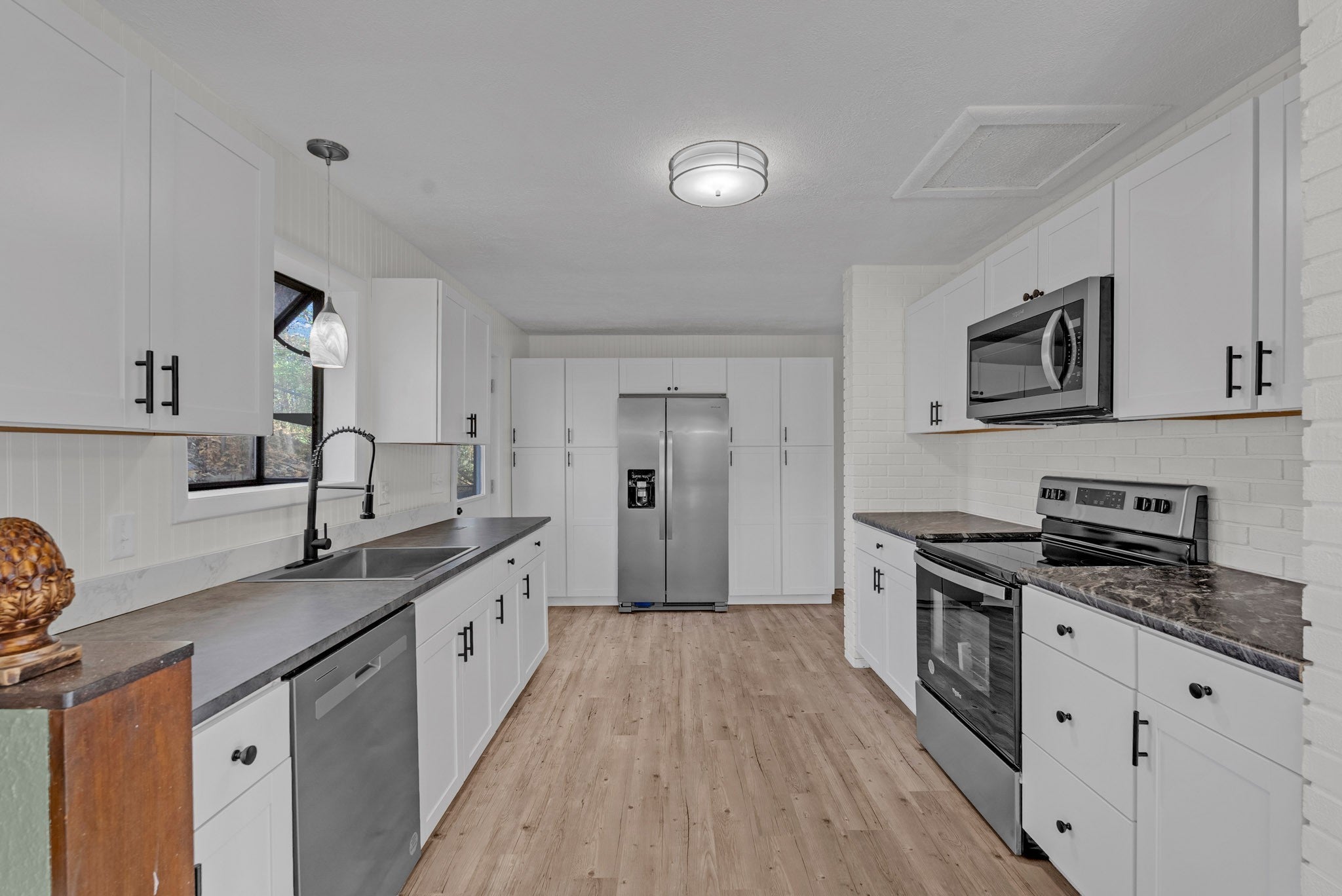 - Electric Range, Dishwasher, Microwave, Refrigerator, Stainless Steel Appliance(s)