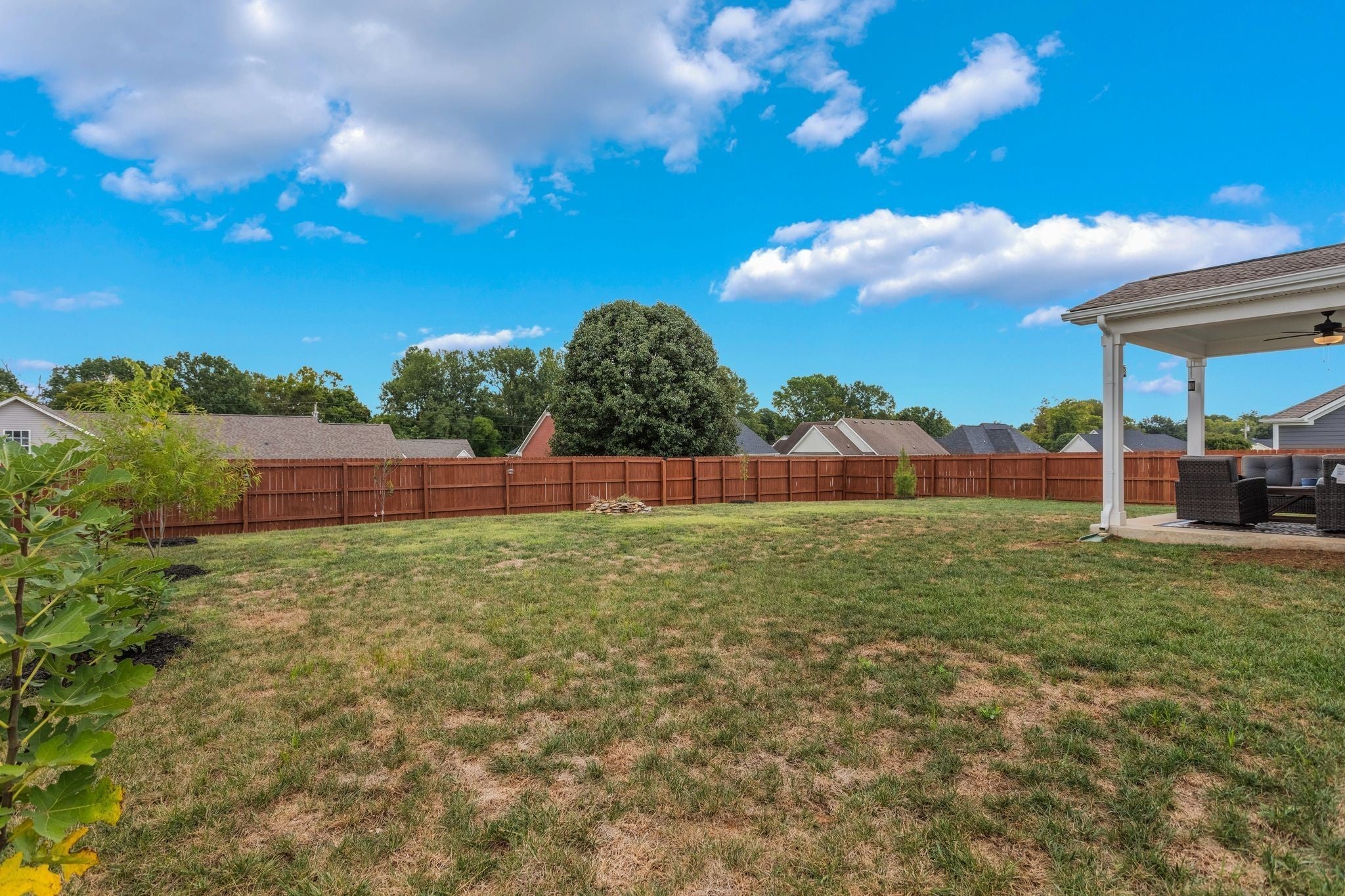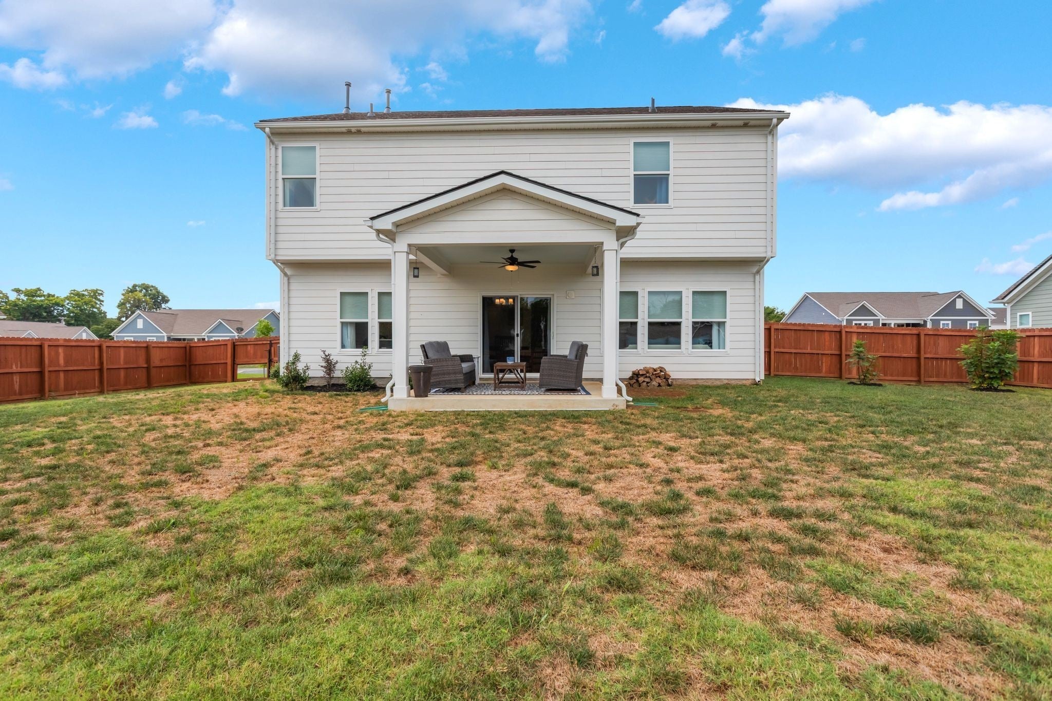 Beautiful 4-Bedroom Home with Open Concept Living & Private Backyard Retreat. This stunning 2-year-old home offers the perfect blend of modern design, comfort, and functionality. With 4 spacious bedrooms and 3.5 bathrooms, there's room for everyone—plus thoughtful upgrades throughout that make everyday living a breeze. Step inside to an inviting open-concept main level where the living room, dining area, and kitchen flow together seamlessly. The kitchen is a chef’s dream, featuring quartz countertops and a walk-in pantry. Whether you're cooking for two or hosting a crowd, this space delivers. Upstairs, the luxurious primary suite includes two walk-in closets and spacious bath with walk in shower and double vanities. A second en suite bedroom also enjoys its own private bath—ideal for guests or a growing family. All bathrooms upstairs feature quartz countertops and tile flooring. Outside, enjoy a beautifully landscaped yard complete with a new privacy fence, covered back porch, and a cozy fire pit—perfect for relaxing or entertaining year-round. The home also offers extra storage space above the garage door, making organization easy. Well-maintained and move-in ready, this home truly has it all—modern finishes, smart layout, and a backyard designed for enjoyment. Don’t miss your chance to own this turnkey gem!