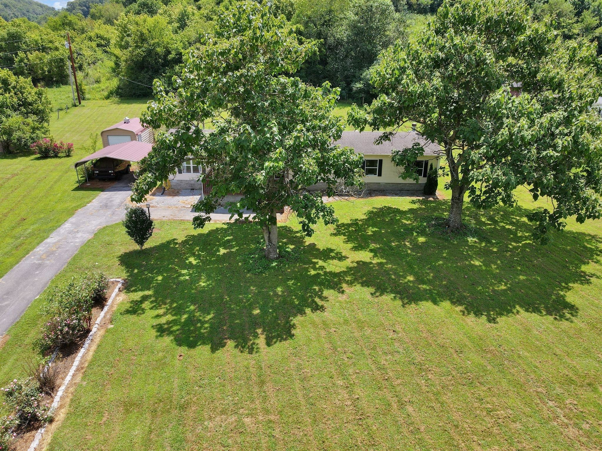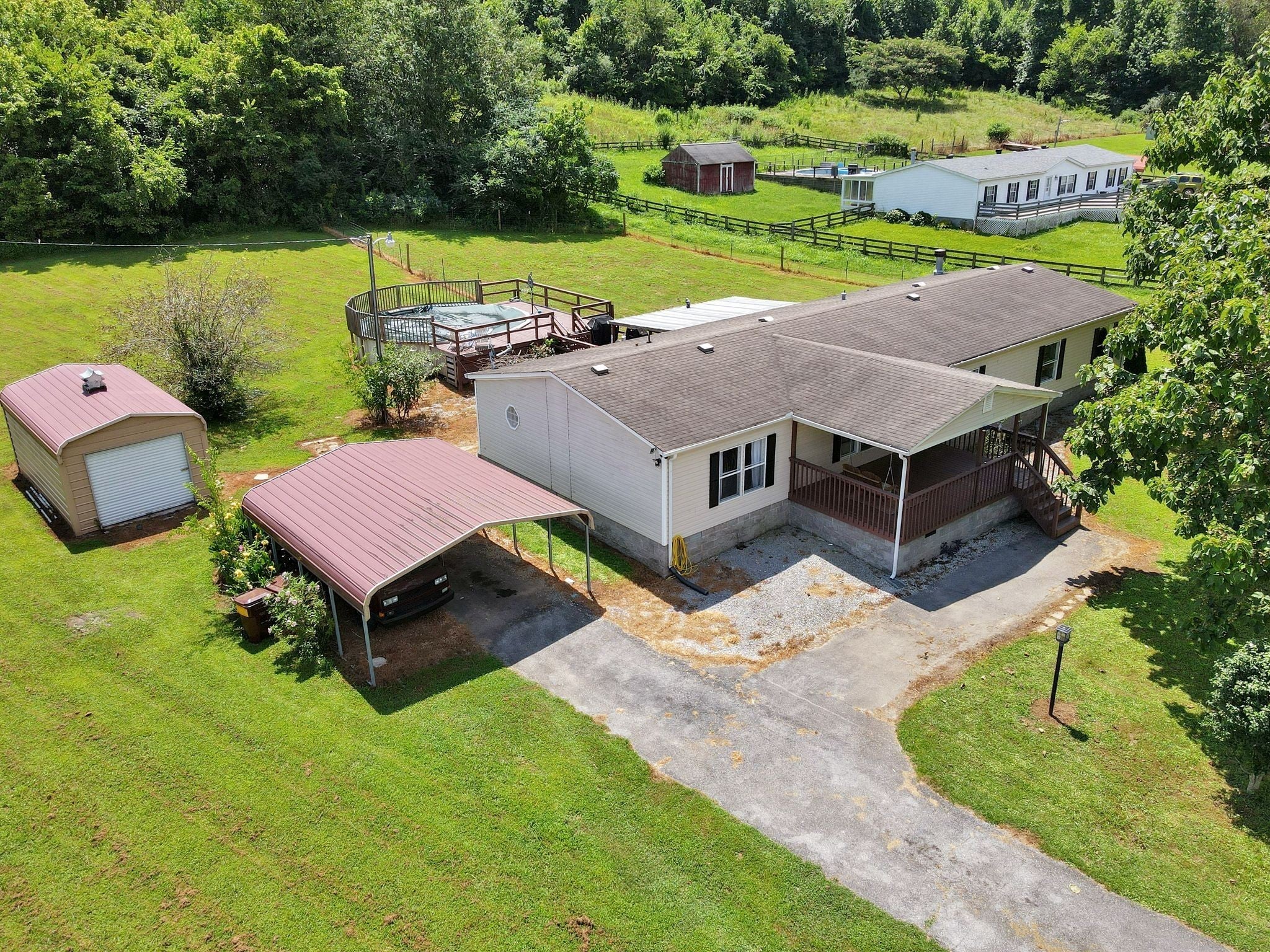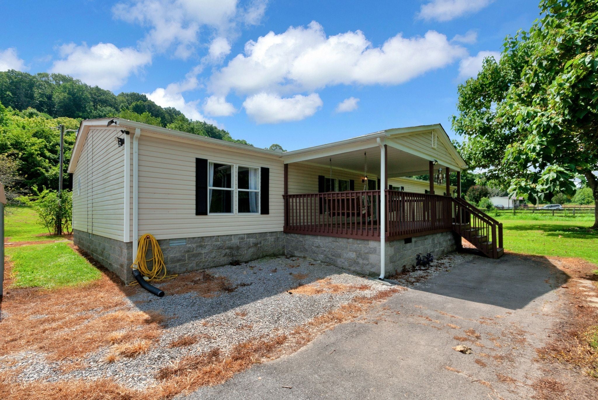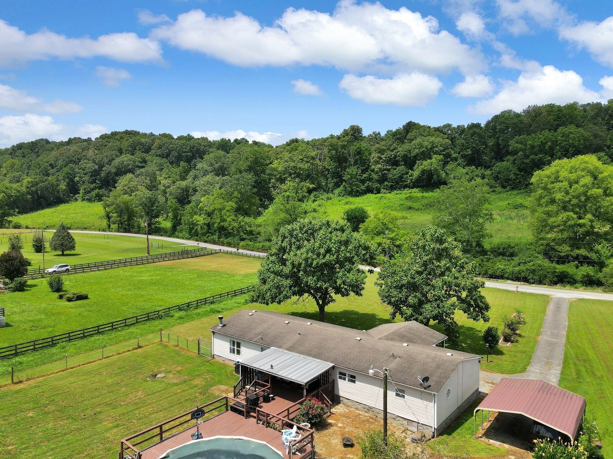 Enjoy beautiful views of the Tennessee hills from this charming 3-bedroom, 2-bath home offering over 2,100 sq ft of living space, including a dedicated office and a cozy den with a fireplace. Situated on 3.5 acres, this property provides the perfect blend of privacy and outdoor living. The spacious, covered front porch is ideal for rocking chairs and a swing, while the covered back deck offers a peaceful retreat overlooking the yard. Inside, the home features generously sized bedrooms, including an oversized secondary room. Outside, you’ll find a carport, a workshop, a pool, and plenty of flower beds surrounded by established landscaping—everything you need to enjoy the best of country living.