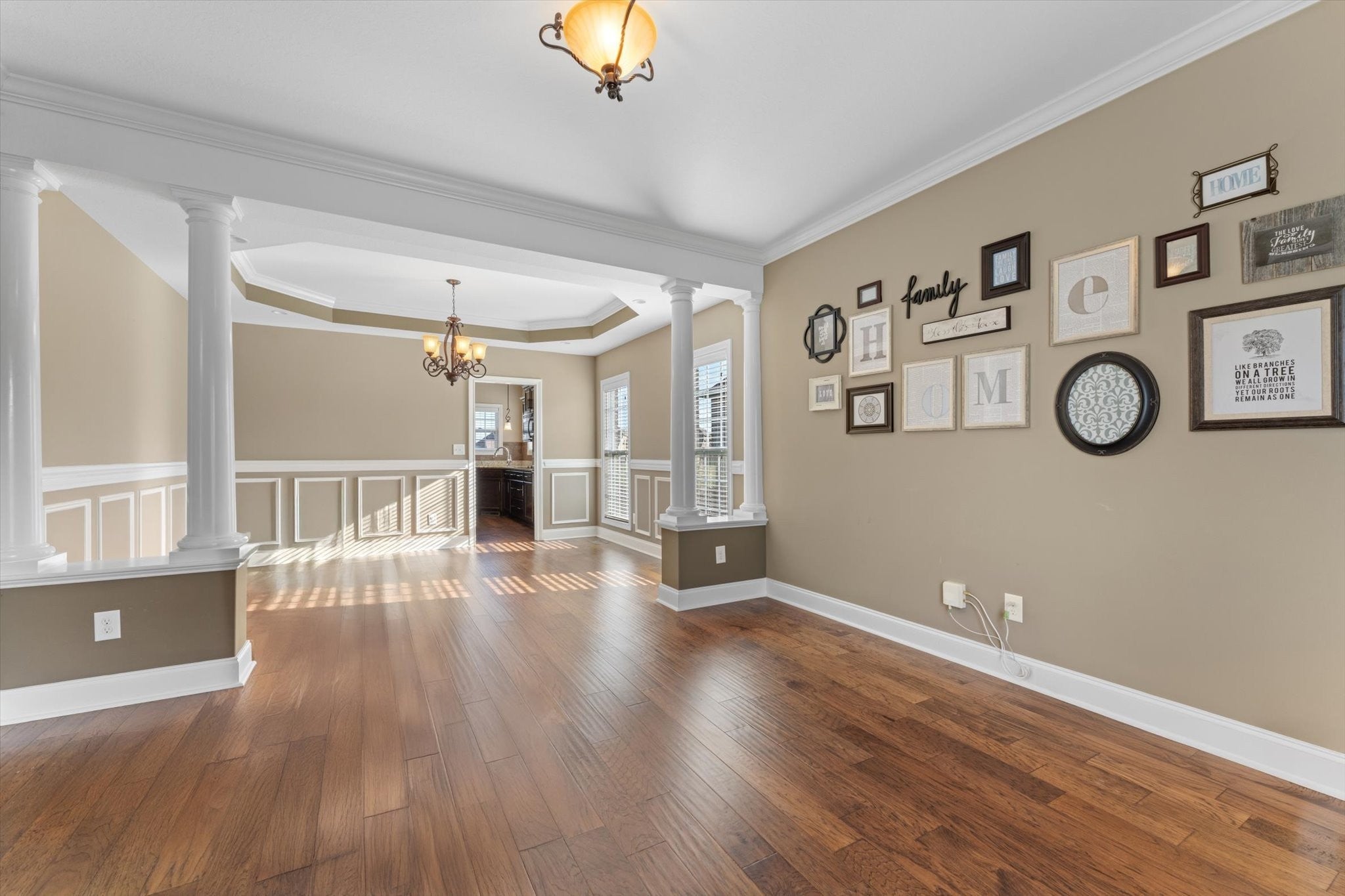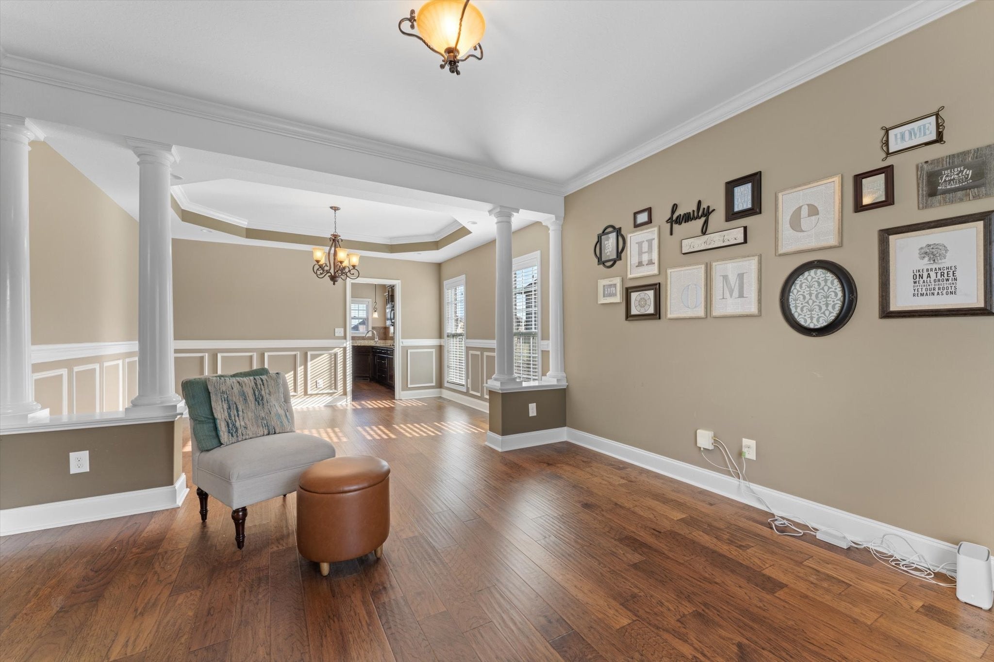 Major WOW factor in this 2-story brick home located on a beautiful level lot w/ privacy fence and no back door neighbors in a cul-de-sac. Hand-scraped hardwood floors thru-out the main living space, 2-story foyer opens to the formal living and dining room with beautiful wall and ceiling trim, floor-to-ceiling windows offering lots of natural lighting. The eat-in kitchen offers granite counters with tile backsplash, double ovens, pantry, utility room w/ mud sink and a glass door to a huge screened covered deck with extra outdoor living space on a concrete patio. Spacious great room with 18 ft ceilings and gas fireplace. Guest suite with full bath on the main level. Owner's retreat has a double trey ceiling, with an office or nursery with vaulted ceiling, on-suite bath w/ vaulted ceiling, a huge tile shower, jetted tub, sep vanities w/ granite tops and a huge walk-in closet. There are 2 more spacious guest bedrooms with huge closets and a bonus room that could be a 5th bedroom w/ 2 huge closets.
