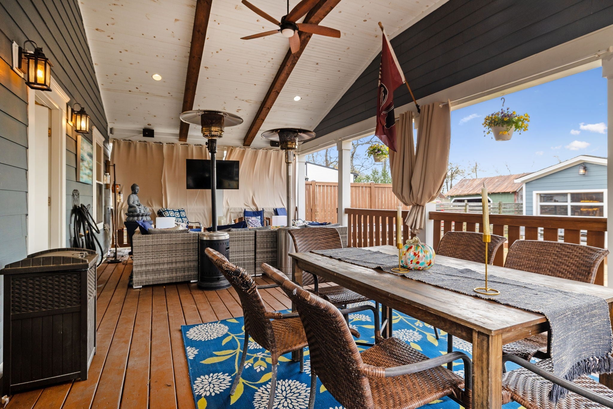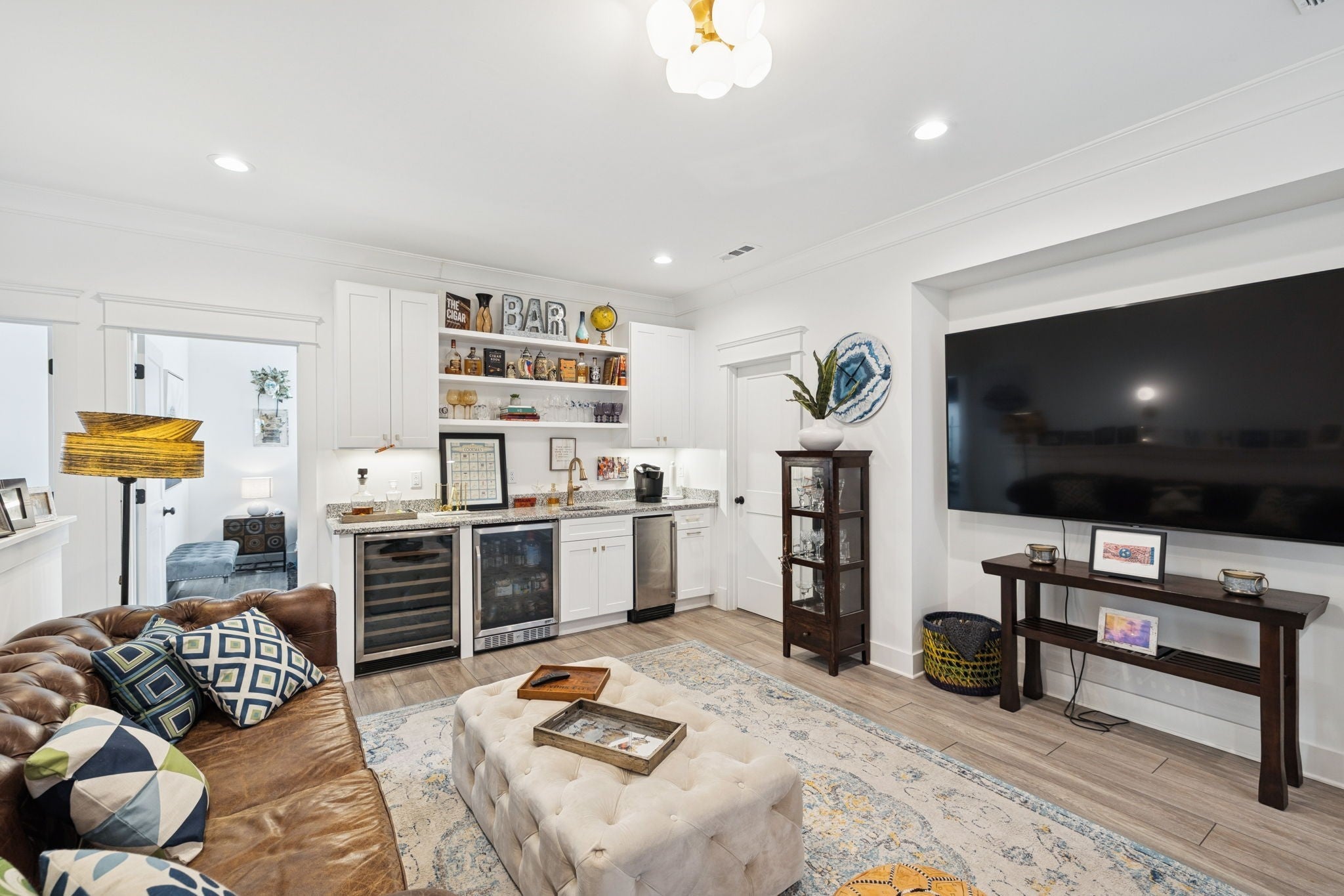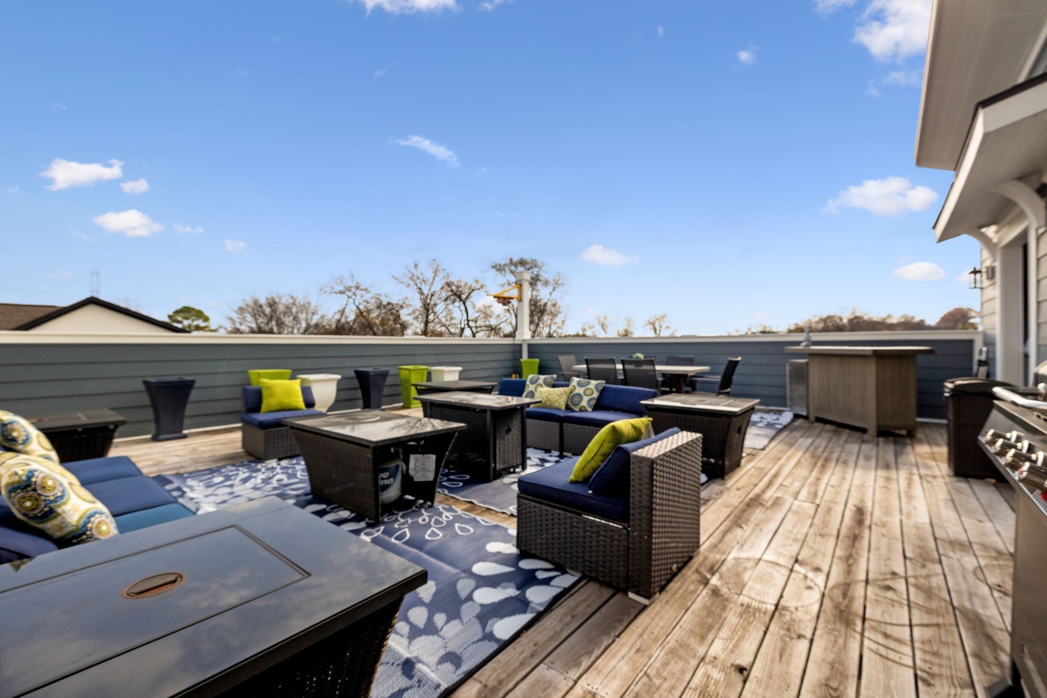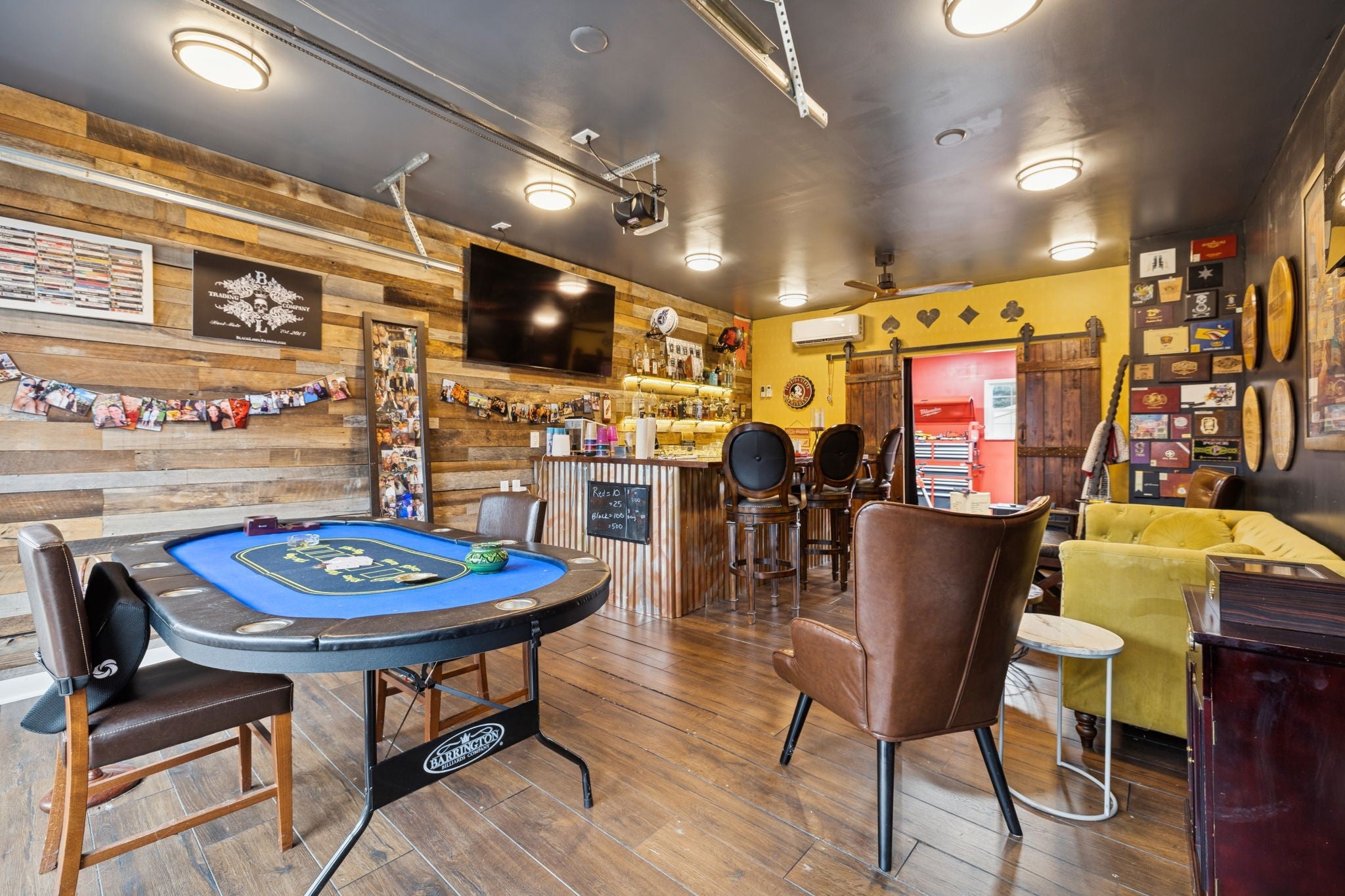 Entertainer’s Dream Home with Dual Master Suites and Expansive Outdoor Living! Welcome to this stunning custom-built home designed for entertaining and everyday luxury. Step inside the open floor plan where natural light fills a spacious living area centered around a massive kitchen island—perfect for gatherings. Enjoy your morning coffee on the inviting front porch or host unforgettable evenings on the expansive covered back patio overlooking your private outdoor retreat. This home features two primary suites, ideal for guest comfort. The custom office boasts built-in shelving and rich woodwork on the ceiling, offering an inspiring workspace. Upstairs, entertain with style at the bar complete with a wine refrigerator, or step outside to the huge rooftop deck for panoramic views and memorable sunsets. Outside, an outbuilding with a bar and kegerator adds the perfect finishing touch—creating a backyard experience unlike any other. Every inch of this property is crafted for comfort, sophistication, and entertaining at its finest. Includes: Front Porch Swing, 3rd floor rugs, 3rd floor bar, Poker Room Kegerator and Refrigerator, Poker Room Glass Shelves, Two Rooftop Fire Tables, Rooftop Projection Screen. 2nd Floor Ice Maker, Mini Refrigerator, and Wine Cooler.