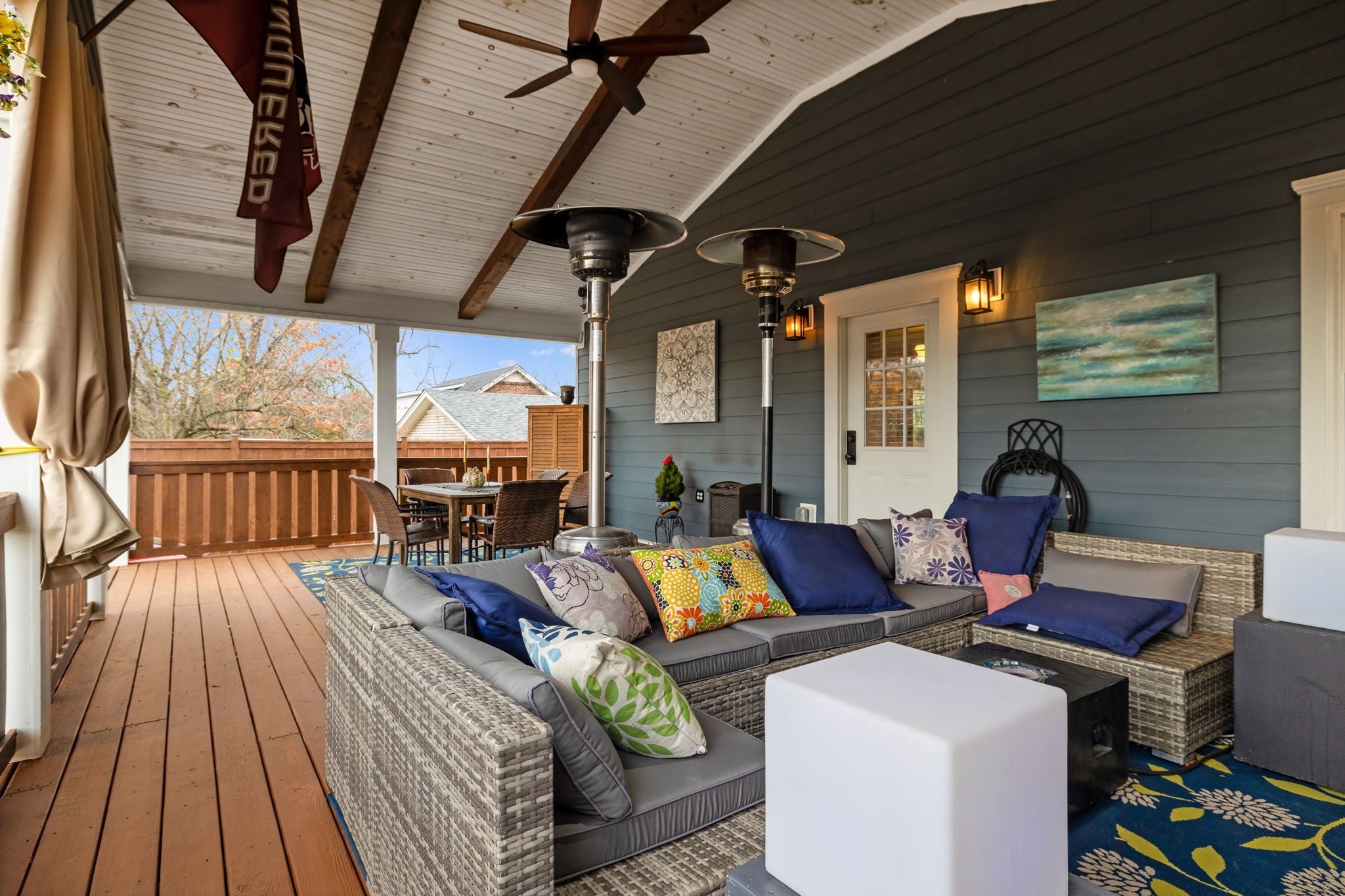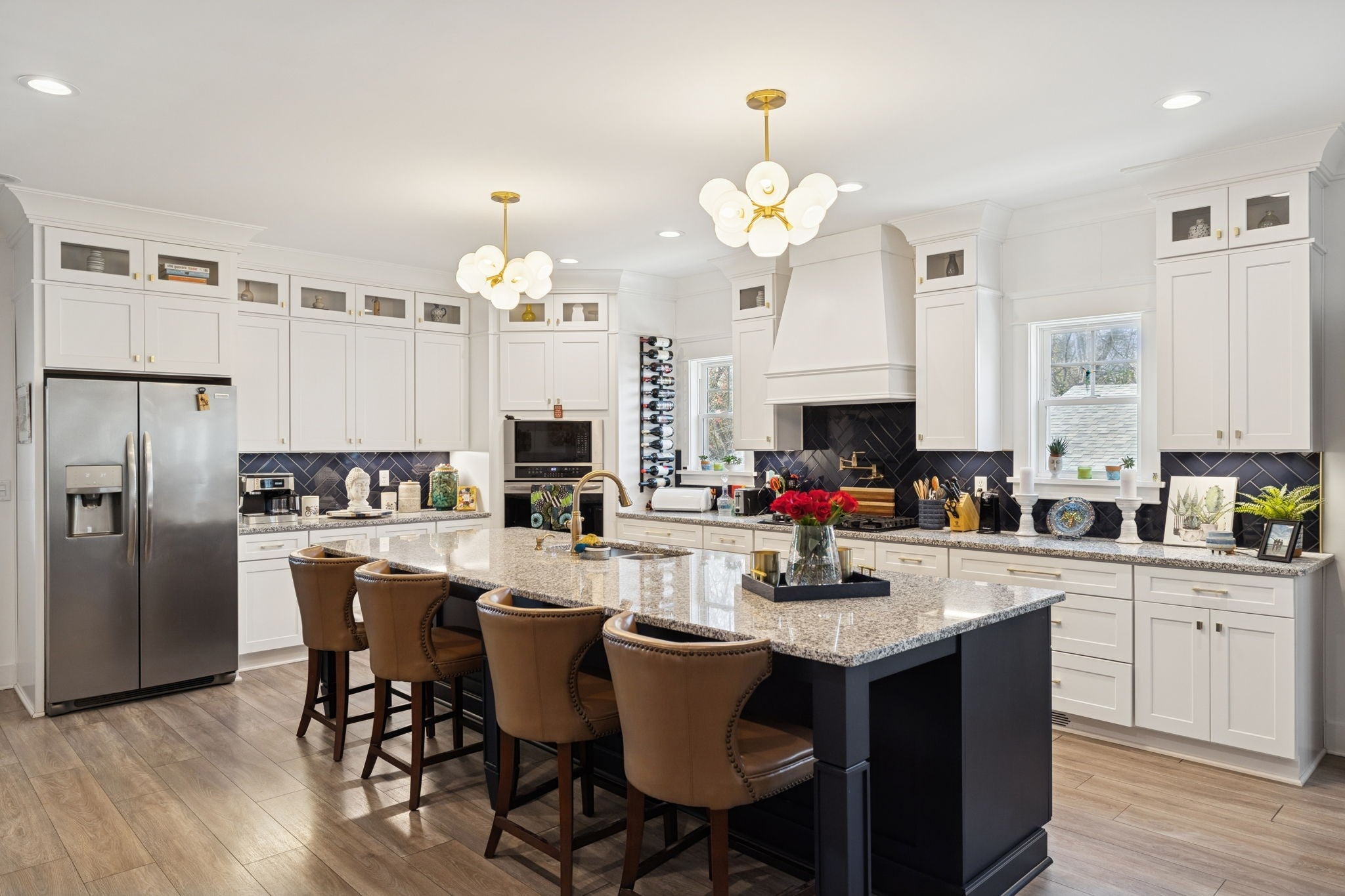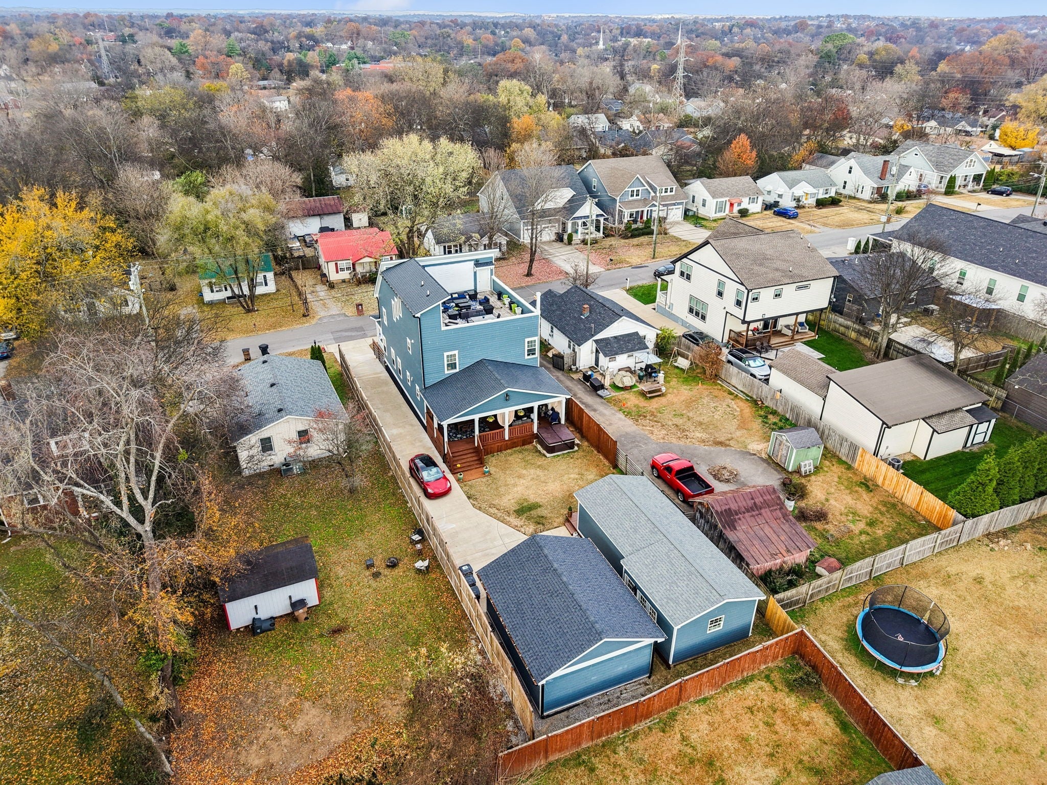 Entertainer’s Dream Home with Dual Master Suites and Expansive Outdoor Living! Welcome to this stunning custom-built home designed for entertaining and everyday luxury. Step inside the open floor plan where natural light fills a spacious living area centered around a massive kitchen island—perfect for gatherings. Enjoy your morning coffee on the inviting front porch or host unforgettable evenings on the expansive covered back patio overlooking your private outdoor retreat. This home features two primary suites, ideal for guest comfort. The custom office boasts built-in shelving and rich woodwork on the ceiling, offering an inspiring workspace. Upstairs, entertain with style at the bar complete with a wine refrigerator, or step outside to the huge rooftop deck for panoramic views and memorable sunsets. Outside, an outbuilding with a bar and kegerator adds the perfect finishing touch—creating a backyard experience unlike any other. Every inch of this property is crafted for comfort, sophistication, and entertaining at its finest. Includes: Front Porch Swing, 3rd floor rugs, 3rd floor bar, Poker Room Kegerator and Refrigerator, Poker Room Glass Shelves, Two Rooftop Fire Tables, Rooftop Projection Screen. 2nd Floor Ice Maker, Mini Refrigerator, and Wine Cooler.
