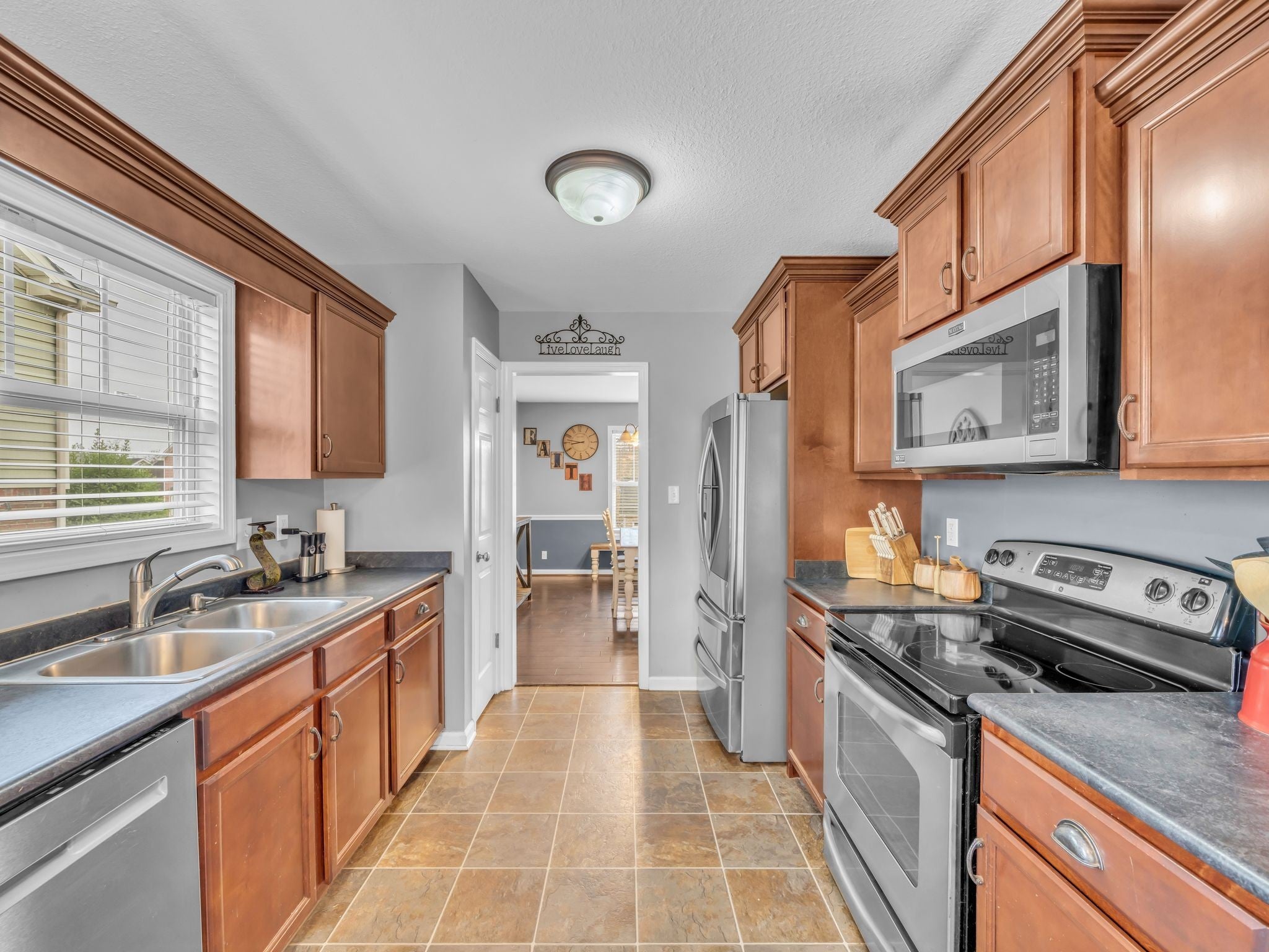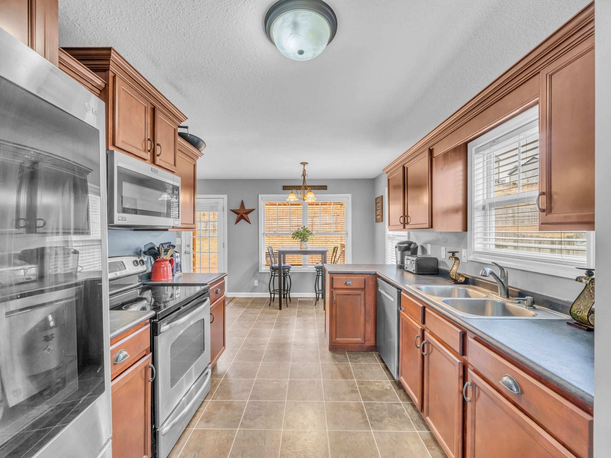 - Electric Oven, Electric Range, Dishwasher, Disposal, Microwave, Refrigerator, Stainless Steel Appliance(s)