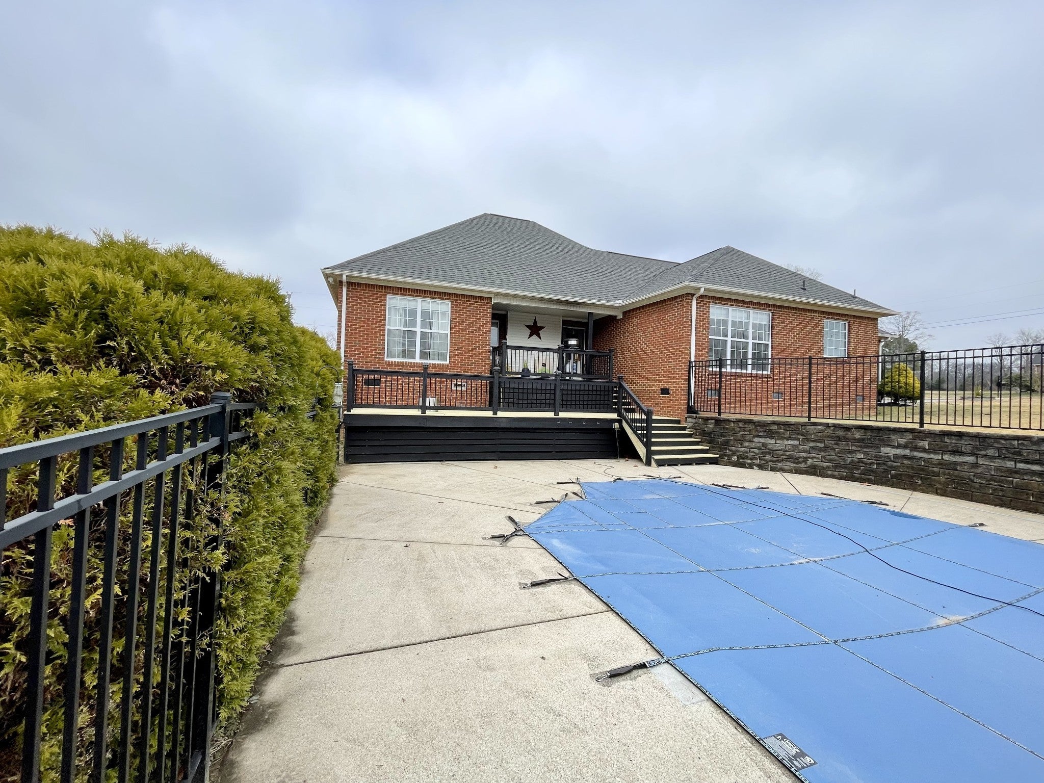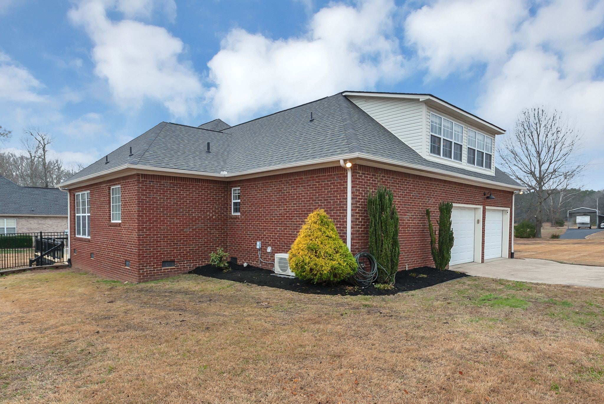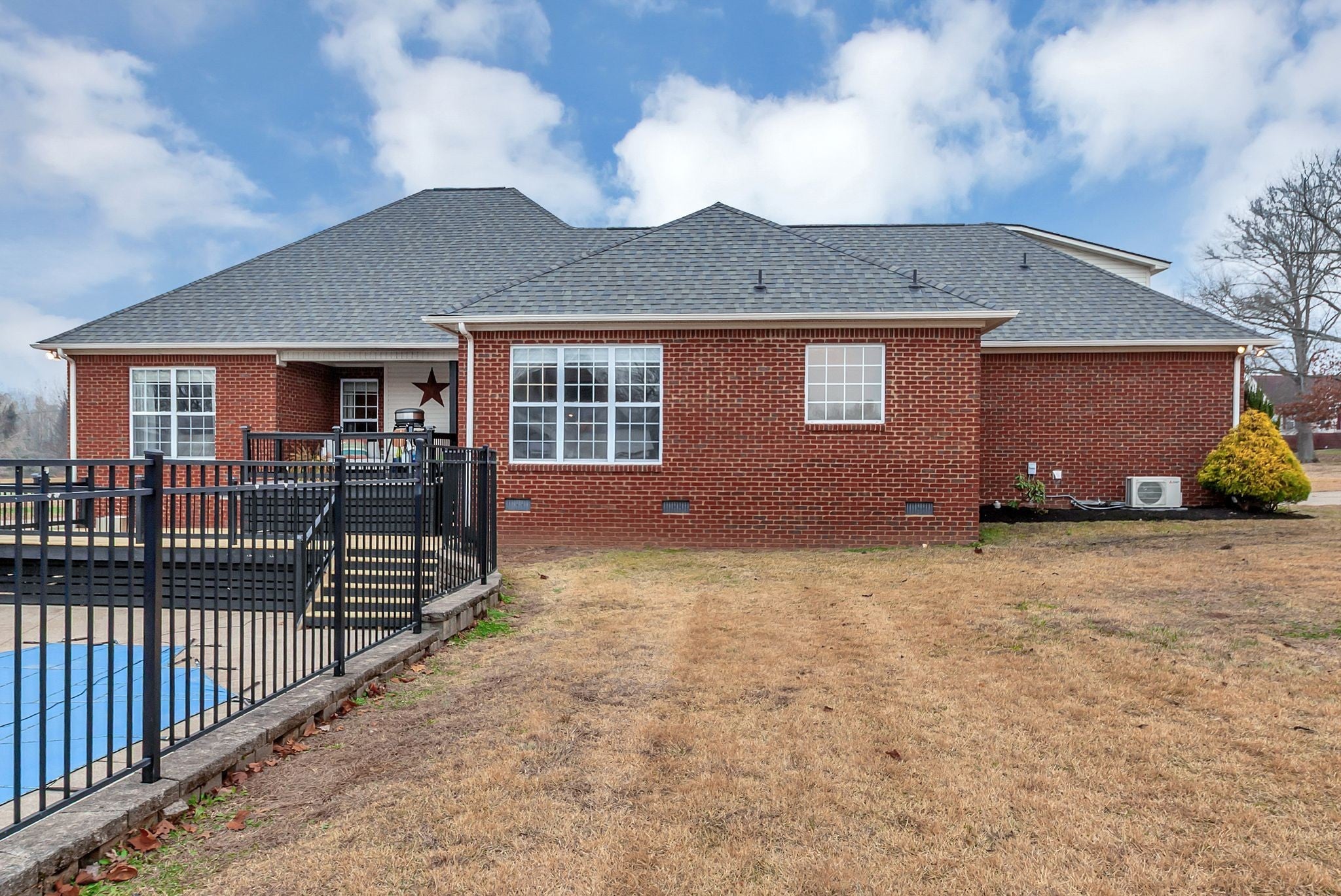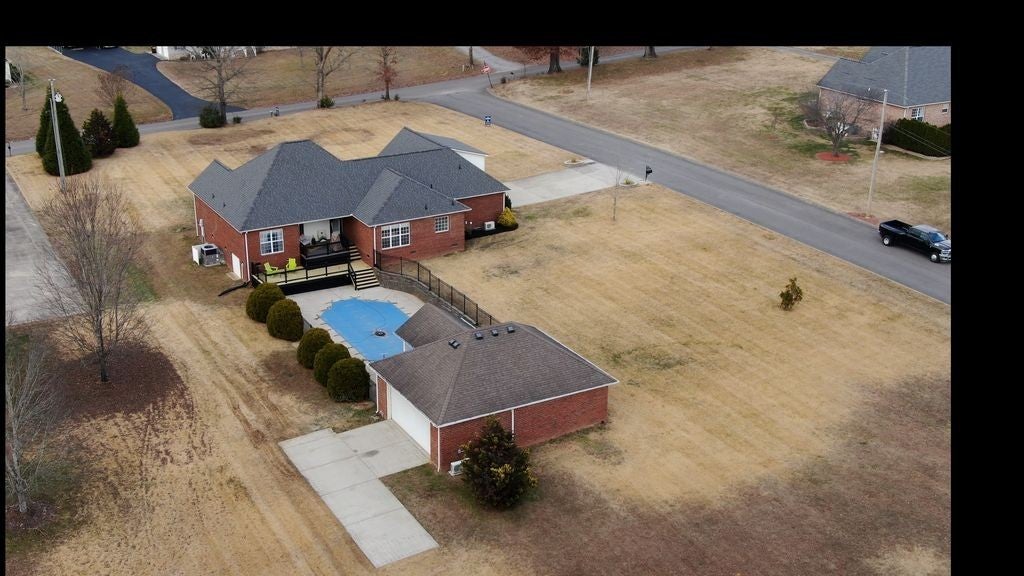 Nestled on 1.25 acres in this tranquil country setting. Rare find.This charming all brick home features a rocking chair front porch, covered back porch-new double deck, new railings-overlooking In-ground pool/3 fountains, pool house/home office/garage, and new mini splits (AC & Heat). Gorgeous updated kitchen: large island, granite countertops, backsplash & abundance of beautiful cabinets. Separate Breakfast & Dining rm. Floorplan includes: 3 bedrooms, 2 1/2 bathrms., expansive bonus room-new carpet. Hardwood floors, freshly painted, updated bathrooms, new lighting fixtures, high ceilings, cozy fireplace. Primary bedroom suite features tray ceilings, hardwood floors and perfect view of the pool. Primary bathroom updated, large walk in shower and separate tub. New roof 2024.Level 2 EV charger, RV/Trailer parking pad, 30 amp. Oversized attached two car garage offers addition storage. Location, location, easy access to shopping, restaurants, & highway.