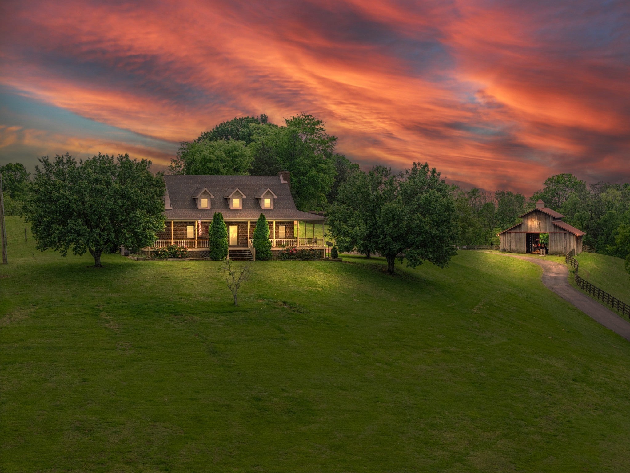 Countryside Serenity Meets Modern Comfort on 30+/- Scenic Acres! Where the sunsets steal the show & every detail is tailored for peaceful, private living. Ideally located just over 10 miles from I-65, this serene countryside retreat gives quick access south to Huntsville, AL or north to Nashville, TN, all while feeling a world away. Step inside this 3-bedroom, 2.5-bath custom-crafted home w/ wrap-around porch facing west — perfect for catching stunning sunsets. Main-level primary suite w/ renovated bath & granite finishes, plus 2 large bedrooms upstairs w/ full bath. Real hickory hardwood floors, a cozy wood-burning fireplace, & large walk-in closets for plenty of storage. Renovated kitchen w/ granite countertops, updated fixtures, recessed lighting, & a beautiful custom granite shower bench. 2 efficient HVAC units, plus heat pump & propane (500-gallon tank).Fiber internet — ready for remote work or streaming in the country. Spread out across 30+/- acres of fenced & thoughtfully maintained land, the property features: 1/4-acre pond, stocked w/ bass & brim, reaching 21FT depth — ideal for fishing, kayaking, or peaceful reflections. Established garden spots, marketable timber, & wildlife galore — from grazing deer to flocks of turkey. A paved driveway, updated water lines (pex inside PVC), & new FPU poles/transformers installed recently. The Barn & Beyond > Equestrians, hobby farmers, or dreamers — you’ll fall in love w/ this charming barn that has: 2 brand-new horse stalls, a new pen, water access in front & back, electric plugs plentiful, & a lifetime metal roof topped w/ a picturesque cupola. Exterior lighting around the barn & property, making evening chores a breeze. A detached two-car garage w/ a floored second story & full staircase — perfect for a studio, storage, or future guest space. New water heater, new storm door, & multiple water cutoffs for convenience. Roof less than 3 years old! Breathe easy on 30 acres of pure Tennessee charm.