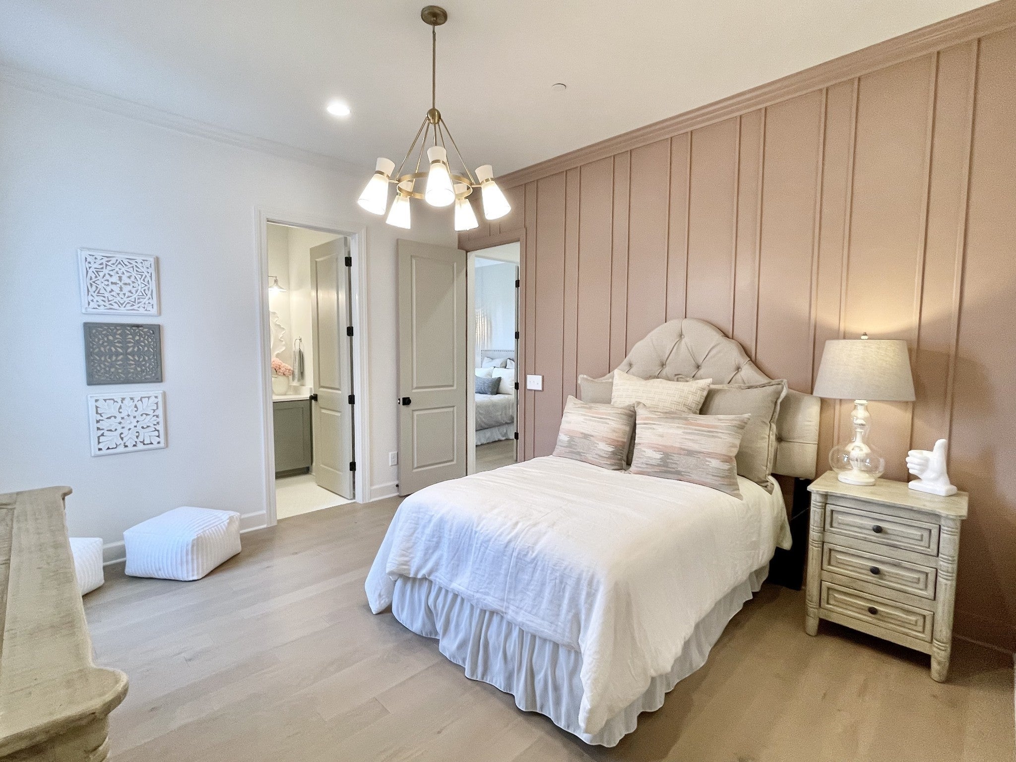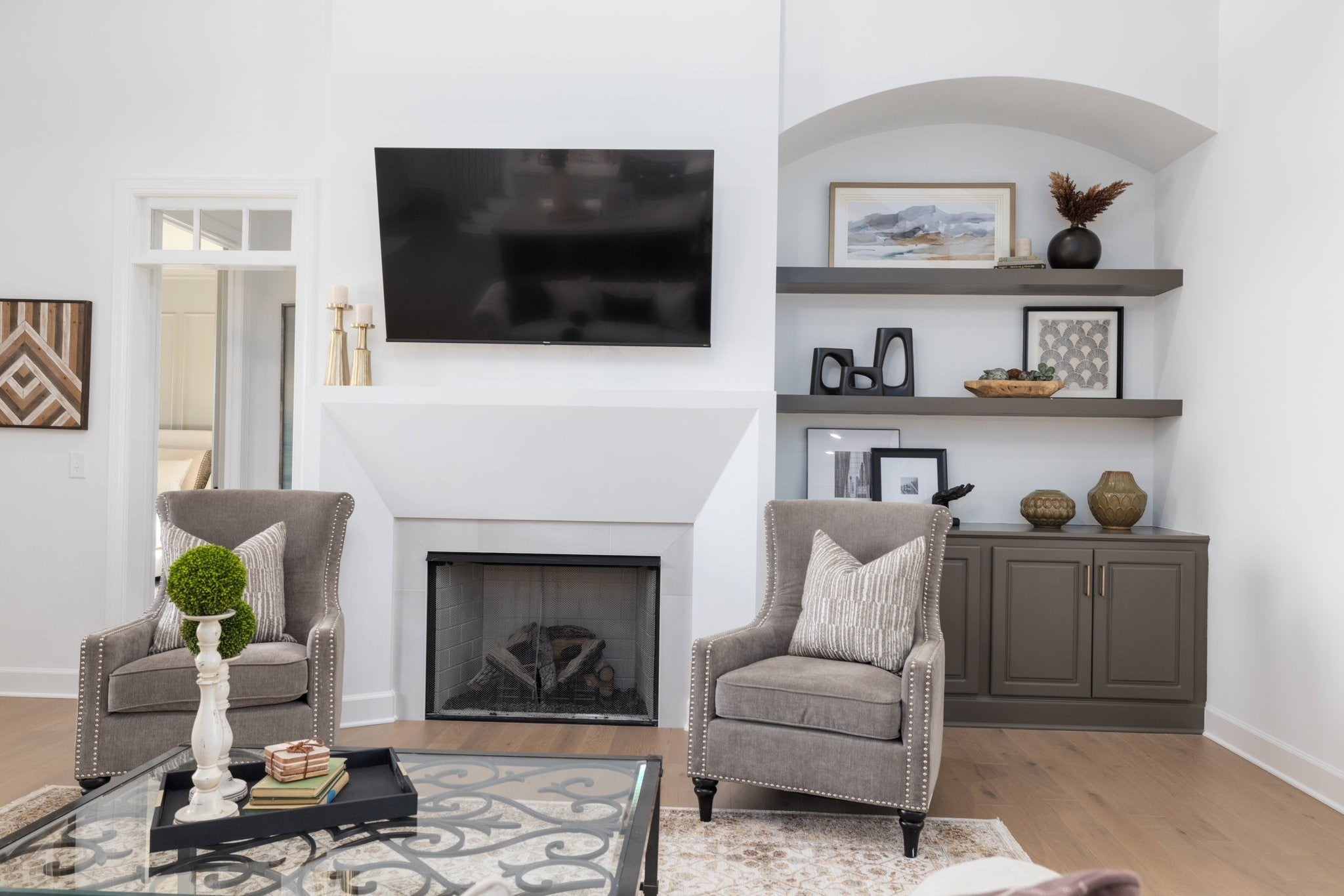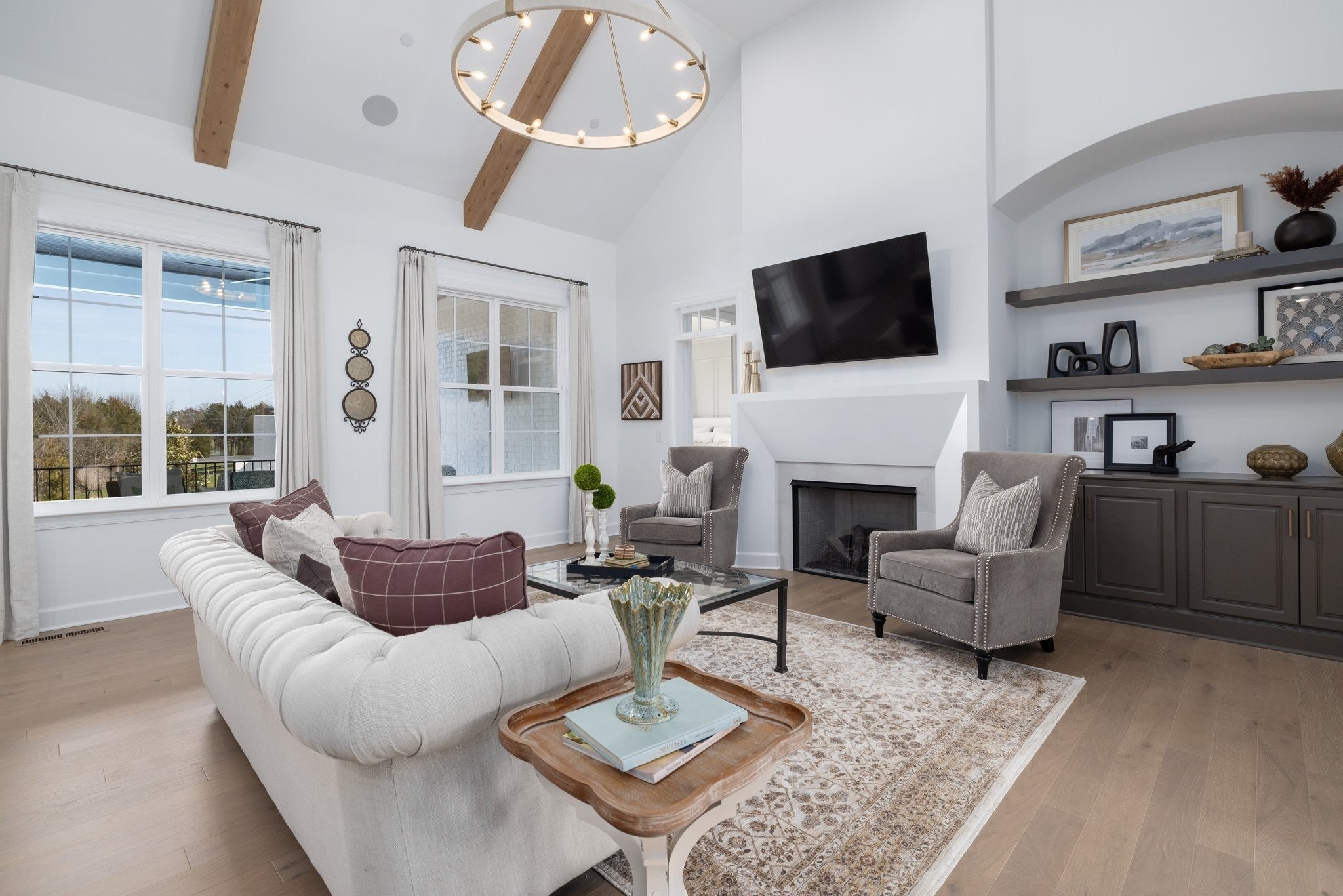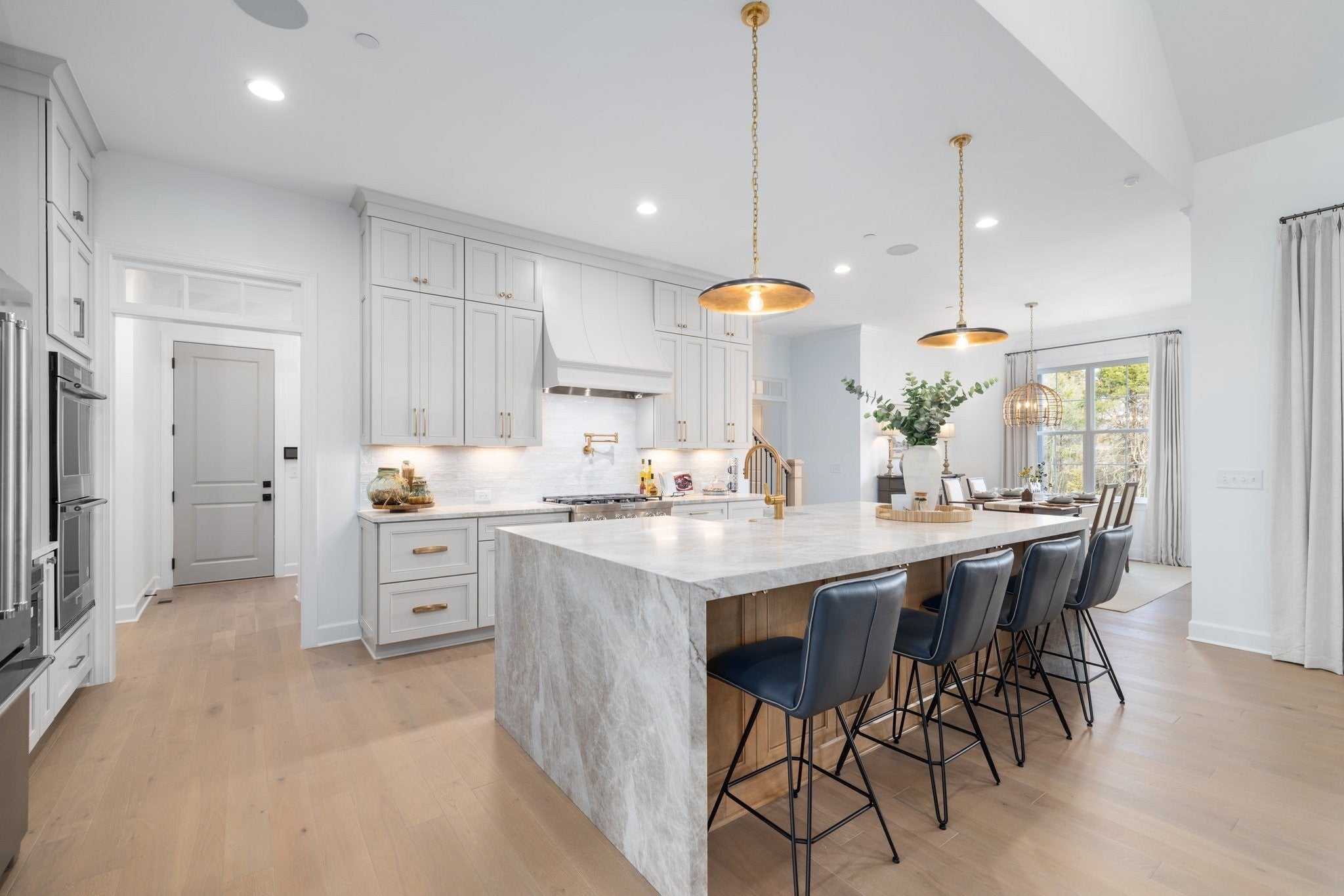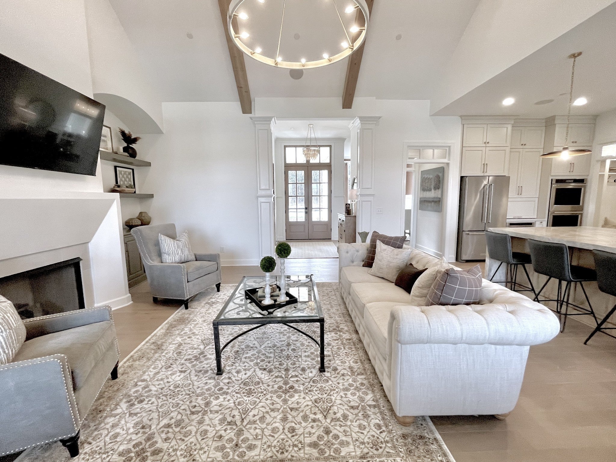 Experience exceptional craftsmanship and easy, elevated living in this beautifully designed Turnberry model home featuring an open floorplan with mostly one-level living. Stunning designer lighting, curated finishes, and thoughtful architectural details define every inch of this impressive residence. The layout maximizes natural light, seamless flow, and everyday functionality—perfect for modern living and effortless entertaining. The main level offers true one-level convenience, with the primary living areas, study, kitchen, dining room, entertaining spaces, owner’s suite, and two additional guest suites all located on the first floor. Both main-level guest retreats feature private en-suite baths, walk-in closets, and hardwood floors, creating comfortable, luxurious spaces for family and visitors. Step outside to the inviting covered porch and stamped-concrete entertaining terrace, complete with a wood-burning fireplace—your ideal setting for morning coffee, outdoor dining, or unwinding by the fire at day’s end. Upstairs, enjoy a private guest retreat, a generous bonus room, and a hobby/flex room, offering endless versatility for recreation, guests, work, or creative pursuits. A large walk-in storage room provides exceptional convenience for seasonal items, décor, luggage, and more—easily accessible at the top of the staircase. Situated in a quiet and serene setting, yet just minutes to shopping, dining, and everyday conveniences, Pasadena is located within the Town of Nolensville but carries a Brentwood mailing address. BONUS: All window drapes, area rugs, appliances, and wall-mounted TVs remain.