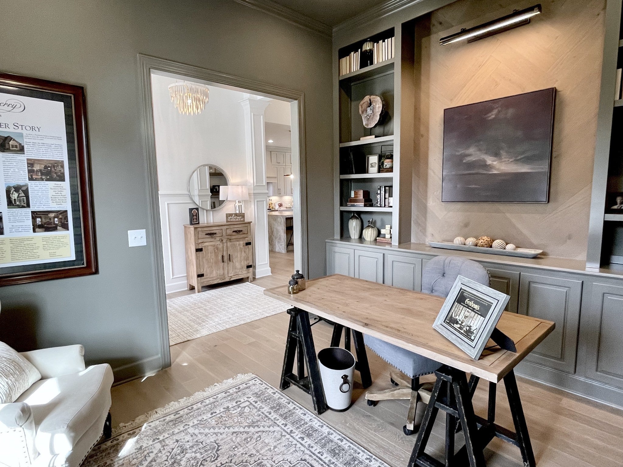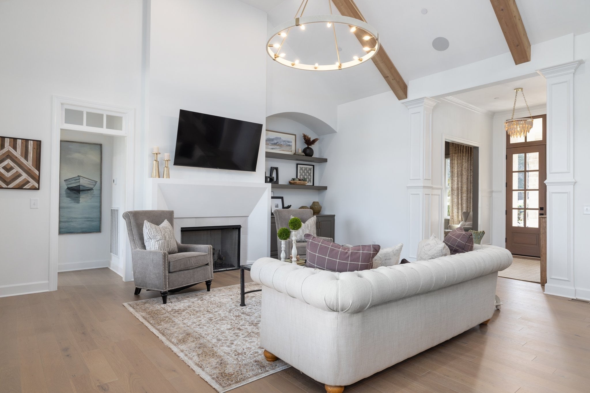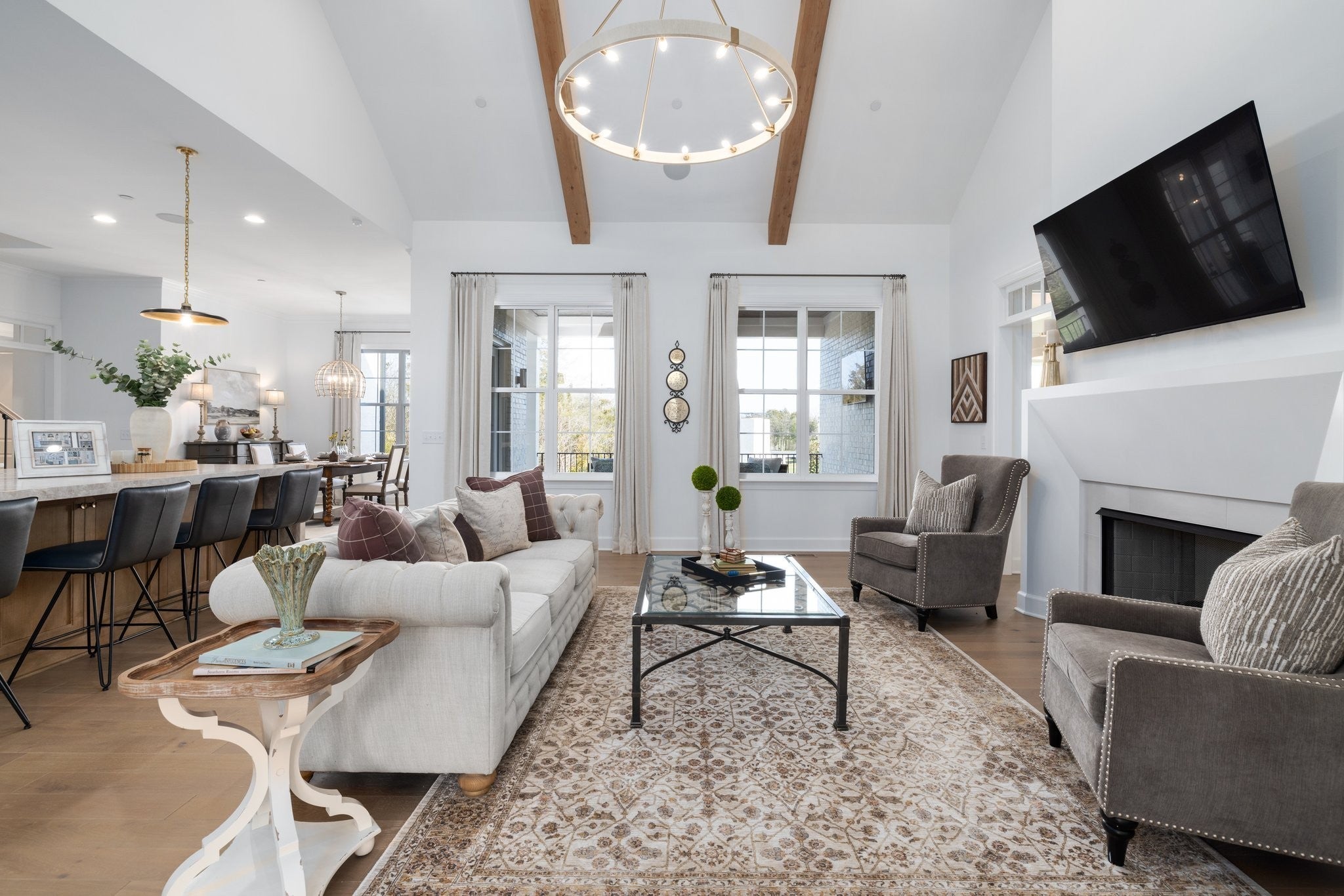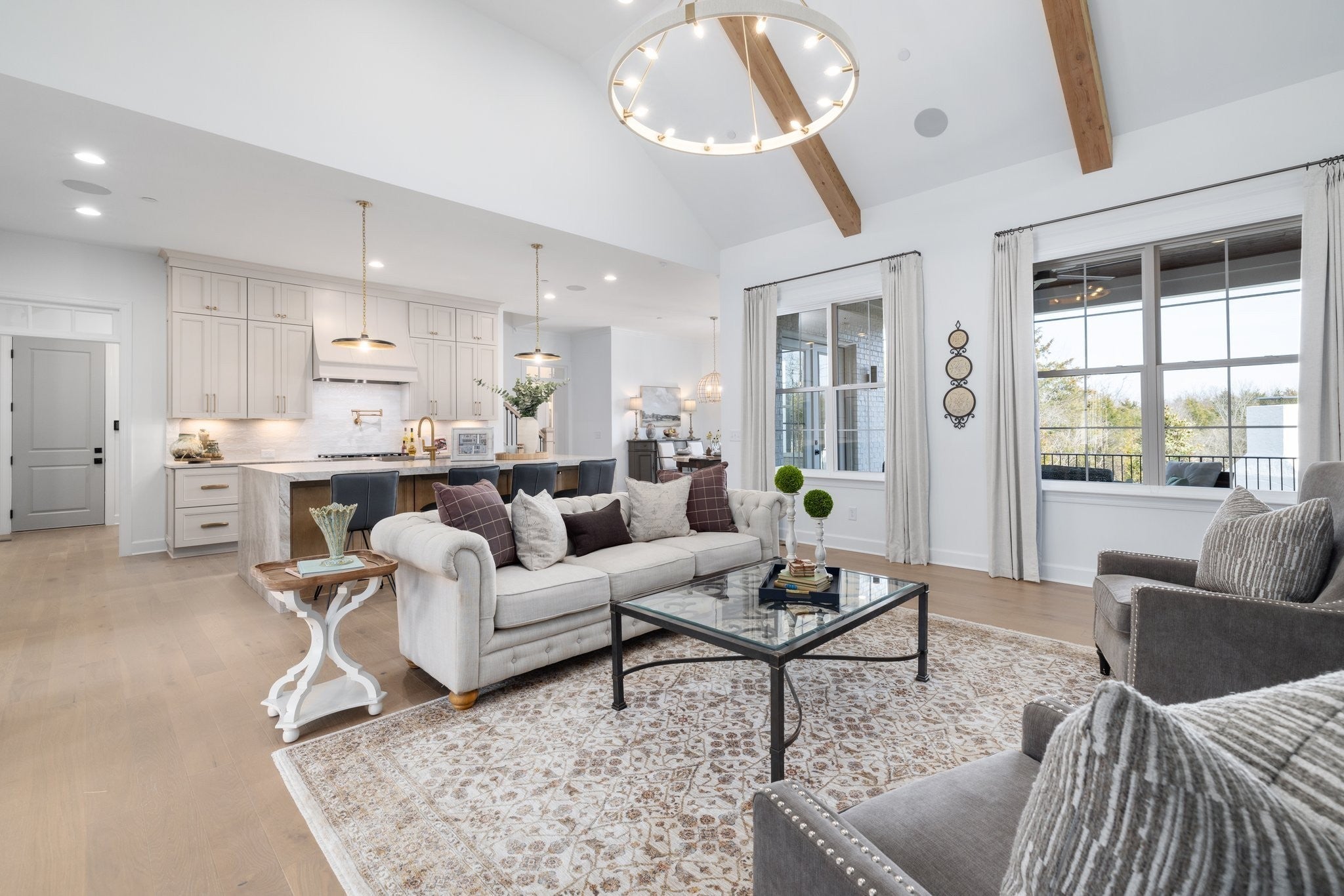 Experience exceptional craftsmanship and easy, elevated living in this beautifully designed Turnberry model home featuring an open floorplan with mostly one-level living. Stunning designer lighting, curated finishes, and thoughtful architectural details define every inch of this impressive residence. The layout maximizes natural light, seamless flow, and everyday functionality—perfect for modern living and effortless entertaining. The main level offers true one-level convenience, with the primary living areas, study, kitchen, dining room, entertaining spaces, owner’s suite, and two additional guest suites all located on the first floor. Both main-level guest retreats feature private en-suite baths, walk-in closets, and hardwood floors, creating comfortable, luxurious spaces for family and visitors. Step outside to the inviting covered porch and stamped-concrete entertaining terrace, complete with a wood-burning fireplace—your ideal setting for morning coffee, outdoor dining, or unwinding by the fire at day’s end. Upstairs, enjoy a private guest retreat, a generous bonus room, and a hobby/flex room, offering endless versatility for recreation, guests, work, or creative pursuits. A large walk-in storage room provides exceptional convenience for seasonal items, décor, luggage, and more—easily accessible at the top of the staircase. Situated in a quiet and serene setting, yet just minutes to shopping, dining, and everyday conveniences, Pasadena is located within the Town of Nolensville but carries a Brentwood mailing address. BONUS: All window drapes, area rugs, appliances, and wall-mounted TVs remain.