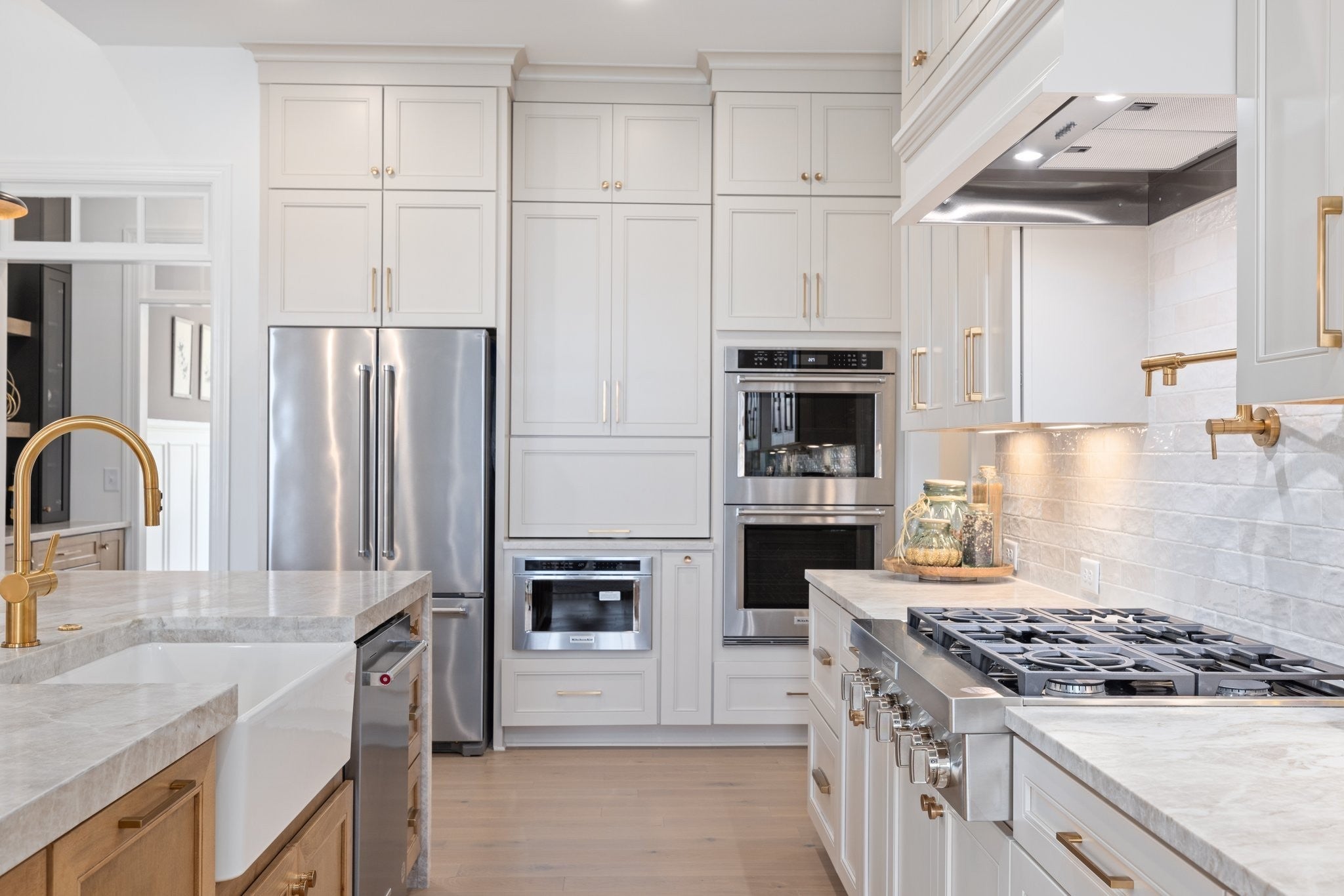 - Double Oven, Electric Oven, Built-In Gas Range, Dishwasher, Disposal, Microwave, Refrigerator, Stainless Steel Appliance(s)