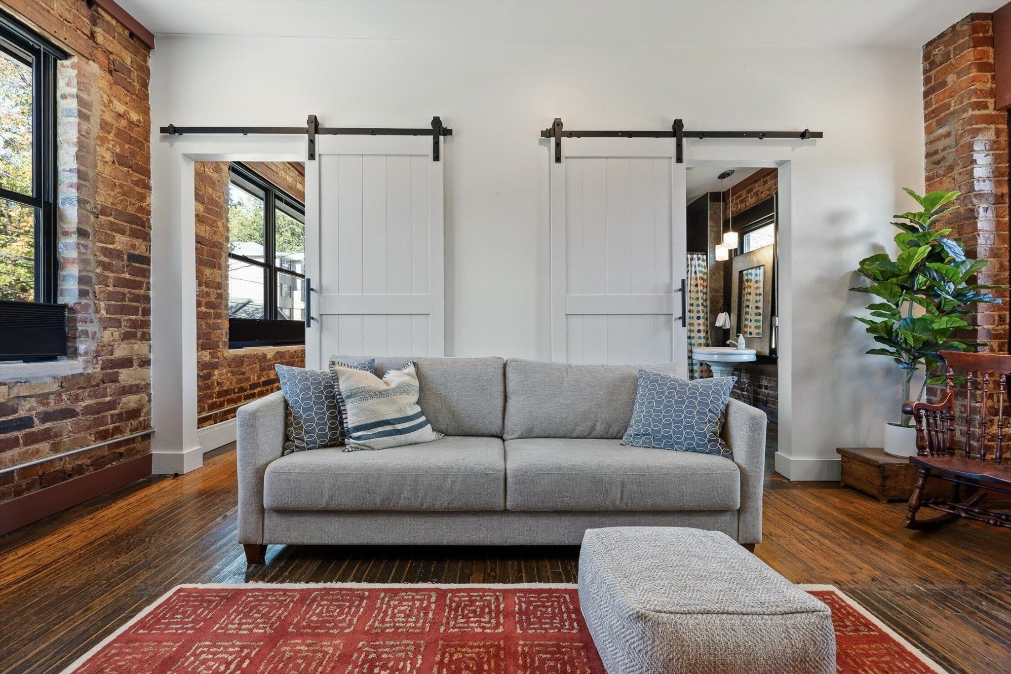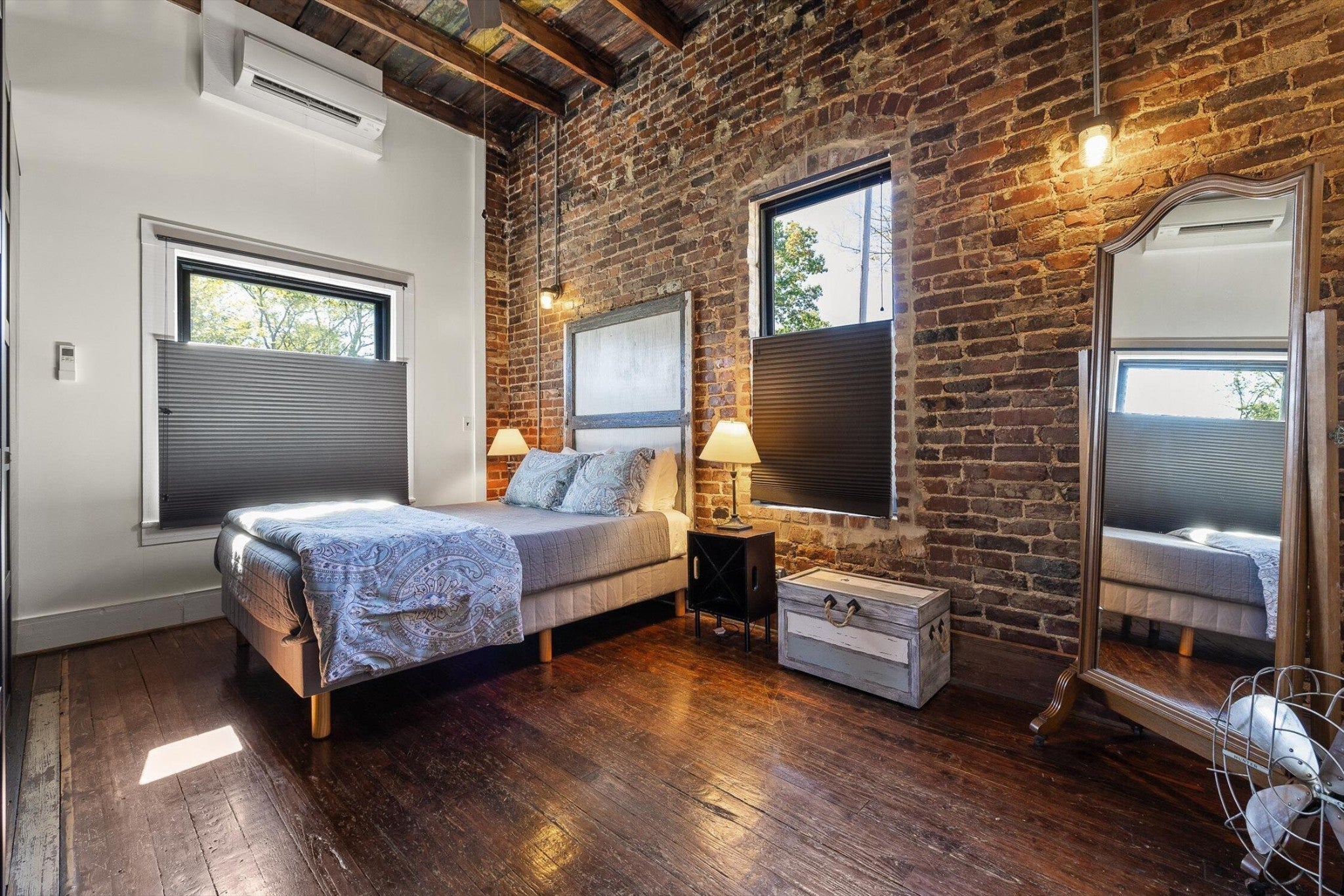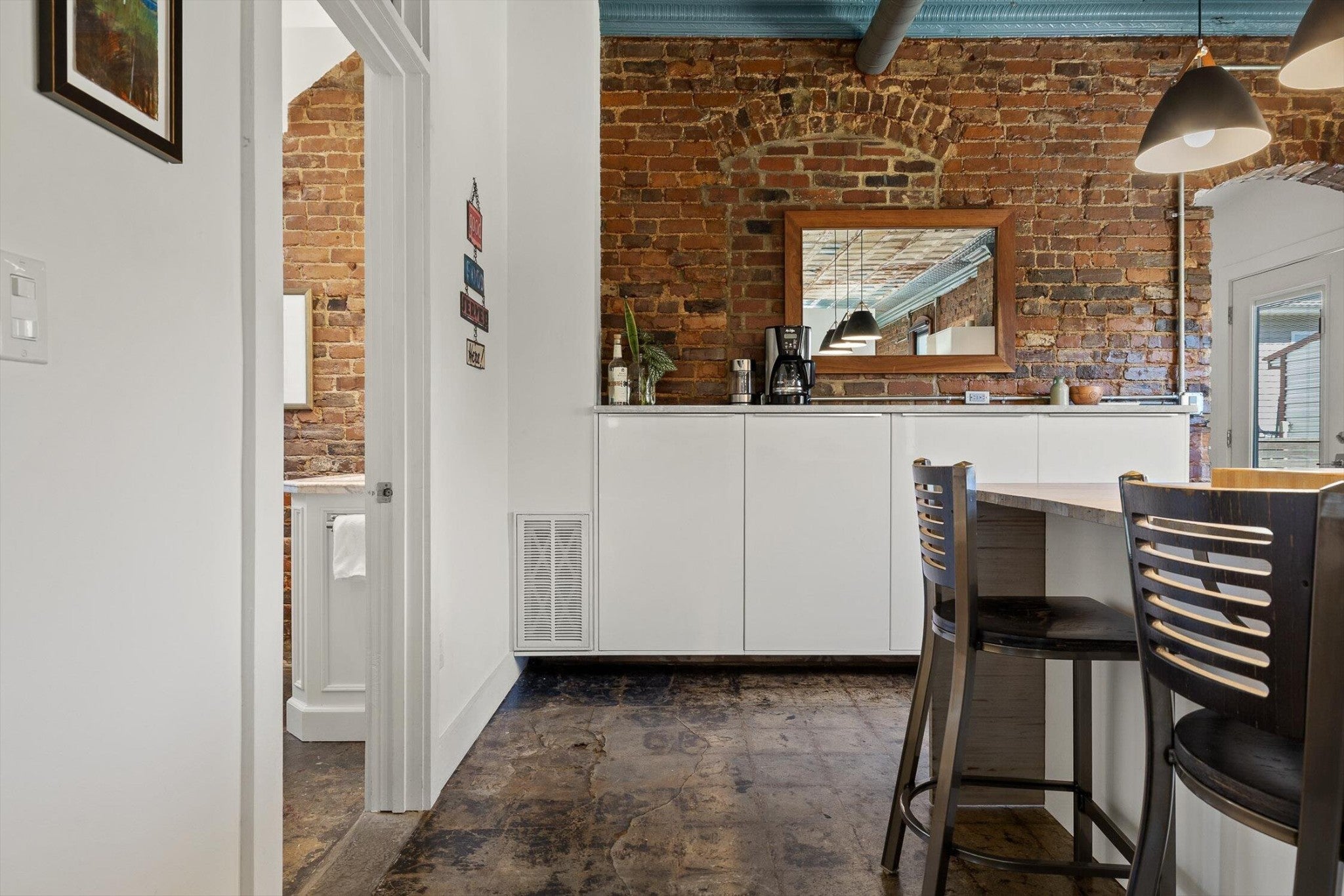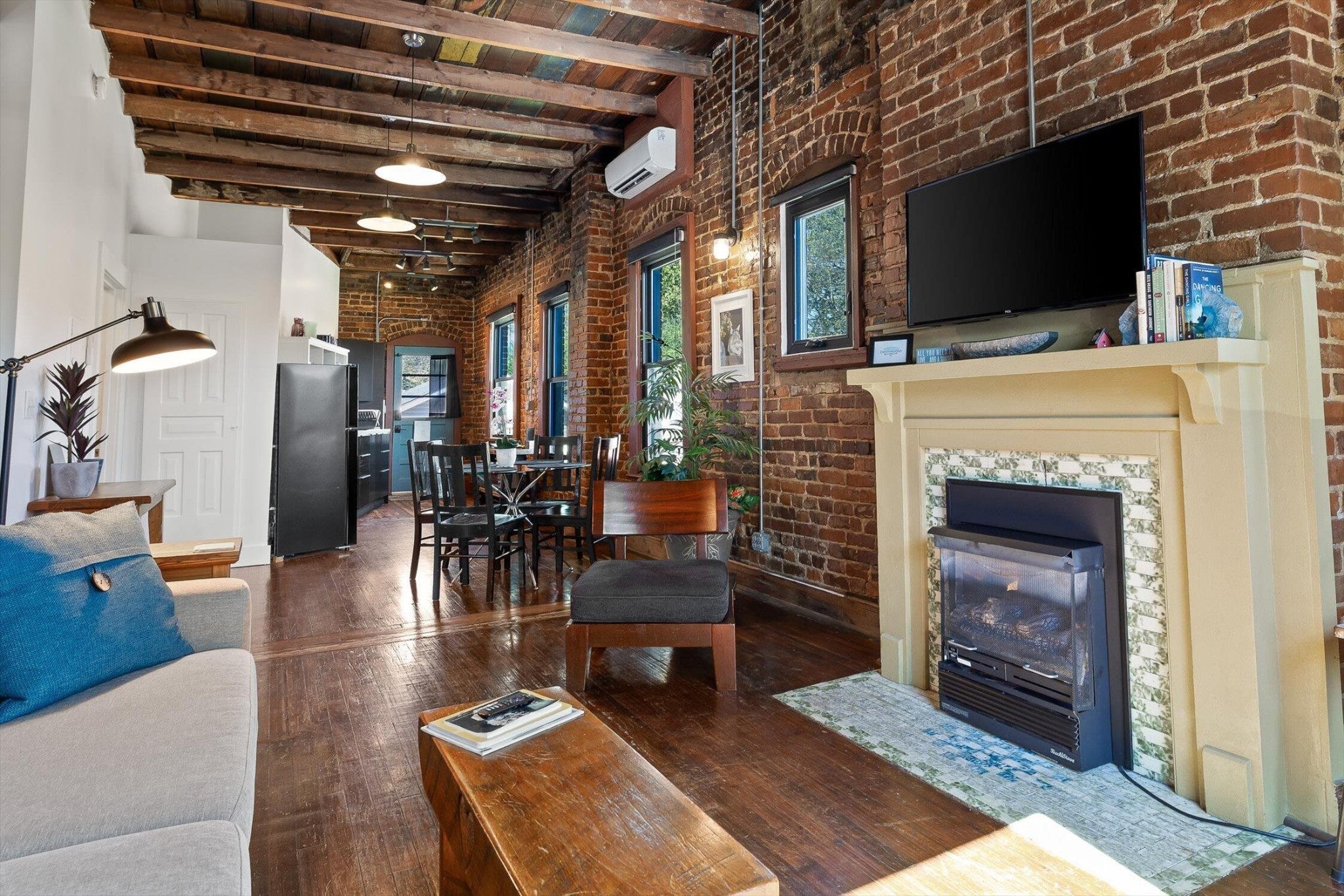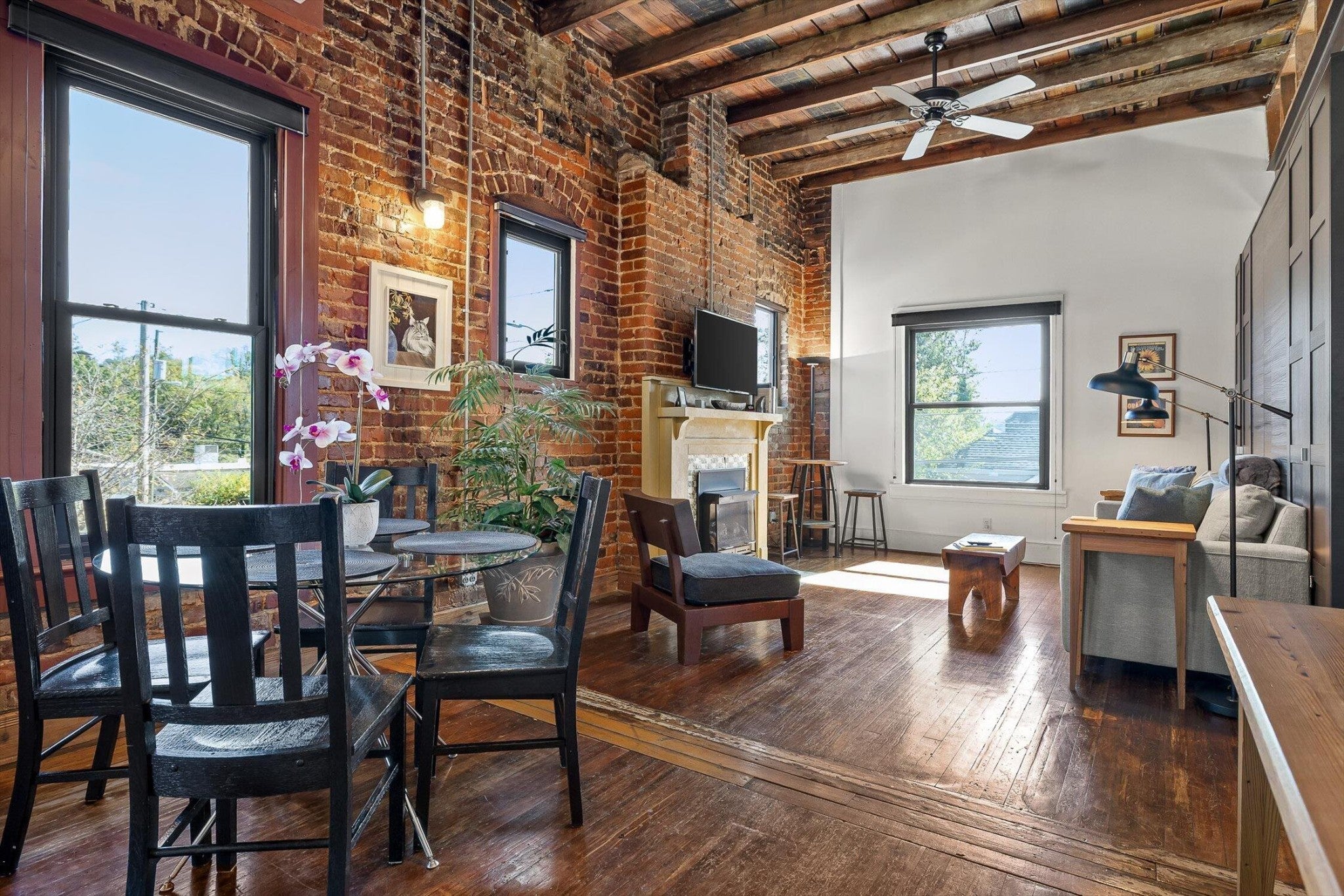 Discover an extraordinary investment property with this one-of-a-kind 1920s firehouse conversion located in the heart of North Chattanooga. Currently operating as two successful short-term rental units, with the potential for a third, this property blends historic charm with modern comfort and offers exceptional flexibility for both investors and owner-operators. The spacious main unit showcases original details including pressed tin ceilings, exposed brick walls, and polished concrete floors. It has been thoughtfully updated to provide comfort and style, featuring an open combined living and dining room, well appointed kitchen with bar seating, two bedrooms, including a main-level king suite with an immense walk-in closet and private bath, along with a half bath and laundry closet for guest convenience. Upstairs, guests enjoy a private sitting area with a second bedroom and full bath. The second unit is a private lock-out apartment accessible by exterior staircase, complete with a full kitchen, an open living room with fireplace detail, a large bedroom with oversized closet and laundry, and a custom bathroom with an expansive walk-in shower. This unit features original exposed beam ceiling and hardwood floors which merge beautifully with the modern sealed pebble flooring and fixtures. Throughout both levels, all lighting and plumbing fixtures have been chosen to accent the period and history of the property, while modern cabinetry, soaring ceilings, and efficient split units provide style and comfort. You will not find better storage anywhere in Chattanooga. A two-car garage with additional storage offers excellent potential for conversion into a third income-producing unit or studio, further enhancing revenue opportunities. Outdoor spaces are equally appealing, with a fully fenced and gated custom courtyard featuring an automatic gate, landscaped patio, and stone pathways that create a relaxing retreat for guests.