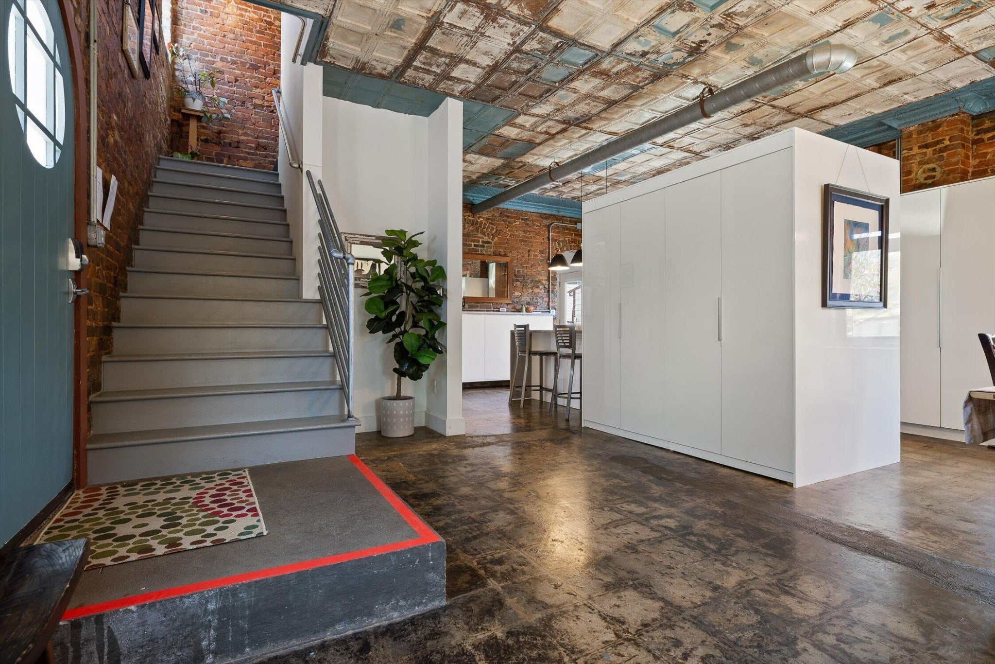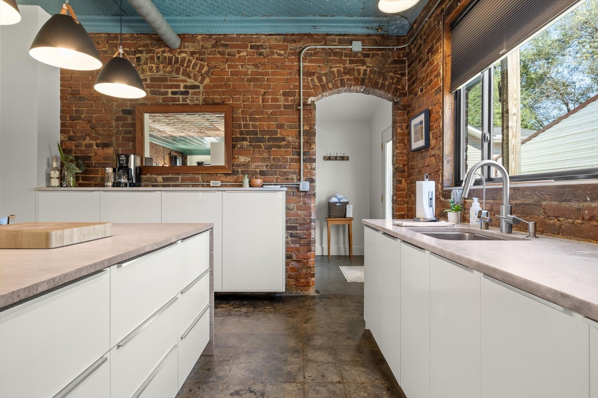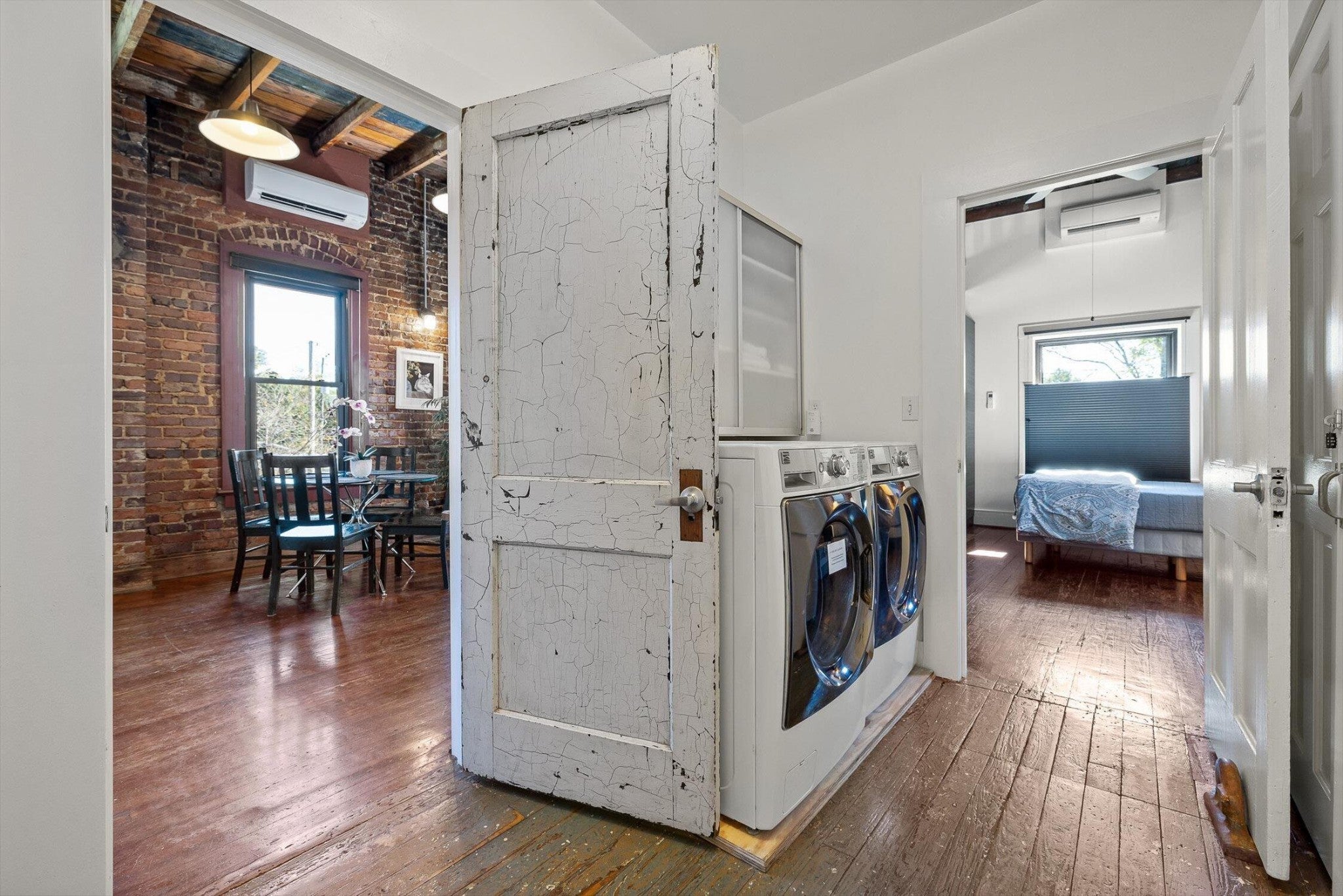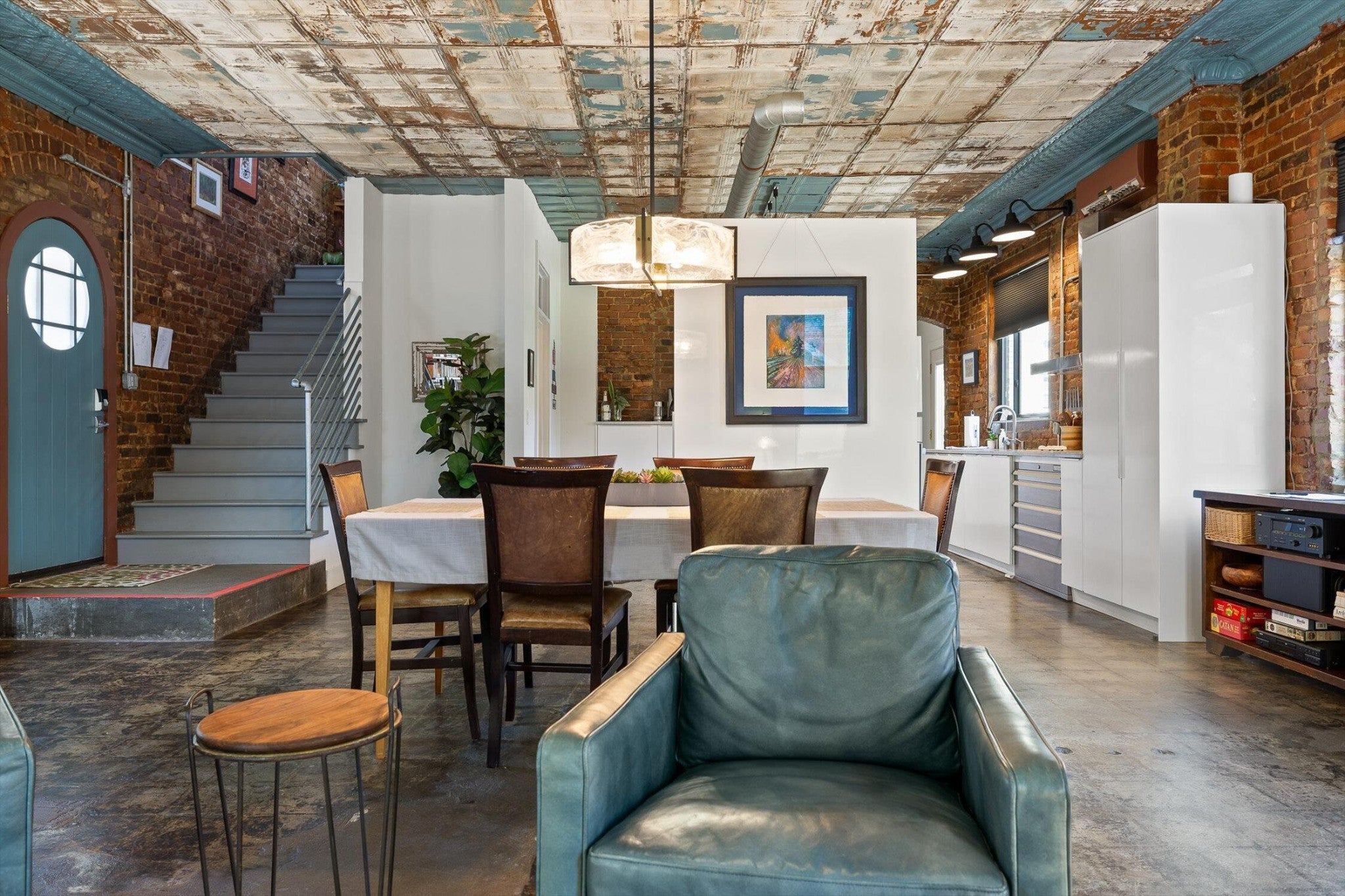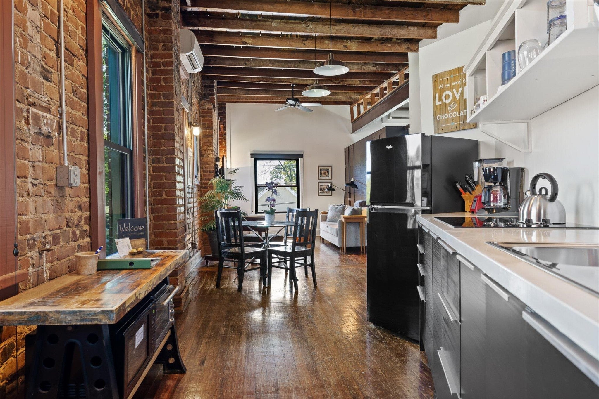 Discover an extraordinary investment property with this one-of-a-kind 1920s firehouse conversion located in the heart of North Chattanooga. Currently operating as two successful short-term rental units, with the potential for a third, this property blends historic charm with modern comfort and offers exceptional flexibility for both investors and owner-operators. The spacious main unit showcases original details including pressed tin ceilings, exposed brick walls, and polished concrete floors. It has been thoughtfully updated to provide comfort and style, featuring an open combined living and dining room, well appointed kitchen with bar seating, two bedrooms, including a main-level king suite with an immense walk-in closet and private bath, along with a half bath and laundry closet for guest convenience. Upstairs, guests enjoy a private sitting area with a second bedroom and full bath. The second unit is a private lock-out apartment accessible by exterior staircase, complete with a full kitchen, an open living room with fireplace detail, a large bedroom with oversized closet and laundry, and a custom bathroom with an expansive walk-in shower. This unit features original exposed beam ceiling and hardwood floors which merge beautifully with the modern sealed pebble flooring and fixtures. Throughout both levels, all lighting and plumbing fixtures have been chosen to accent the period and history of the property, while modern cabinetry, soaring ceilings, and efficient split units provide style and comfort. You will not find better storage anywhere in Chattanooga. A two-car garage with additional storage offers excellent potential for conversion into a third income-producing unit or studio, further enhancing revenue opportunities. Outdoor spaces are equally appealing, with a fully fenced and gated custom courtyard featuring an automatic gate, landscaped patio, and stone pathways that create a relaxing retreat for guests.
