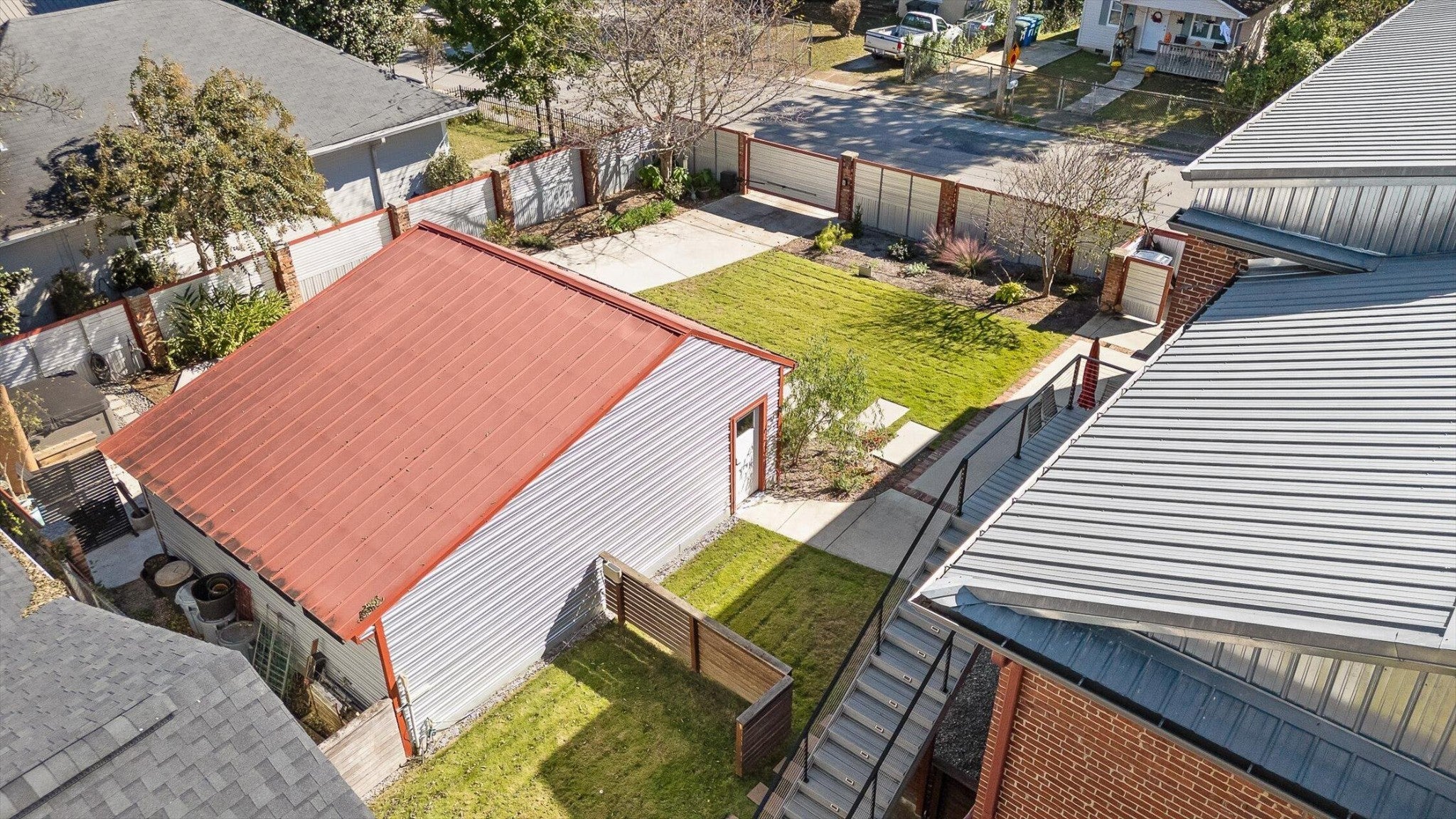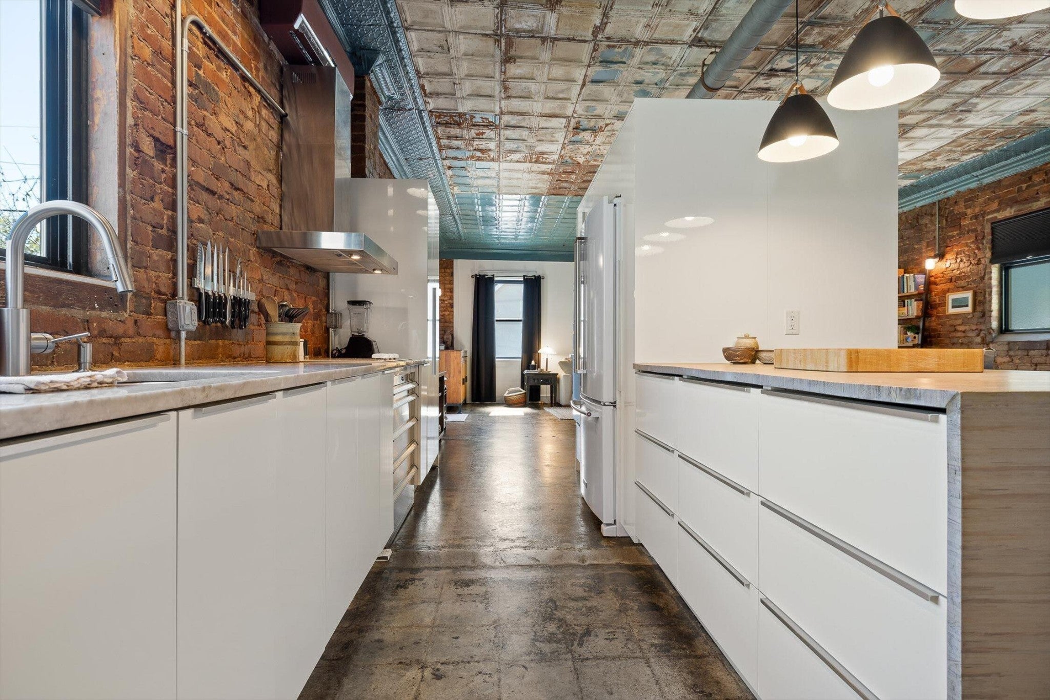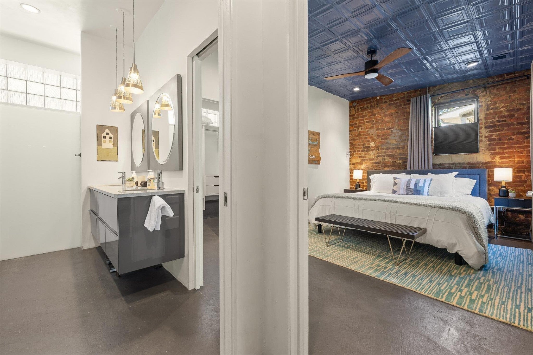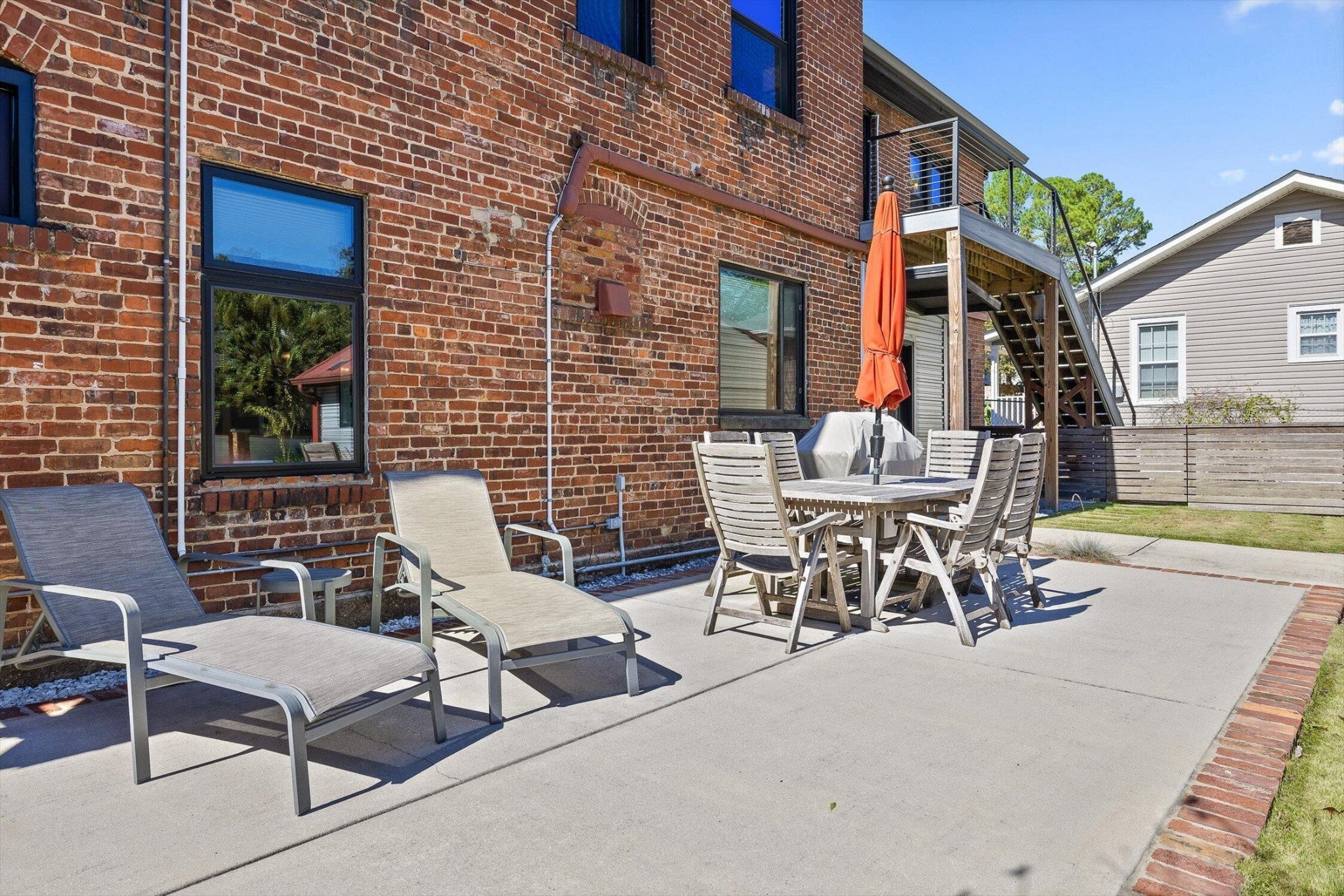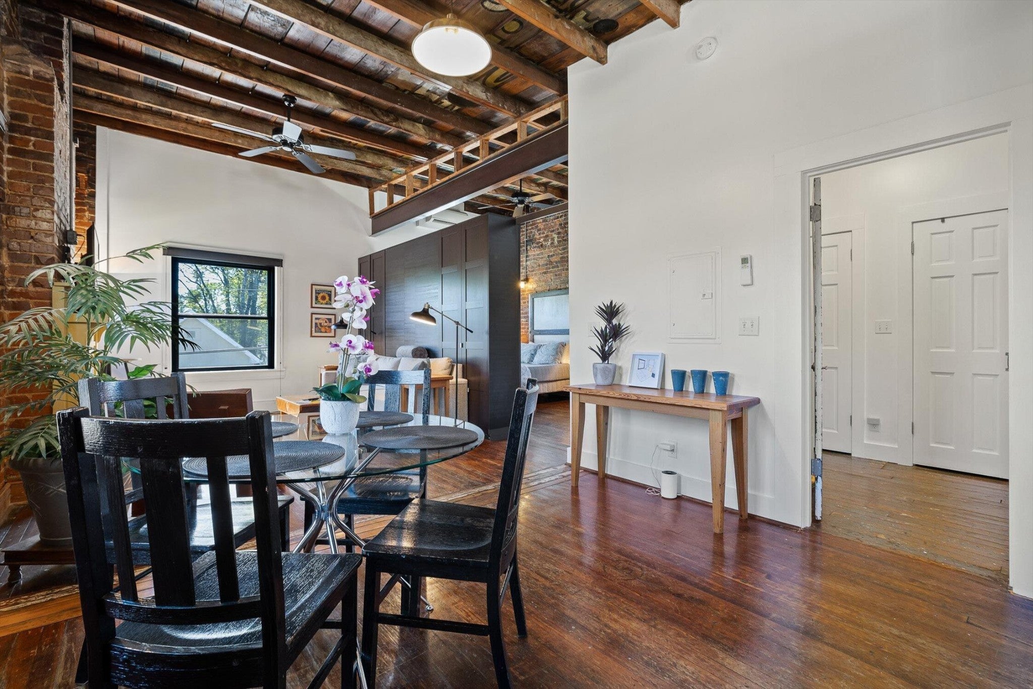 Discover an extraordinary investment property with this one-of-a-kind 1920s firehouse conversion located in the heart of North Chattanooga. Currently operating as two successful short-term rental units, with the potential for a third, this property blends historic charm with modern comfort and offers exceptional flexibility for both investors and owner-operators. The spacious main unit showcases original details including pressed tin ceilings, exposed brick walls, and polished concrete floors. It has been thoughtfully updated to provide comfort and style, featuring an open combined living and dining room, well appointed kitchen with bar seating, two bedrooms, including a main-level king suite with an immense walk-in closet and private bath, along with a half bath and laundry closet for guest convenience. Upstairs, guests enjoy a private sitting area with a second bedroom and full bath. The second unit is a private lock-out apartment accessible by exterior staircase, complete with a full kitchen, an open living room with fireplace detail, a large bedroom with oversized closet and laundry, and a custom bathroom with an expansive walk-in shower. This unit features original exposed beam ceiling and hardwood floors which merge beautifully with the modern sealed pebble flooring and fixtures. Throughout both levels, all lighting and plumbing fixtures have been chosen to accent the period and history of the property, while modern cabinetry, soaring ceilings, and efficient split units provide style and comfort. You will not find better storage anywhere in Chattanooga. A two-car garage with additional storage offers excellent potential for conversion into a third income-producing unit or studio, further enhancing revenue opportunities. Outdoor spaces are equally appealing, with a fully fenced and gated custom courtyard featuring an automatic gate, landscaped patio, and stone pathways that create a relaxing retreat for guests.