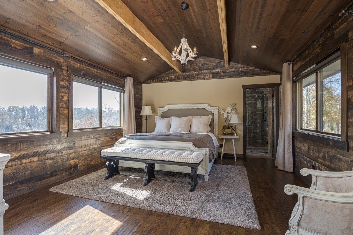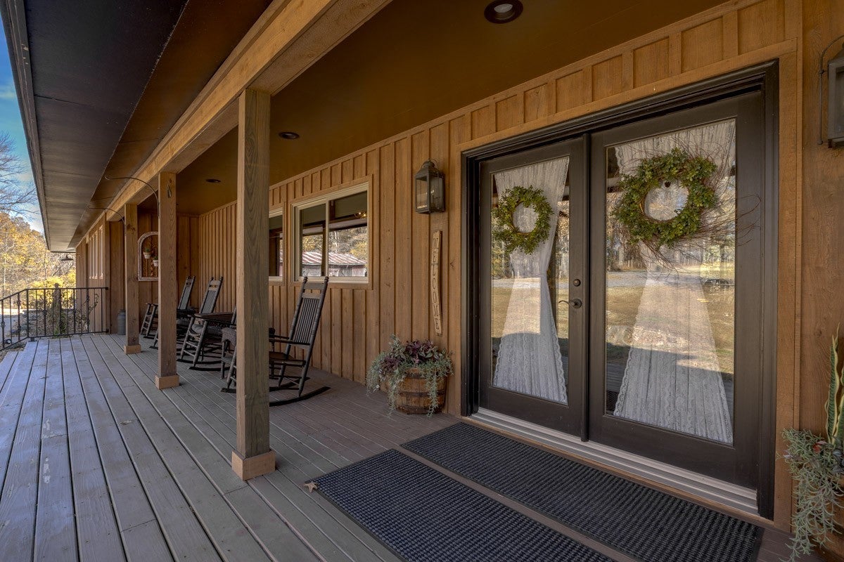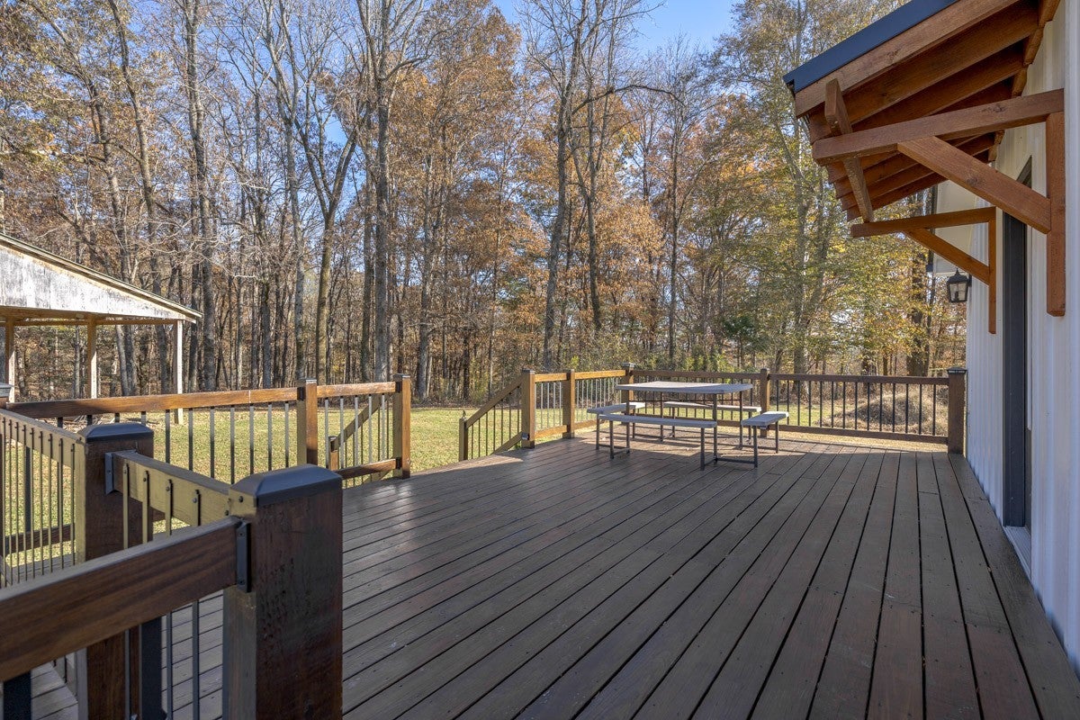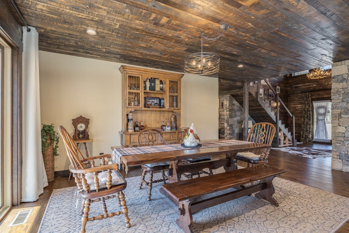 This property delivers a pair of well-built, updated living spaces in Lynchburg TN. The main residence offers approximately 2900 square feet under air, with an additional walkout basement of roughly 1140 square feet. Exterior construction blends white cypress siding on the first level with hardy board on the second level. Custom hog wire and wrought iron railings frame the wraparound upper deck, and the roof was replaced in 2018. Inside, the home features spray foam insulation within 6-inch walls and a full finish of Northern Lights Barnwood pine sourced from Duluth MN. Floors are White Oak from the Boulder Mountain Series by Shaw. Custom black iron curtain rods, insulated drapery, LED retrofit lighting, dimmers, and solar shades contribute to comfort and efficiency. A real stone wood-burning fireplace anchors the living area. The kitchen features custom distressed Showplace Cabinetry installed by Maurice’s Fine Furnishings. The oversized 11 by 4 foot island provides bar-height seating, and the chiseled-edge granite counters complement the reclaimed White Oak range hood. Appliances include a 48 inch Thor stainless dual fuel range. A Kohler apron sink, bridge faucet, and pot filler complete the workspace. Half-brick veneer extends to the vaulted ceiling behind the range. Bathrooms include porcelain tile floors and shower walls, custom vanities from foxdendecor.com, copper sinks, Delta shower fixtures, Moen faucets, glass enclosures, and a porcelain clawfoot tub in the primary suite. The guest cottage adds approximately 1380 square feet of newly updated space. A new roof, structural addition, and remodel were completed in 2023 and 2024. New front and rear decks extend outdoor living space, while original white oak floors were refinished to match additions. Interior updates include a half-brick accent wall, barnwood accents, porcelain tile flooring in the bathroom, ceramic shower walls with glass enclosure.