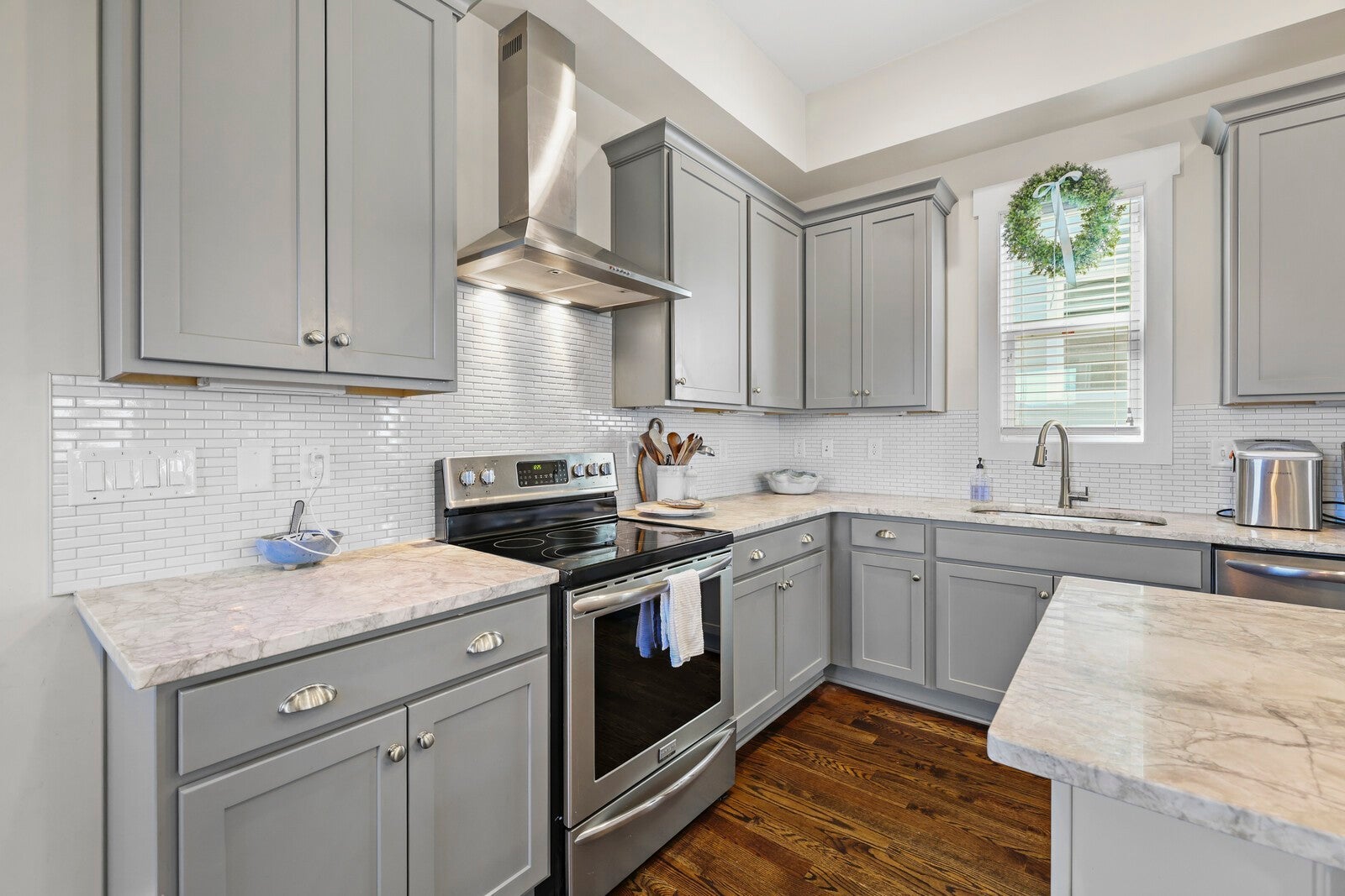 - Built-In Electric Range, Dishwasher, Disposal, Dryer, Microwave, Refrigerator, Stainless Steel Appliance(s), Washer