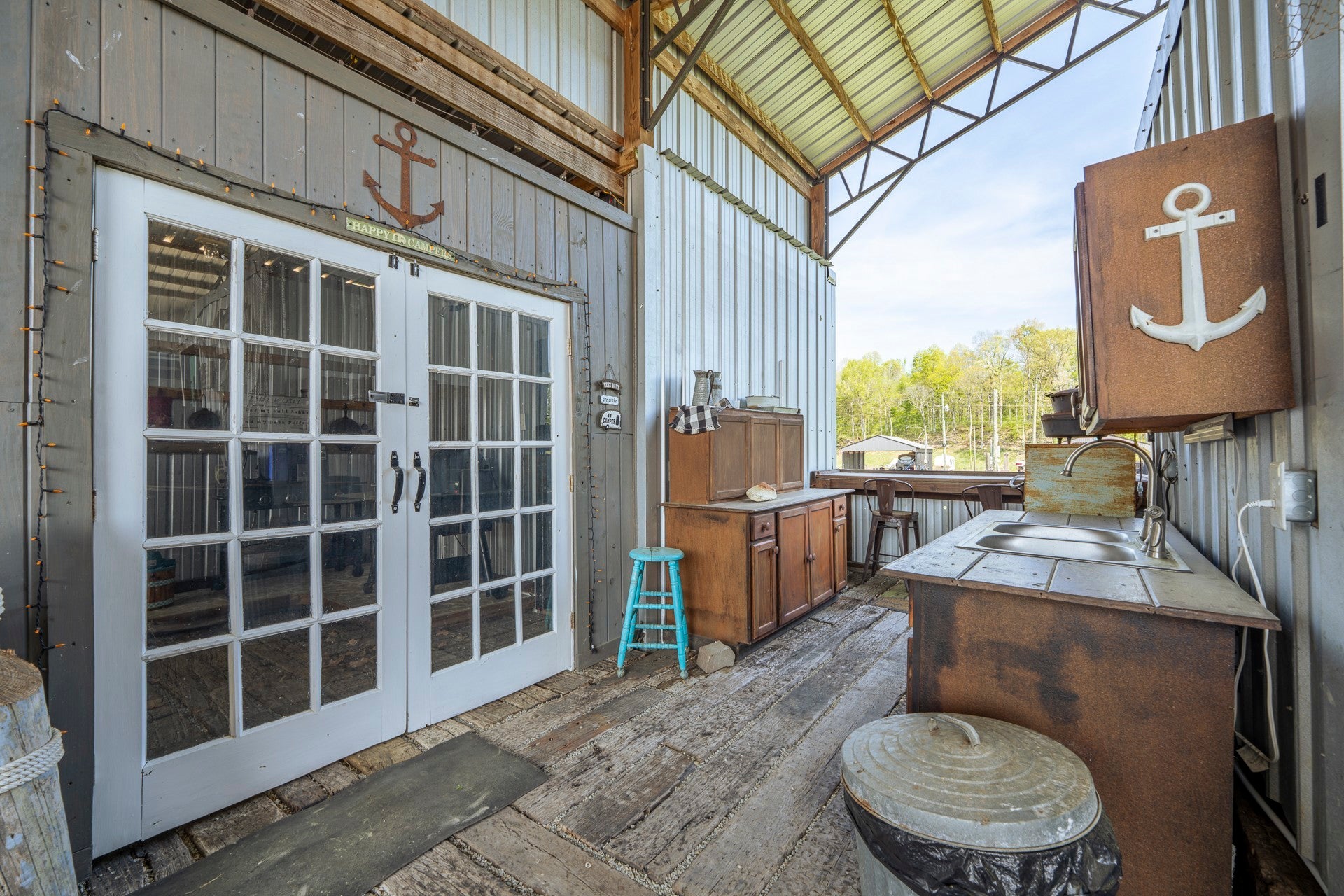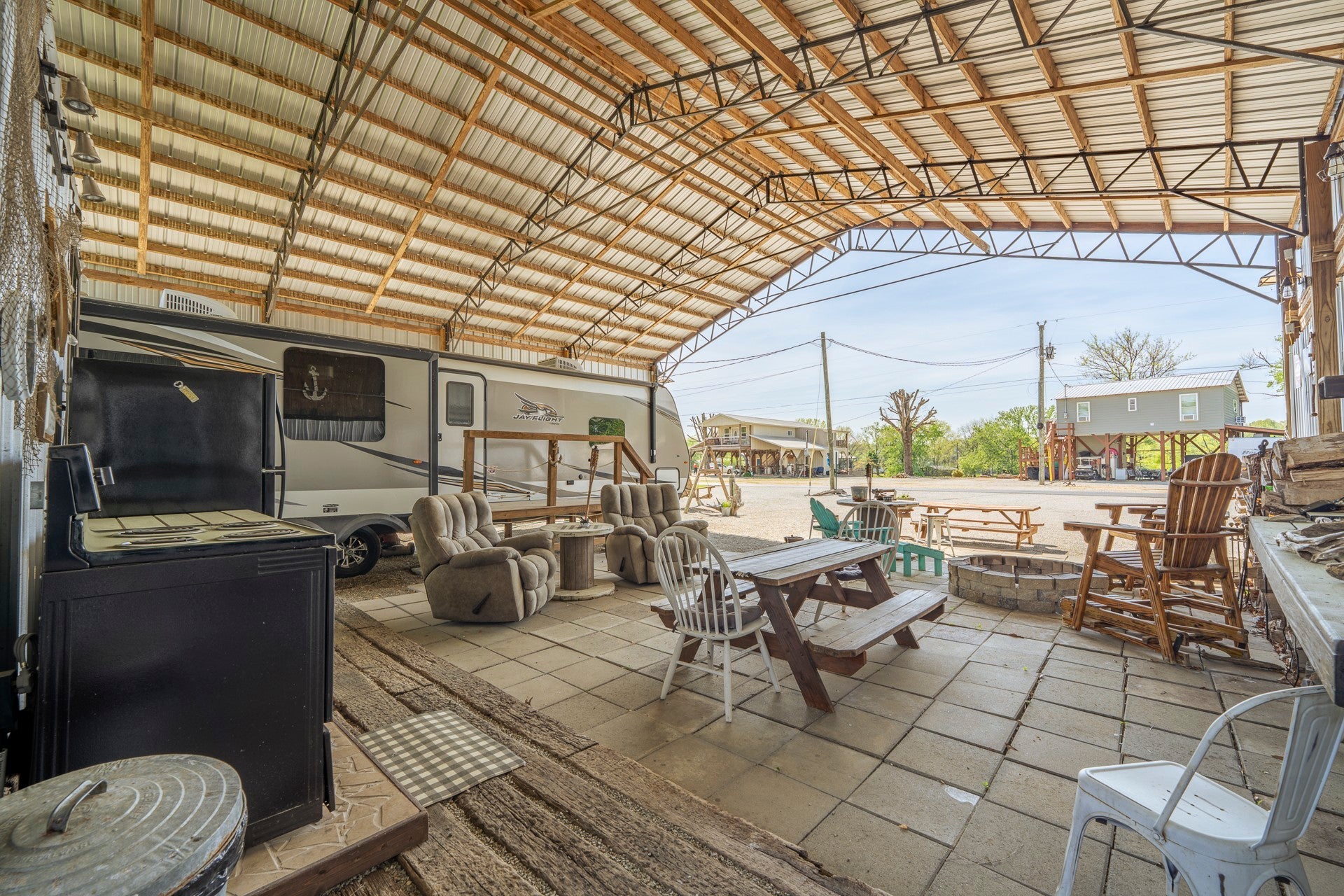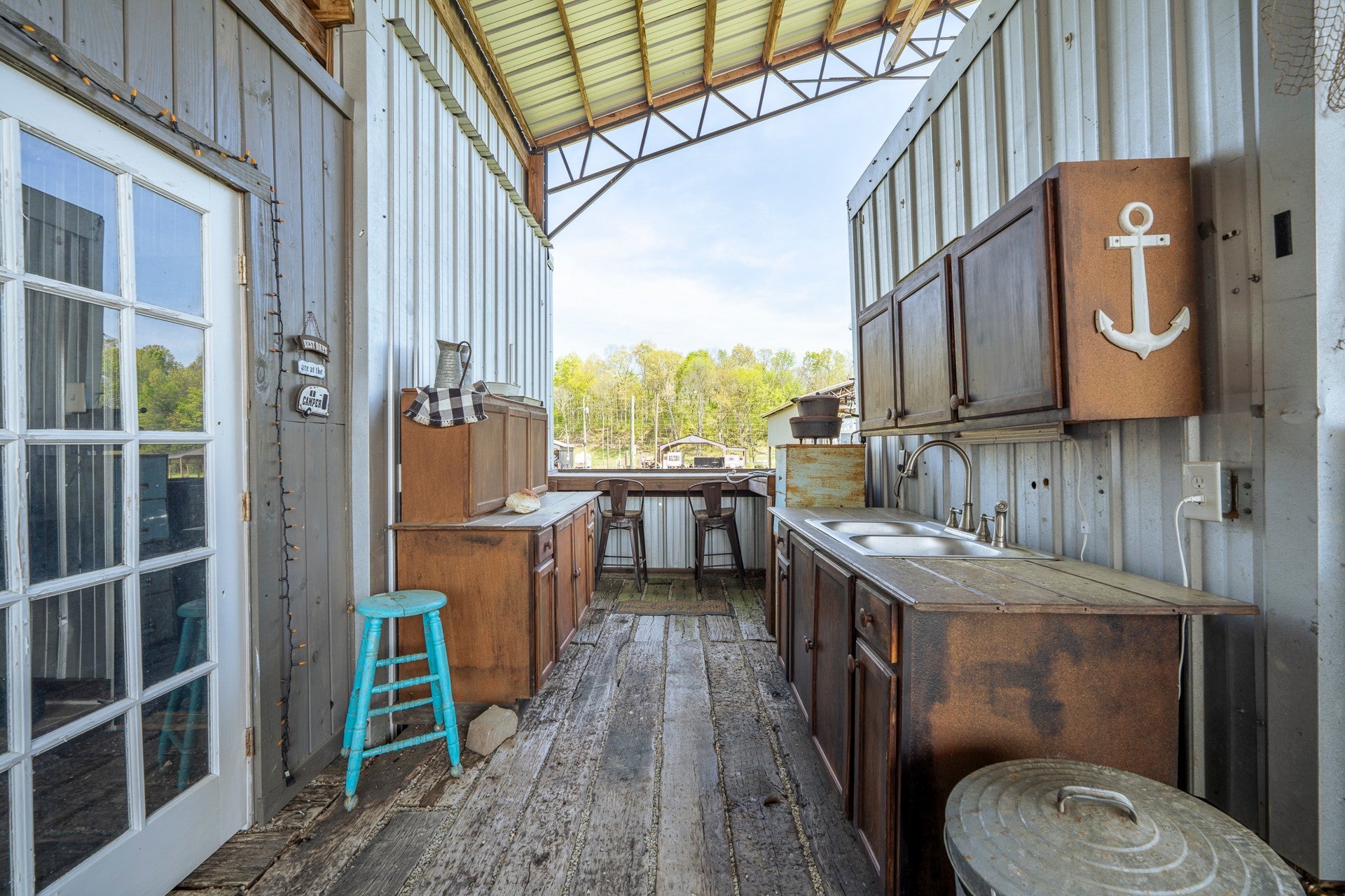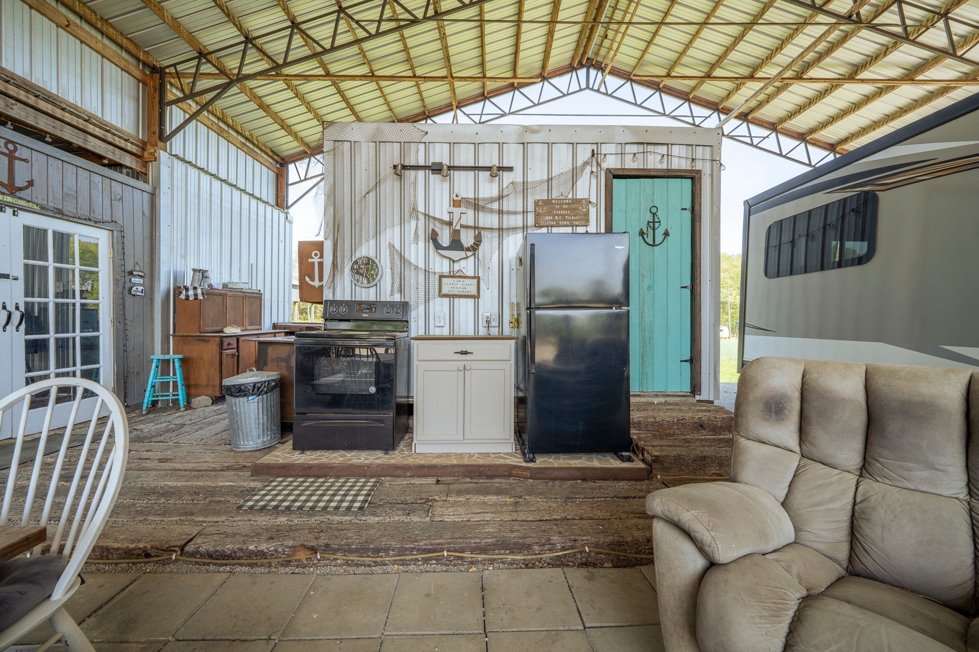 One of a kind property built on 2 lots ! Outdoor living at it's best with 2600 sq ft under roof! House your RV with a full size outdoor kitchen plus a bar area, enclosed laundry and full bath, and a workshop/garage area with an air compressor! Additional carport cover for another vehicle. Privacy galore and tastefully decorated with a river view! The seller incorporated 100 yr old barn wood and metal plus railroad ties and French doors for a rustic style. Cook, grill, watch TV, tinker with your car, ATV or boat, hang out at the bar or host a party all under one roof! Beechview is a highly popular gated community on the TN River halfway between Nashville and Memphis. Close to golf and marinas. City water and paved roads. Furniture is included with the price. This one is move in ready! Camper is not included in the listing price but can be purchased outside of real estate.