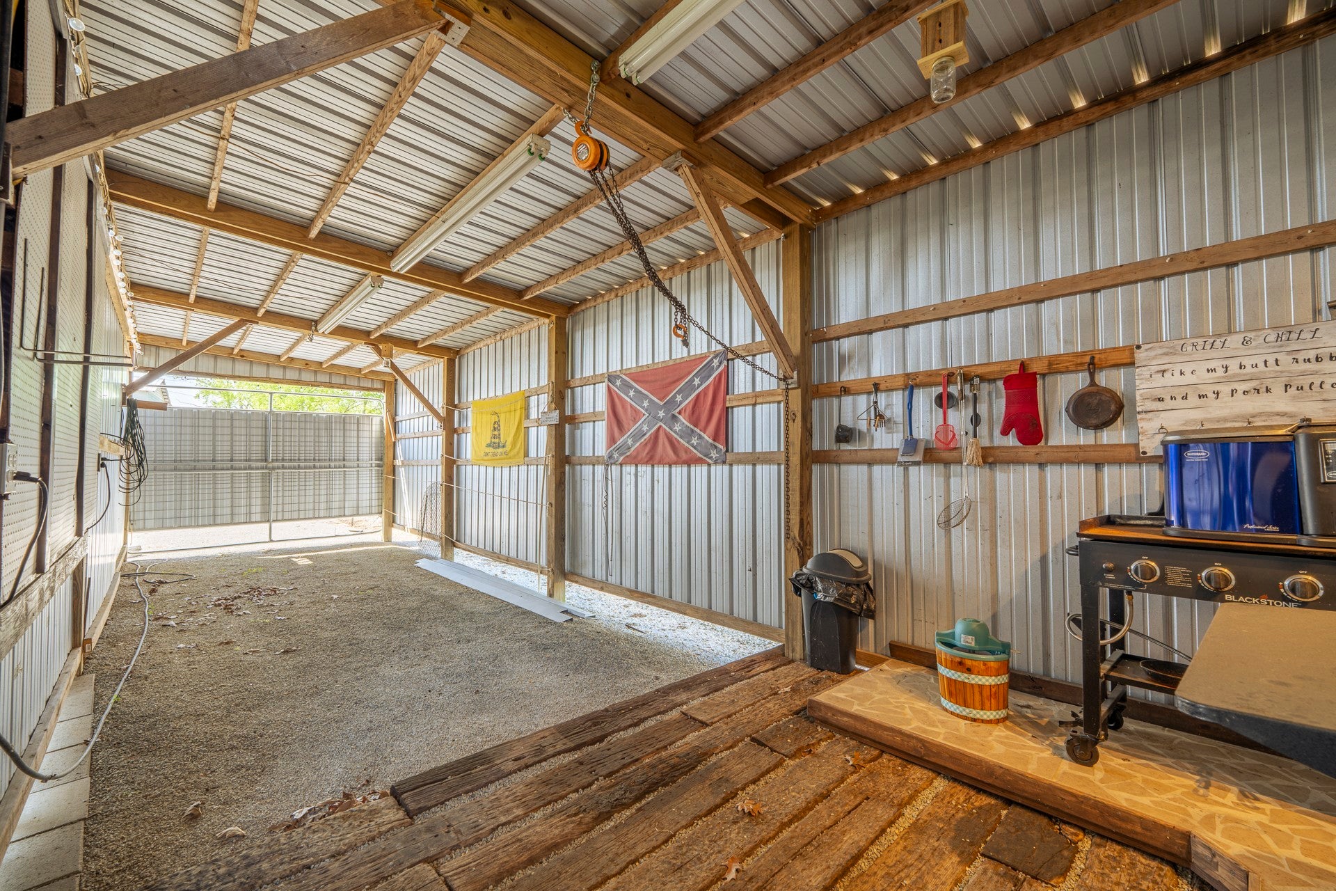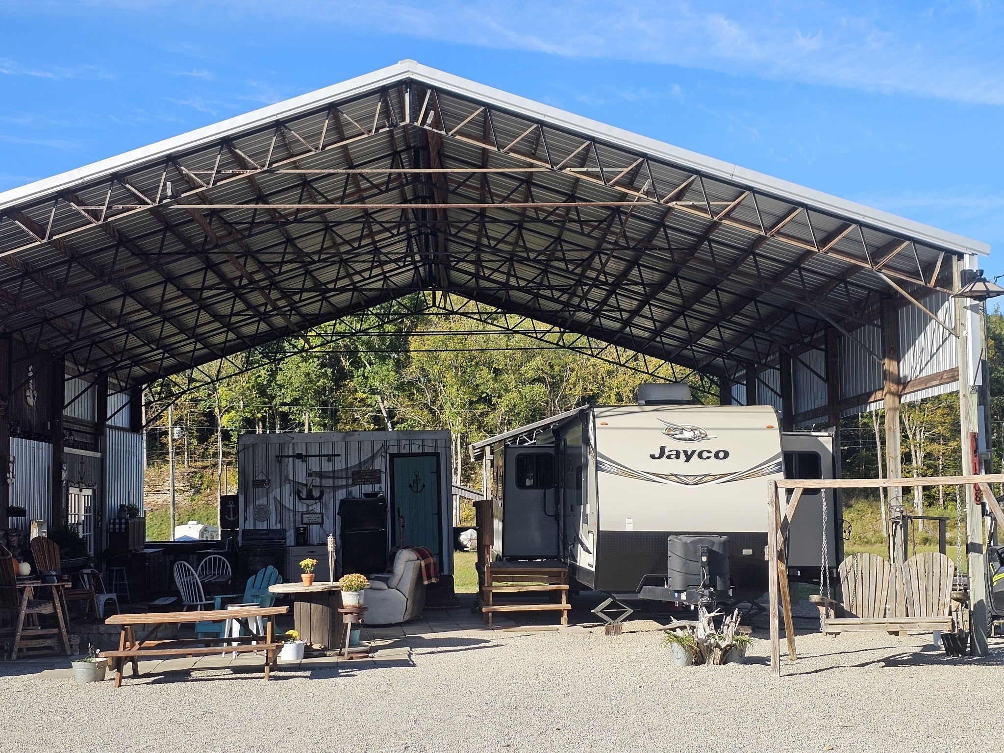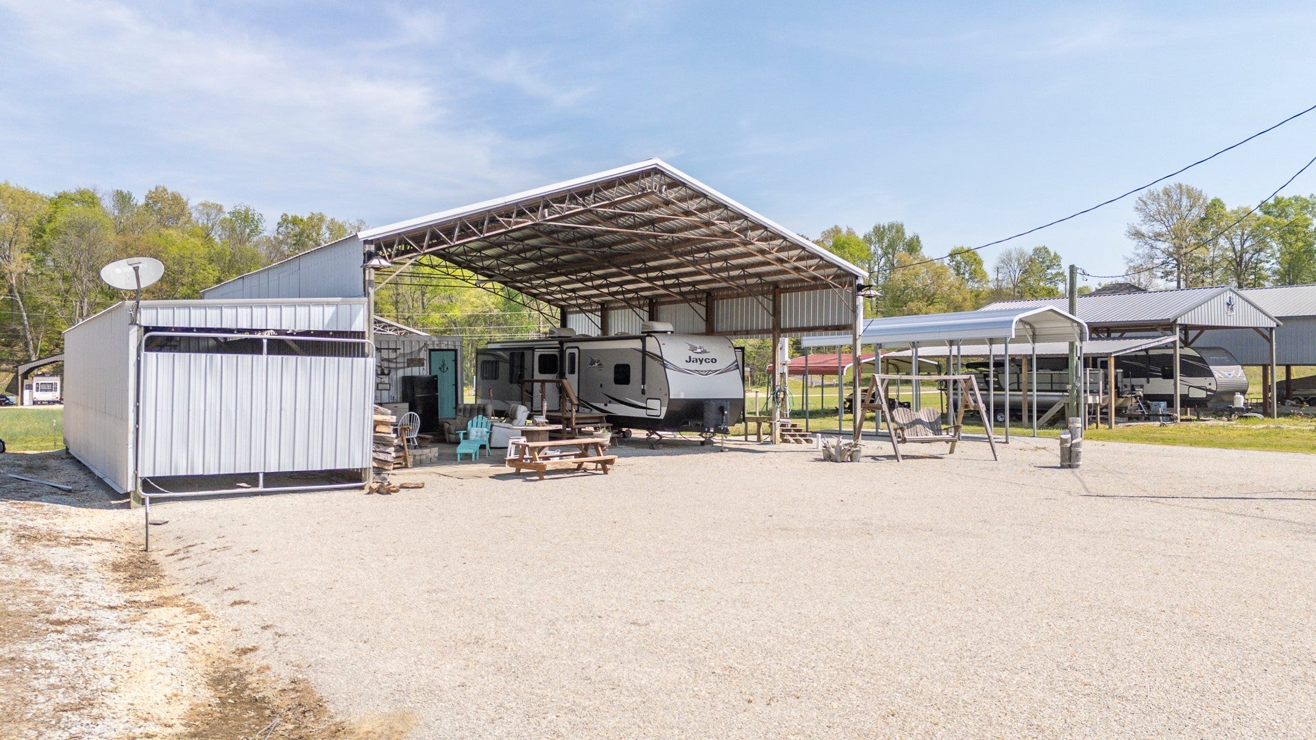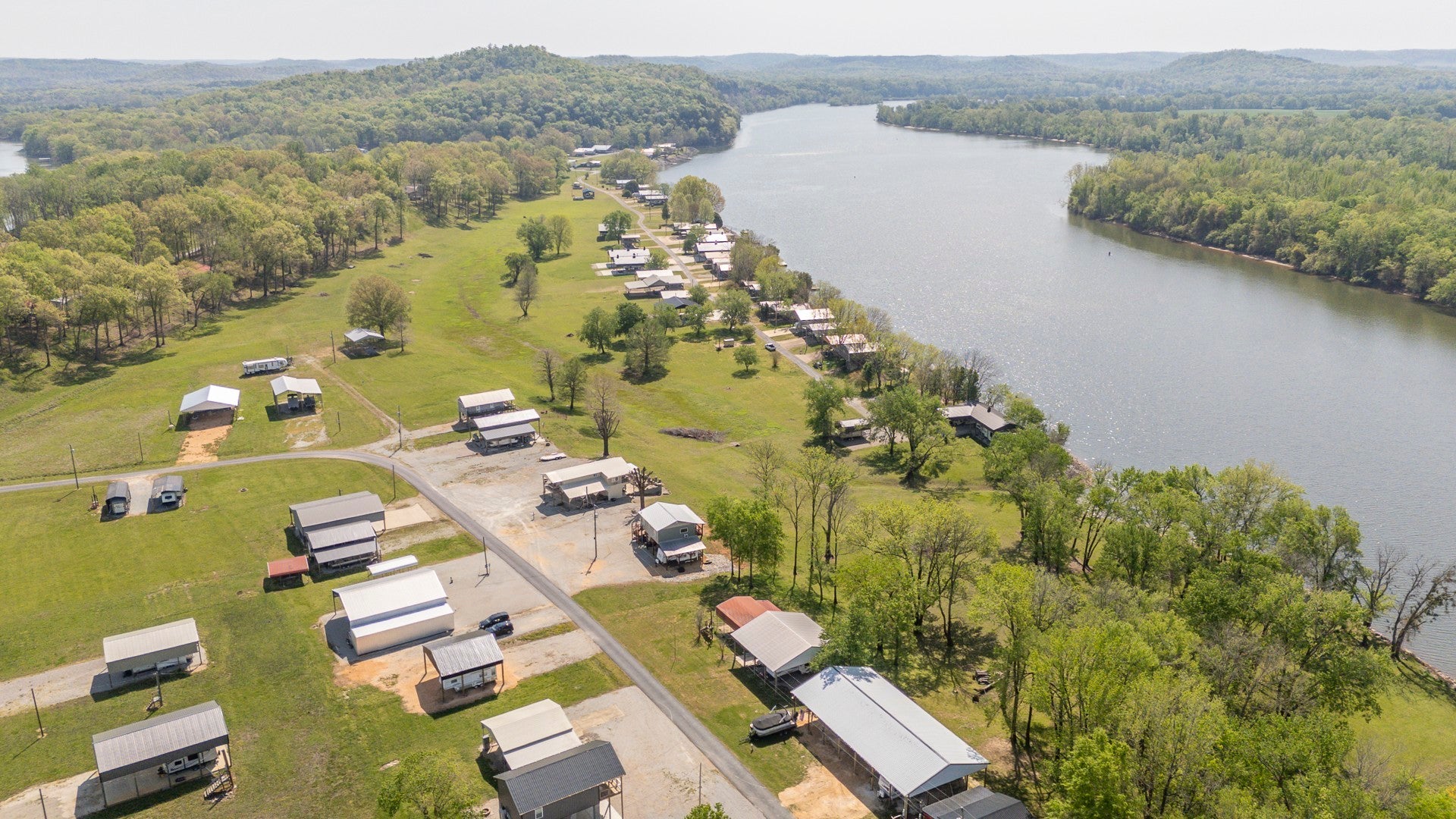 One of a kind property built on 2 lots ! Outdoor living at it's best with 2600 sq ft under roof! House your RV with a full size outdoor kitchen plus a bar area, enclosed laundry and full bath, and a workshop/garage area with an air compressor! Additional carport cover for another vehicle. Privacy galore and tastefully decorated with a river view! The seller incorporated 100 yr old barn wood and metal plus railroad ties and French doors for a rustic style. Cook, grill, watch TV, tinker with your car, ATV or boat, hang out at the bar or host a party all under one roof! Beechview is a highly popular gated community on the TN River halfway between Nashville and Memphis. Close to golf and marinas. City water and paved roads. Furniture is included with the price. This one is move in ready! Camper is not included in the listing price but can be purchased outside of real estate.