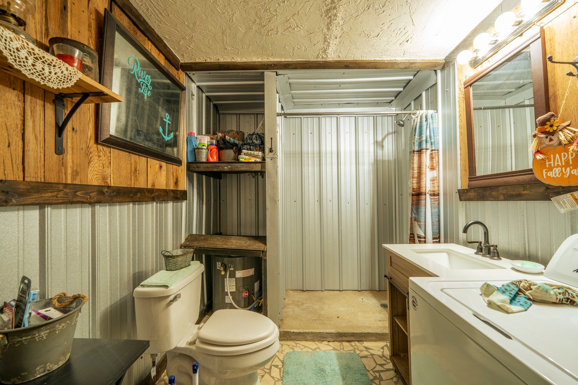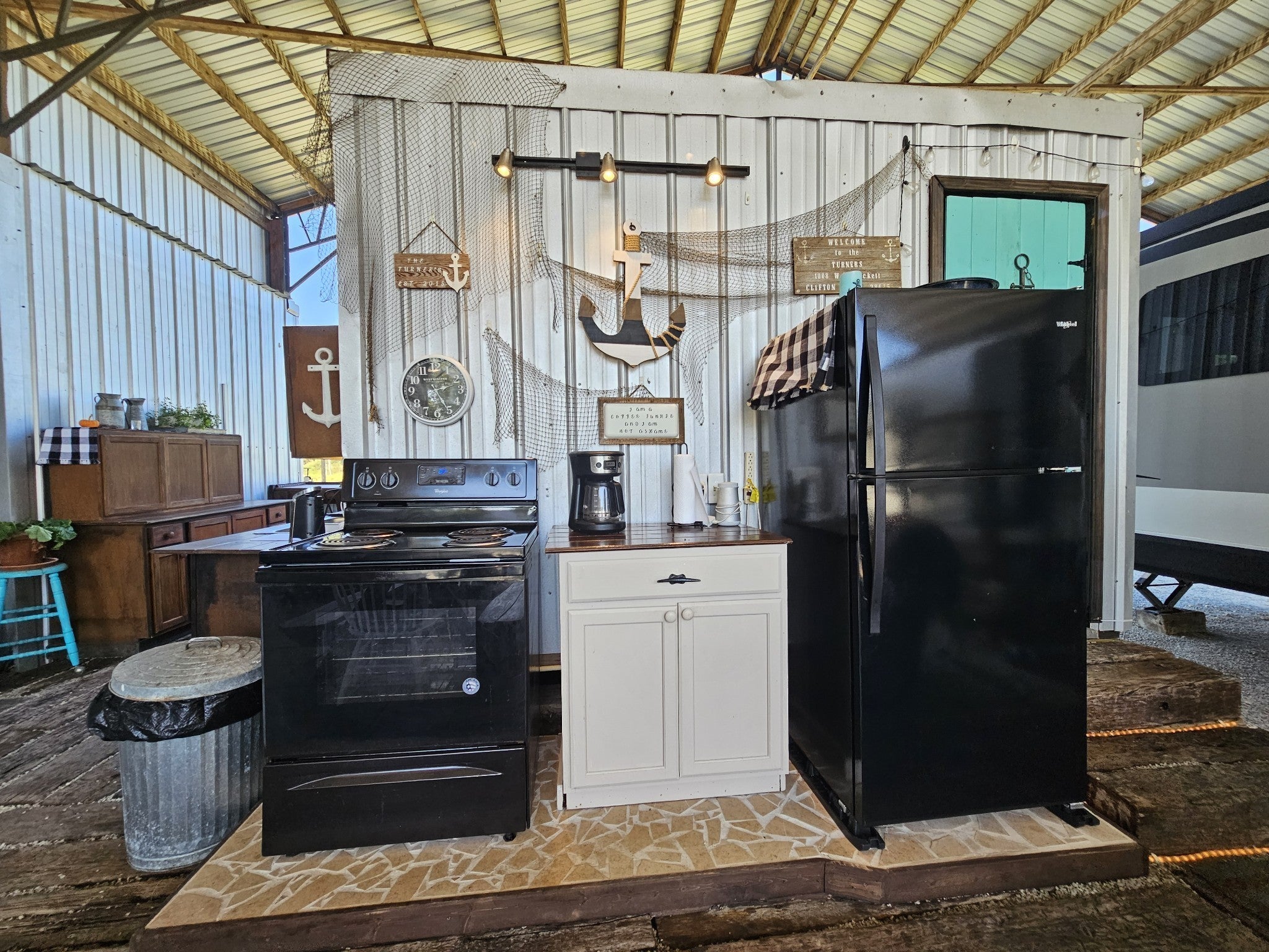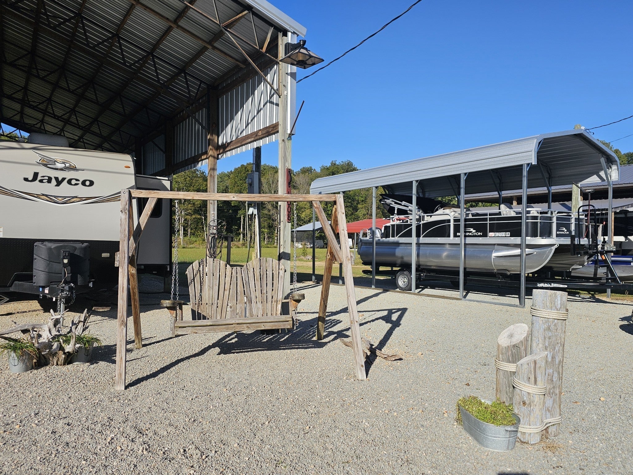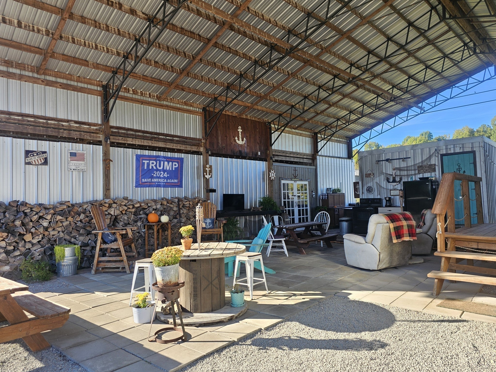One of a kind property built on 2 lots ! Outdoor living at it's best with 2600 sq ft under roof! House your RV with a full size outdoor kitchen plus a bar area, enclosed laundry and full bath, and a workshop/garage area with an air compressor! Additional carport cover for another vehicle. Privacy galore and tastefully decorated with a river view! The seller incorporated 100 yr old barn wood and metal plus railroad ties and French doors for a rustic style. Cook, grill, watch TV, tinker with your car, ATV or boat, hang out at the bar or host a party all under one roof! Beechview is a highly popular gated community on the TN River halfway between Nashville and Memphis. Close to golf and marinas. City water and paved roads. Furniture is included with the price. This one is move in ready! Camper is not included in the listing price but can be purchased outside of real estate.