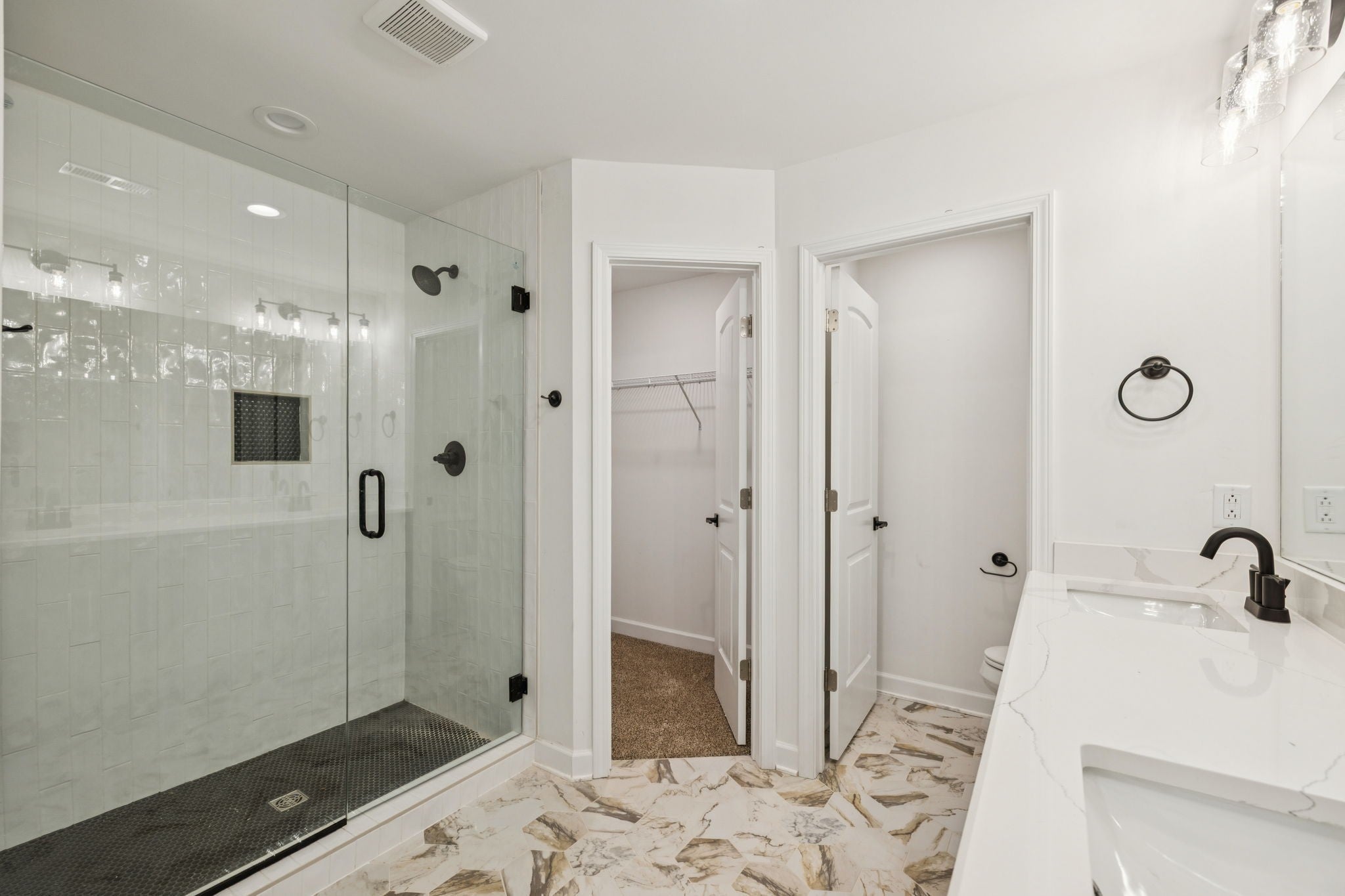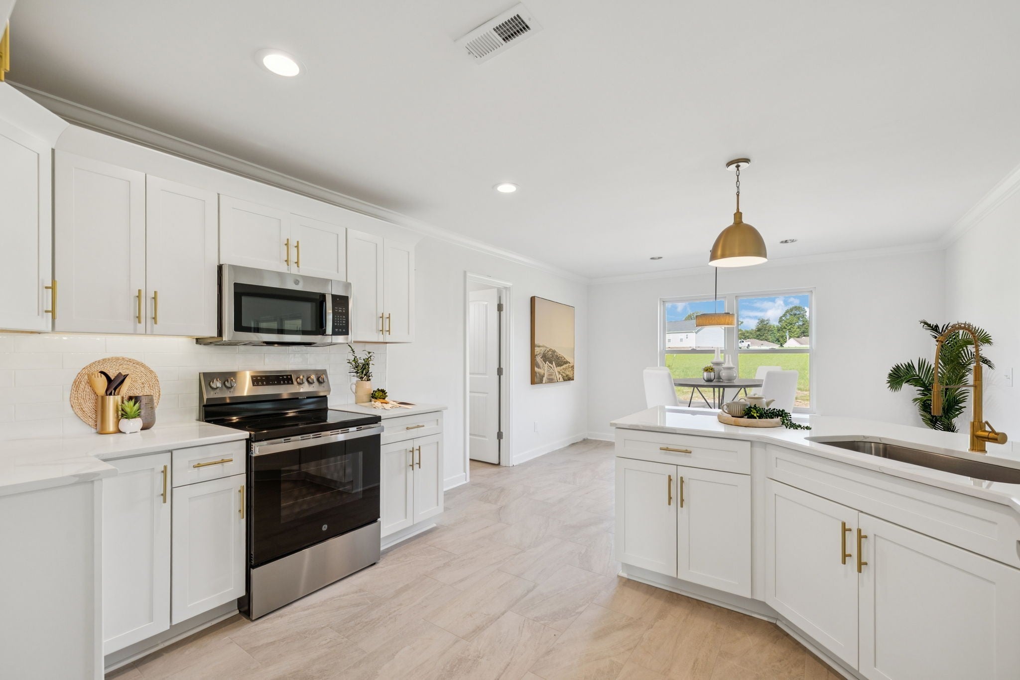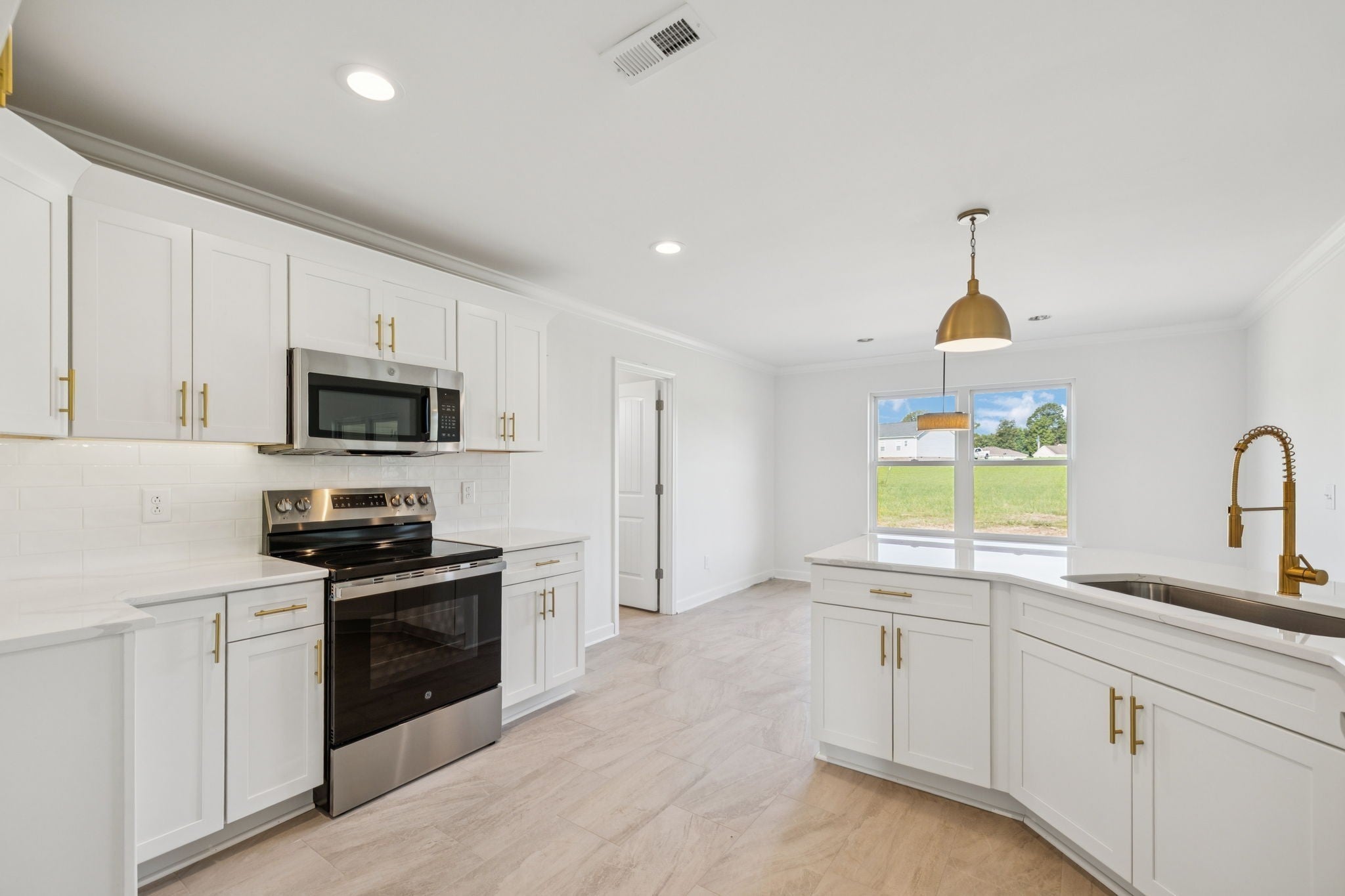 Brand new home on large lot in neighborhood with large lots which allows for privacy. The home features a brick front, black edged windows, 3/4 glass French front door, BI blinds in back door, large covered back porch, white cabinets with brushed gold handles and quartz tops, gorgeous designer brushed gold kitchen faucet, large 06x06 flex room for pantry or office space, top of the line 7" LVP flooring, mosaic tile baths and utility room flooring, large tile master shower with niche and penny tile floor, black bathroom cabinets with quartz tops, upscale lighting, large bonus room, pedestrian door to garage. Andersen single hung windows, interior door levers, farmhouse sink, quartz tops in baths, upgraded insulated garage door with pedestrian entry, linen closet in both baths, raised height bath cabinets, edgeless shower door, under cabinet lighting in kitchen. Quality construction.