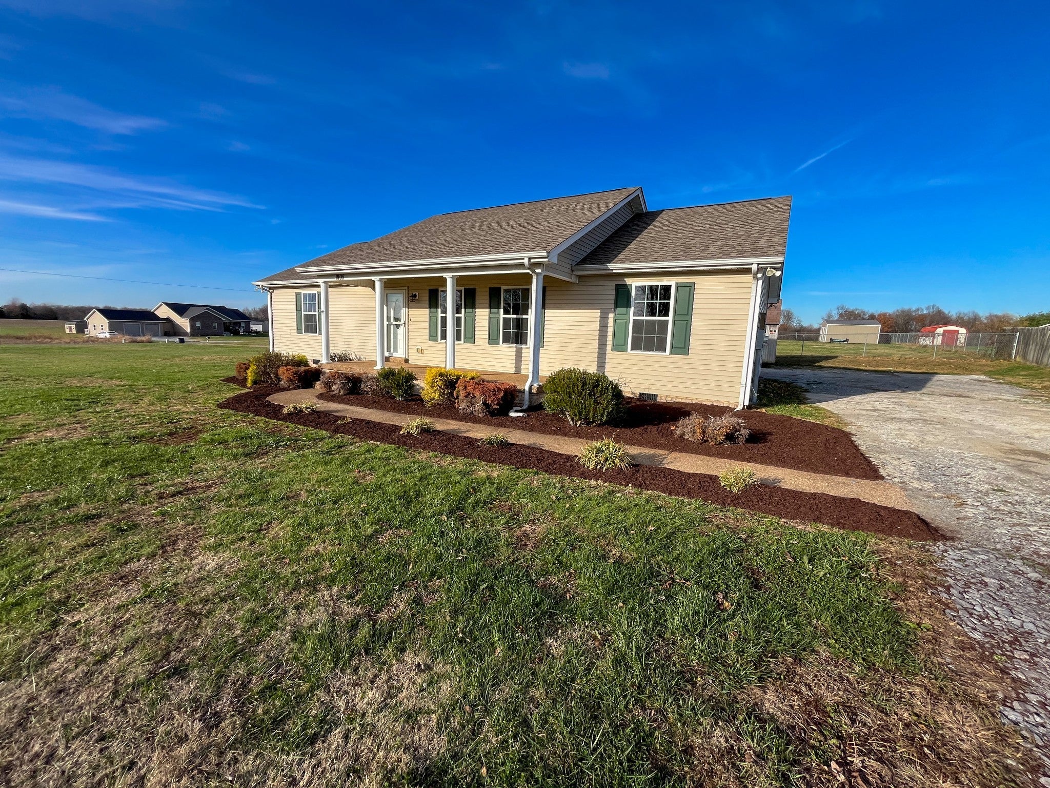 Beautiful renovated home in a picturesque setting. Get away from the city and enjoy the country life. Over 1500 Sqft with all the upgrades: New Luxury Vinyl Plank Flooring throughout, Granite Counter Tops, Paint, Landscaping, Plumbing Fixtures, Hot Water Heater, and so much more! Fenced area for your animals. Back porch for those BBQ evenings with friends. Storage building to keep lawn items. NO HOA FEES! Please contact agent with any questions.