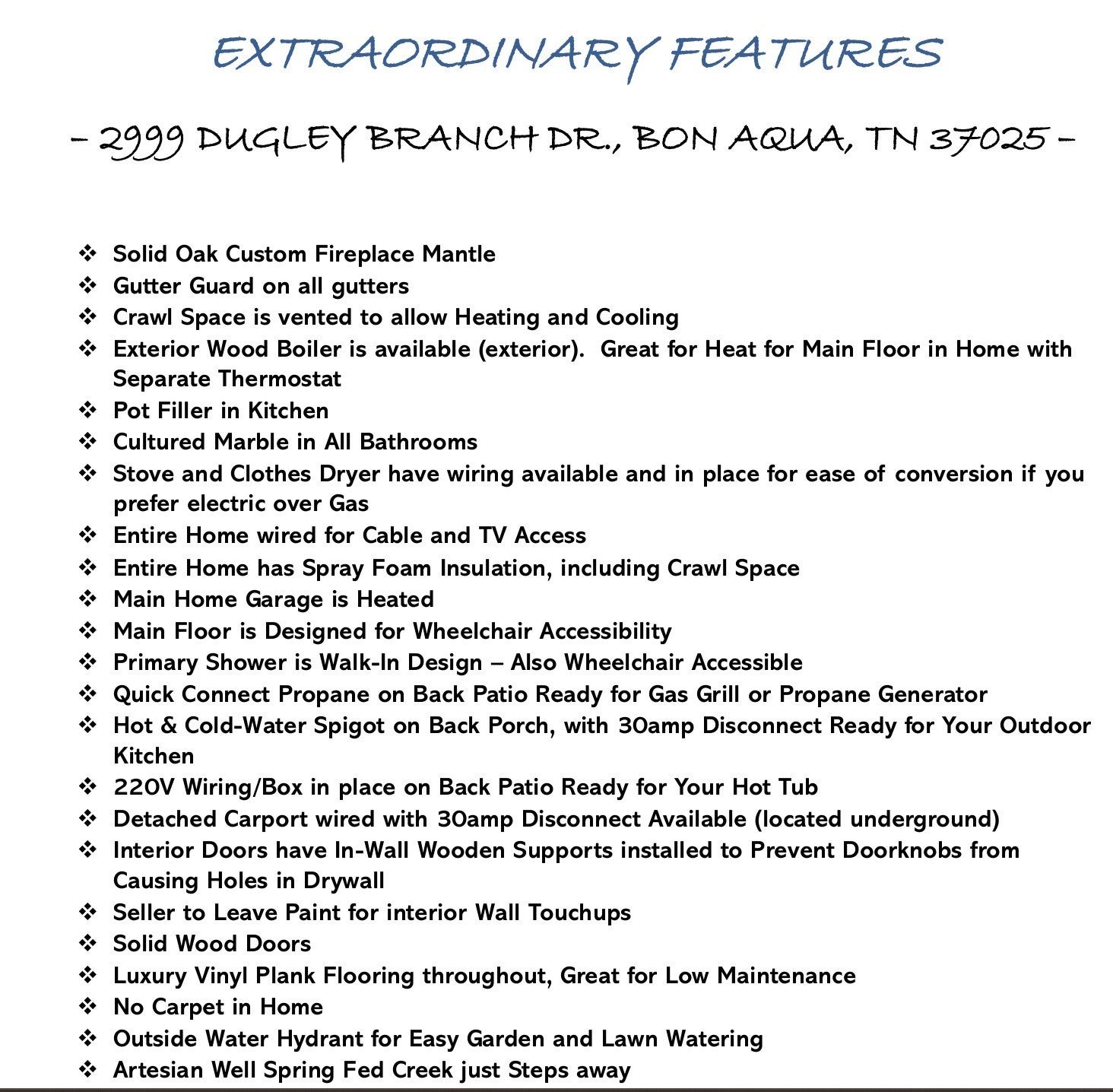 WELCOME HOME TO YOUR PRIVATE PARADISE! Peaceful Country Living Meets Modern Craftsmanship on 10 Acres in Bon Aqua - Pristine wooded acres features a Year-Round ARTESIAN SPRING FED CREEK. Lush scenery and endless possibilities for a mini farm, or private space to unwind. This Craftsman-style MAINTENANCE FREE EXTERIOR - ALL BRICK home perfectly balances timeless charm with refined upgrades, surrounded by the beauty of nature. Inside you will find 4 spacious bedrooms including DUAL PRIMARY SUITES (one on the main level, one upstairs) and 3.5 luxurious baths highlighted by Cultured Marble-tiled showers and Elegant finishes. Designed for ALL GENERATIONS, the main level is designed for wheelchair accessibility providing an Open and Inviting Flow Floor Plan. Luxury Vinyl Plank Flooring throughout. The spacious kitchen is a showstopper with a beautiful Kitchen Island of your dreams. Features include QUARTZ countertops, STAINLESS STEEL appliances, CUSTOM Craftsman Cabinetry open to the Dining and Living areas for seamless entertaining. MASSIVE BONUS ROOM above the garage offers flexibility for a HOME OFFICE, MEDIA ROOM OR HOME GYM. The 25x23 HEATED garage is spacious and has one bay door that is Extra Tall for your oversized vehicles or RV. Soak in the stunning sunset views from your covered front porch. Relax on the private back patio surrounded by peaceful woods and the spring fed brook is just steps away. Patio has 220V wired, ready for your HOT TUB or OUTDOOR KITCHEN with HOT/COLD SPIGOTS. The acreage offers ample room for animals, gardens, trails, or outdoor recreation, a true COUNTRY HAVEN. Additional features: SPRAY FOAM INSULATION, FULLY ENCAPSULATED CRAWL SPACE, BUILT-IN SAFE, SOLID WOOD DOORS, WOOD BOILER Heat Option. Located just minutes from I-840, providing easy access to Nashville, Franklin, Leipers Fork, Dickson, Fairview & Centerville. **PLEASE DO NOT GO ONTO PROPERTY WITHOUT APPOINTMENT & AGENT PRESENT. Pond is owned by seller, buyers have access to use.