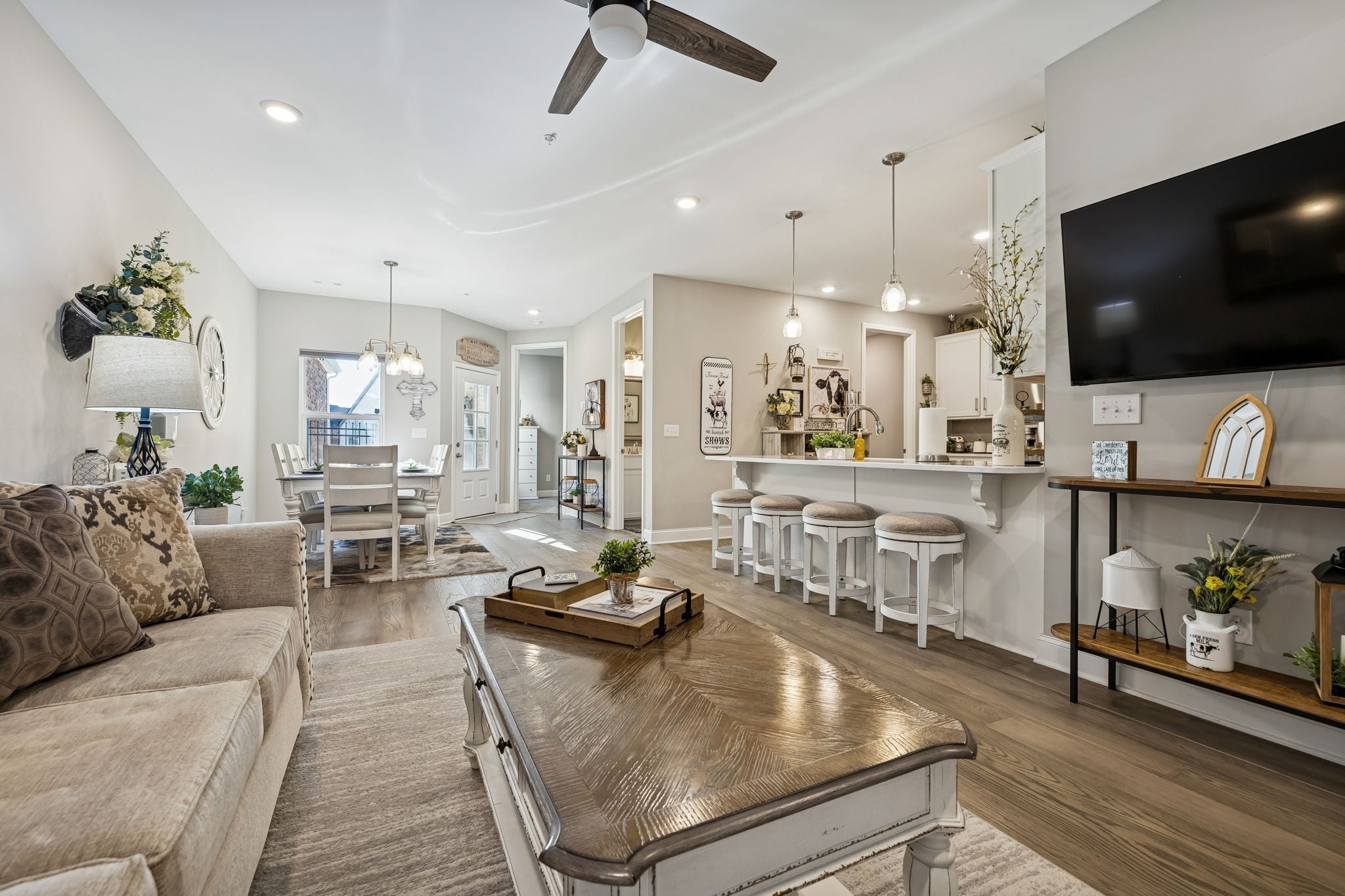 Welcome Home to 308 Buckner Circle, a beautifully maintained home in the sought-after 55+ Groves Reserve community in Mt. Juliet. This charming residence offers easy, low-maintenance living with a thoughtful layout that includes two main-level bedrooms and an upstairs flex/guest space perfect for hobbies, visitors, or extra storage. The private back patio and 2-car garage add extra convenience. The bright, modern kitchen stands out with white cabinetry, soft-close doors and drawers, upgraded quartz countertops, under-cabinet lighting, a large gas range, and a top-tier appliance package. Ample workspace and a seamless flow to the dining and living areas make everyday living and entertaining effortless. Throughout the home, upgraded lighting enhances the warm, inviting feel. Just off the main living space, the inviting Florida room/den offers a peaceful, private view—ideal for morning coffee, reading, or simply relaxing. The primary suite provides a calm retreat with great natural light and convenient access to the main living areas, while the second bedroom works perfectly for guests or a home office. A two-car garage, low-maintenance exterior, and HOA-managed lawn care add to the convenience. Residents love Groves Reserve for its quiet, friendly atmosphere and unbeatable location. Shopping, dining, medical services, parks, and major roads are all just minutes away, making this one of Mt. Juliet’s most desirable active-adult neighborhoods. 308 Buckner Circle offers comfort, connection, thoughtful upgrades, and an easy, relaxed lifestyle…ready to welcome its next owners!