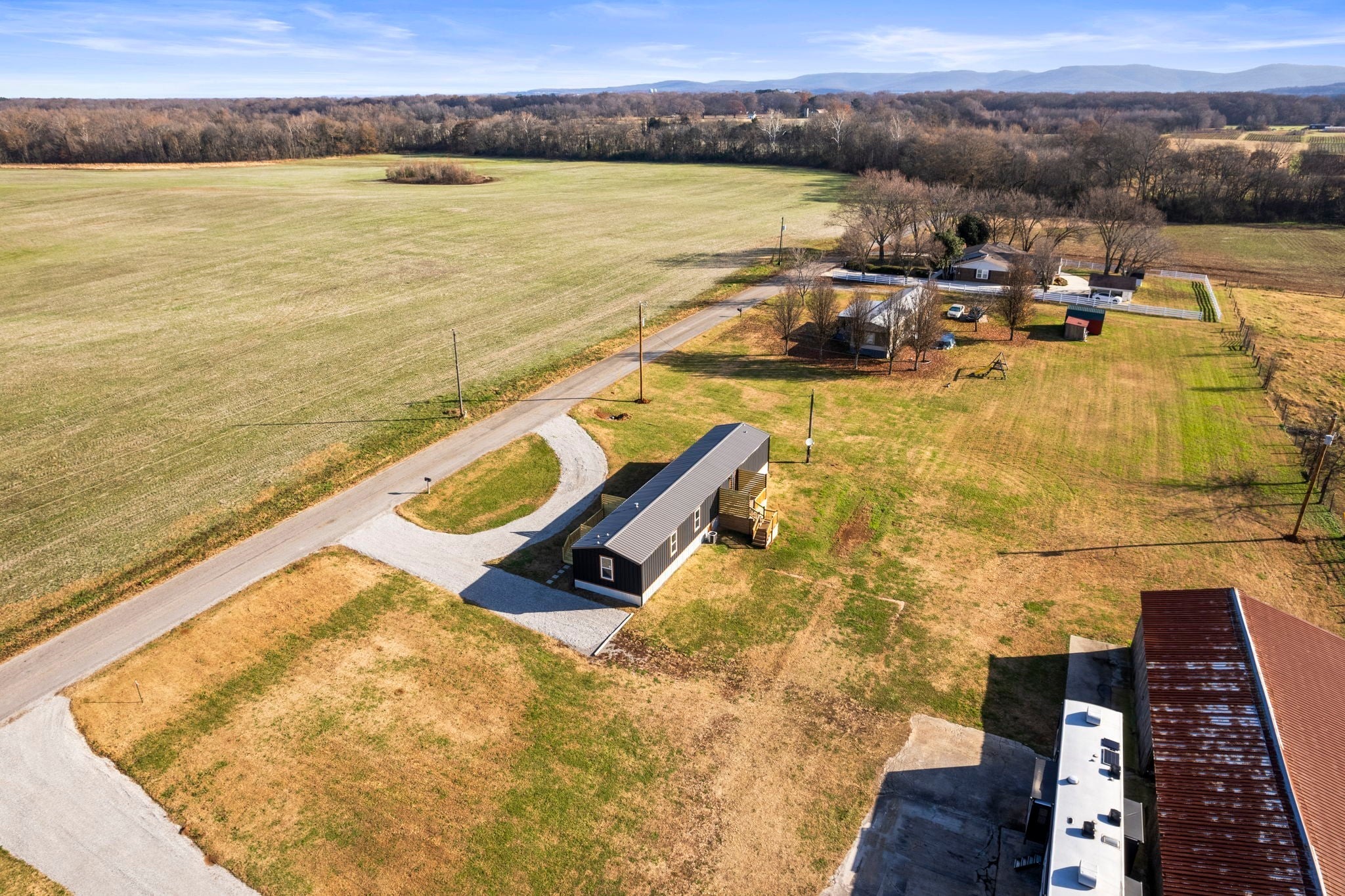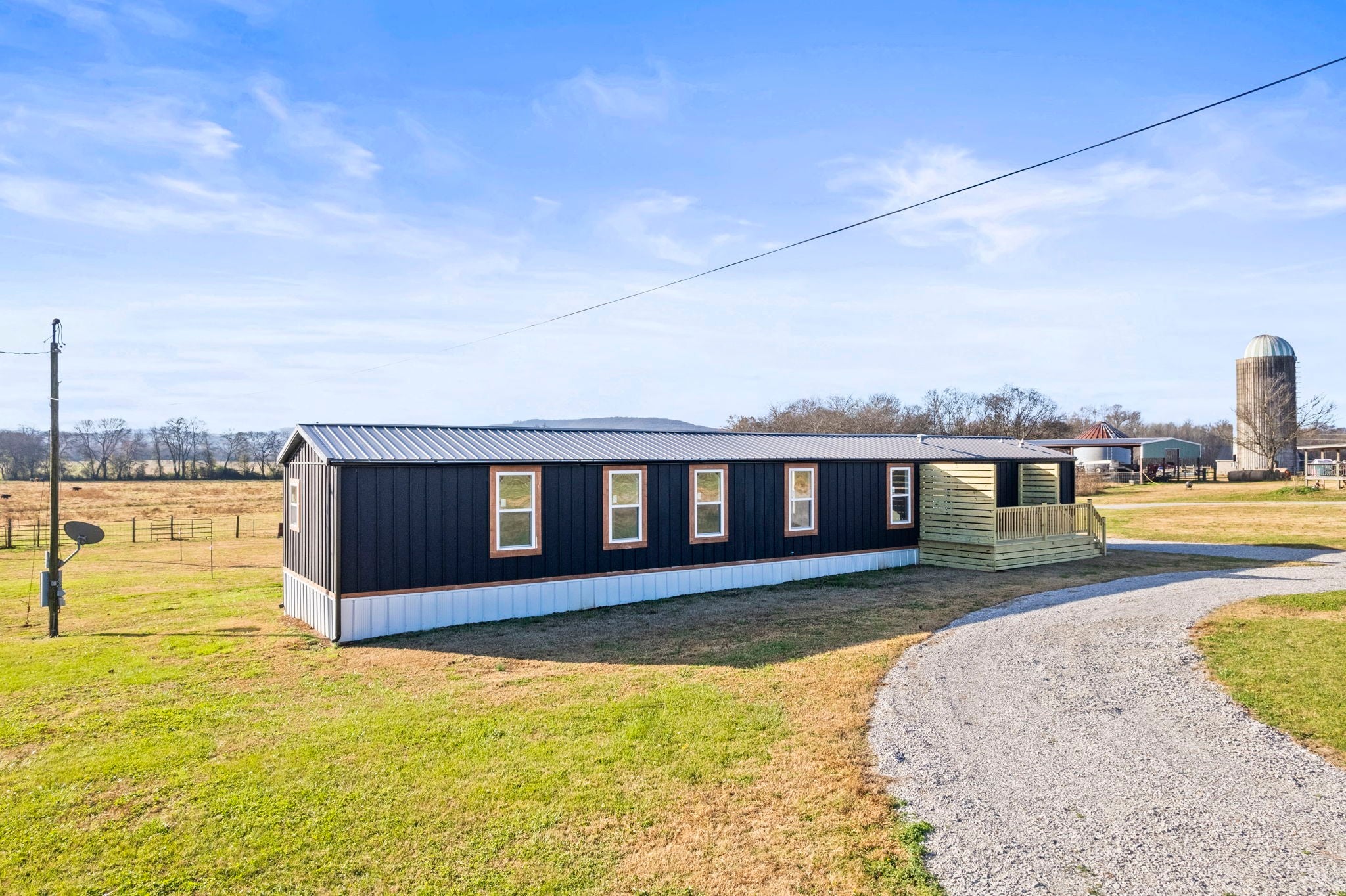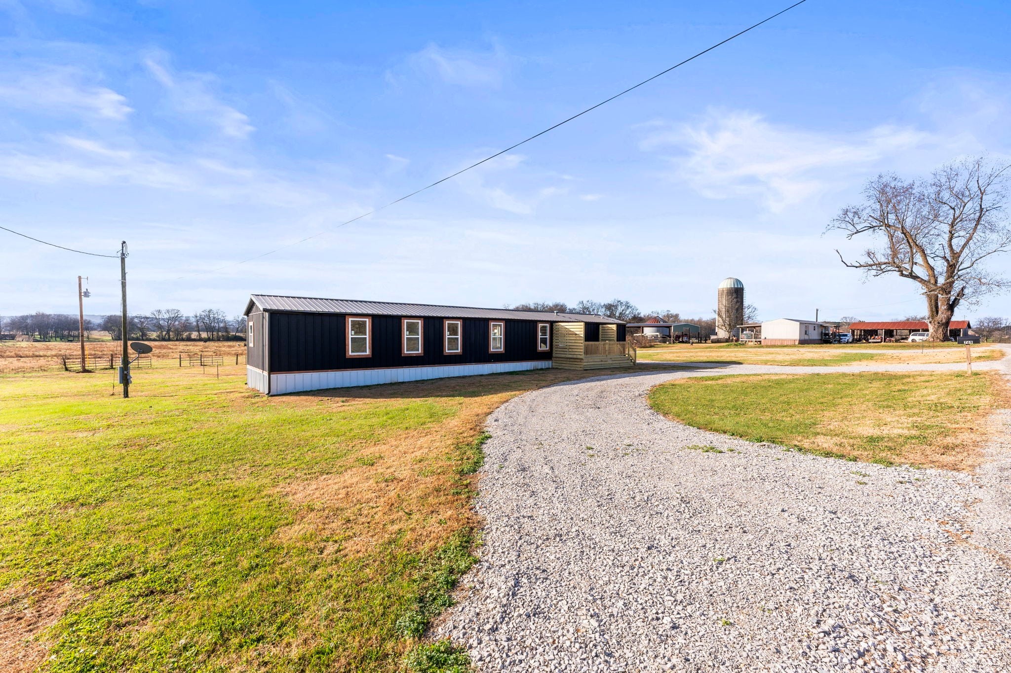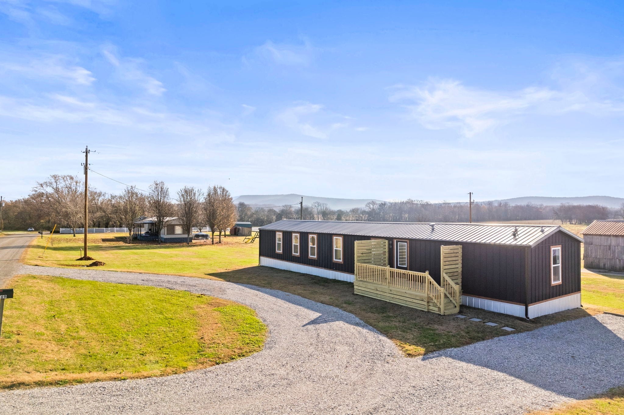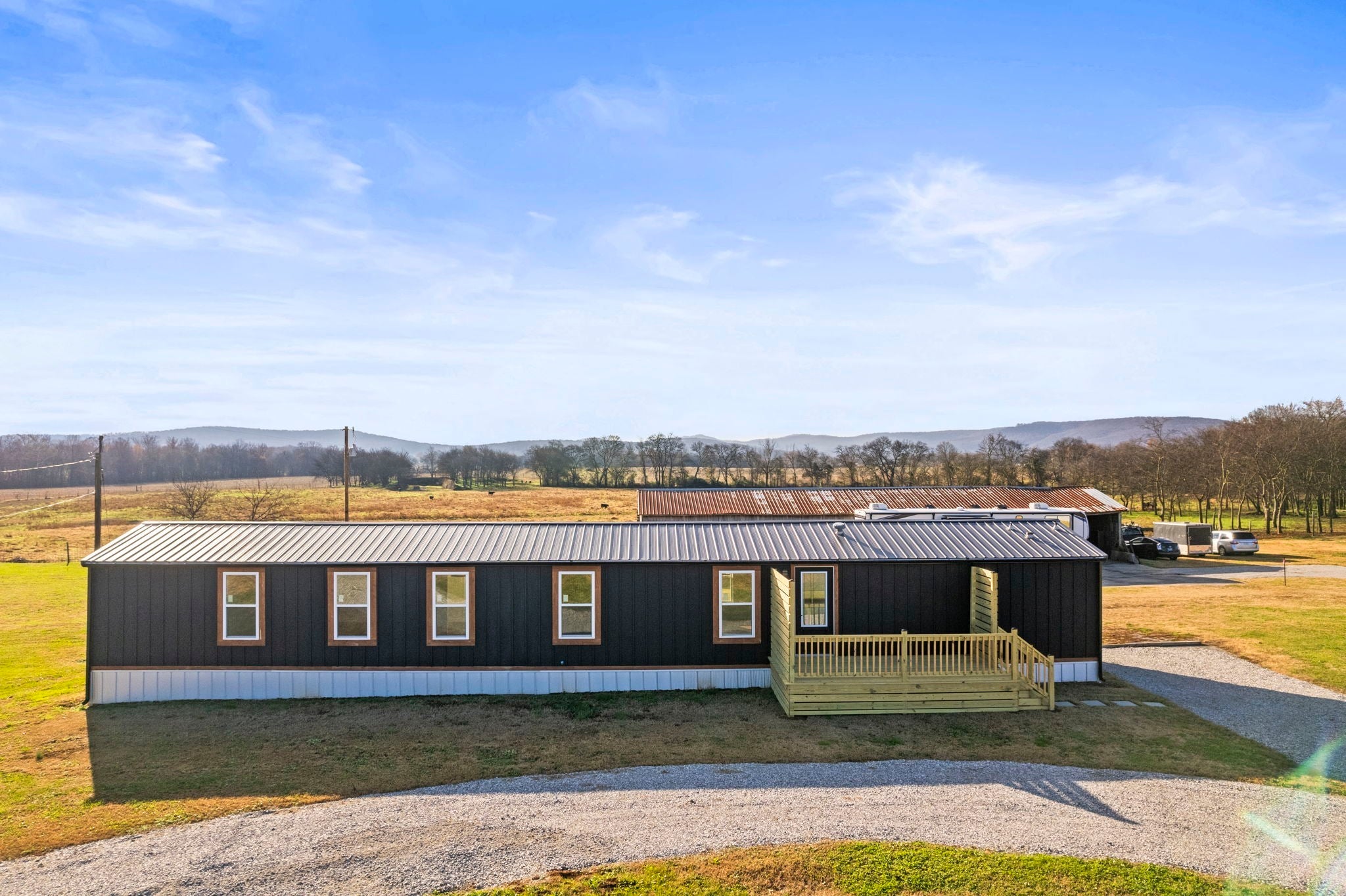 Completely re-done (EVERYTHING IS NEW!) [roof, siding, HVAC (efficient heat pump!!) windows, doors, floors, drywall, paint, flooring, trim, plumbing/elect fixtures, water heater, appliances etc!] Modern-farmhouse style, manufactured home on foundation (skirting over foundation) - wonderful location with beautiful views and desirable open and split floorplan (primary suite on one end, 2 bedrooms and bathroom at other end) Feels larger than the sq footage. Barn does not convey and is being remodeled to match style of house (black with nice wood accents) Buyer to verify anything important (schools, measurements, etc) Owner-agent. Priced to sell! You can't find anything nicer at this price. Must see to appreciate! Tax card does not reflect minor division. Property is .501 +/- acres (see survey in photos). Room to add shop in area between driveways!