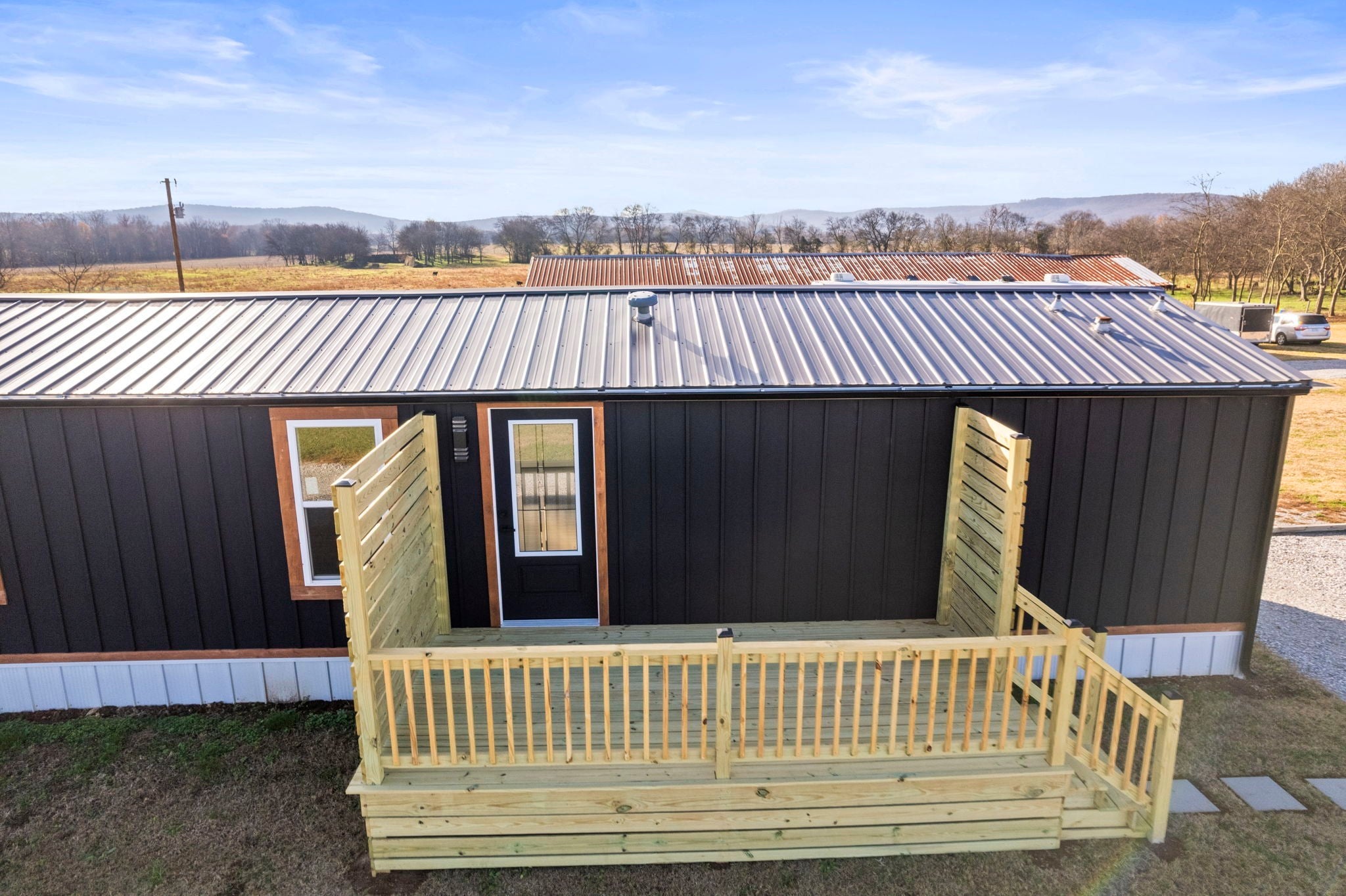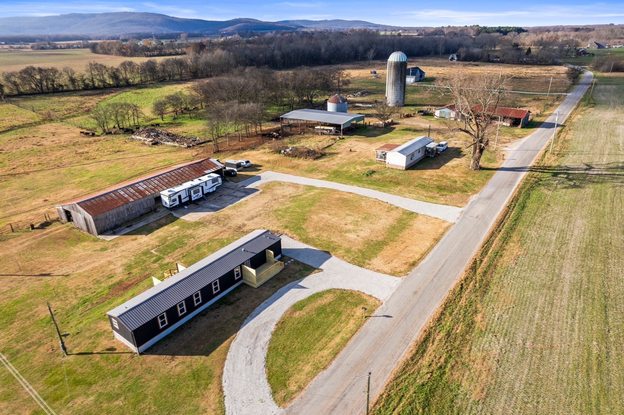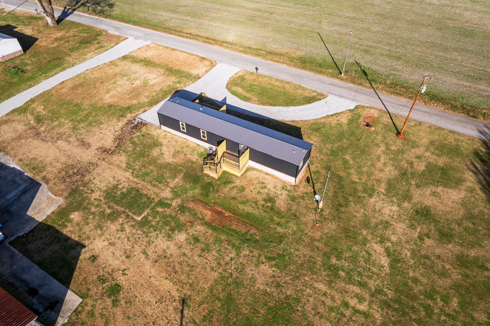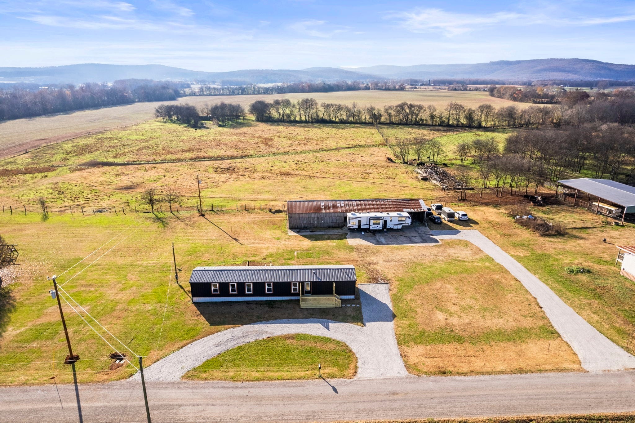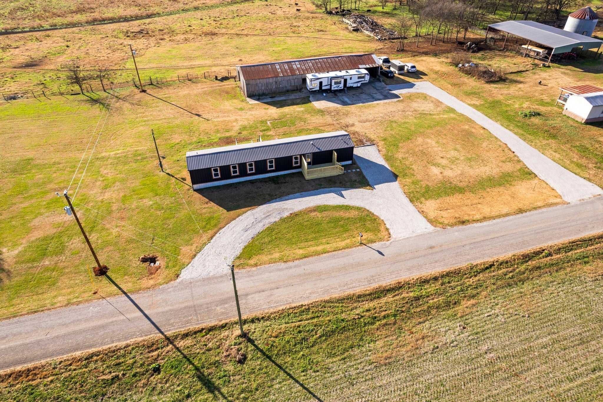 Completely re-done (EVERYTHING IS NEW!) [roof, siding, HVAC (efficient heat pump!!) windows, doors, floors, drywall, paint, flooring, trim, plumbing/elect fixtures, water heater, appliances etc!] Modern-farmhouse style, manufactured home on foundation (skirting over foundation) - wonderful location with beautiful views and desirable open and split floorplan (primary suite on one end, 2 bedrooms and bathroom at other end) Feels larger than the sq footage. Barn does not convey and is being remodeled to match style of house (black with nice wood accents) Buyer to verify anything important (schools, measurements, etc) Owner-agent. Priced to sell! You can't find anything nicer at this price. Must see to appreciate! Tax card does not reflect minor division. Property is .501 +/- acres (see survey in photos). Room to add shop in area between driveways!