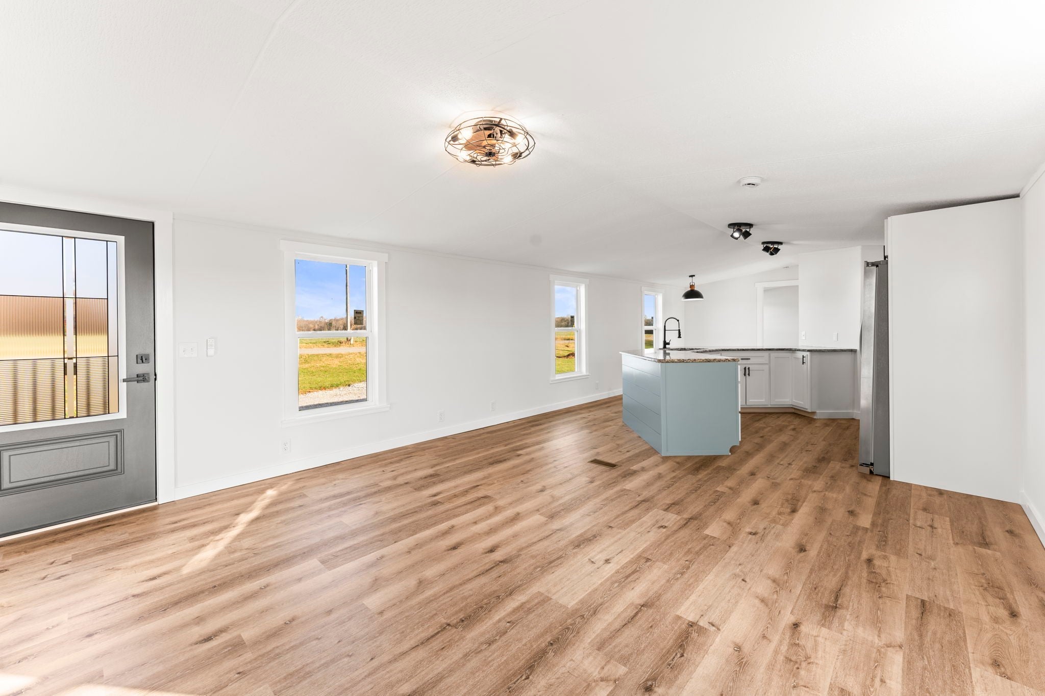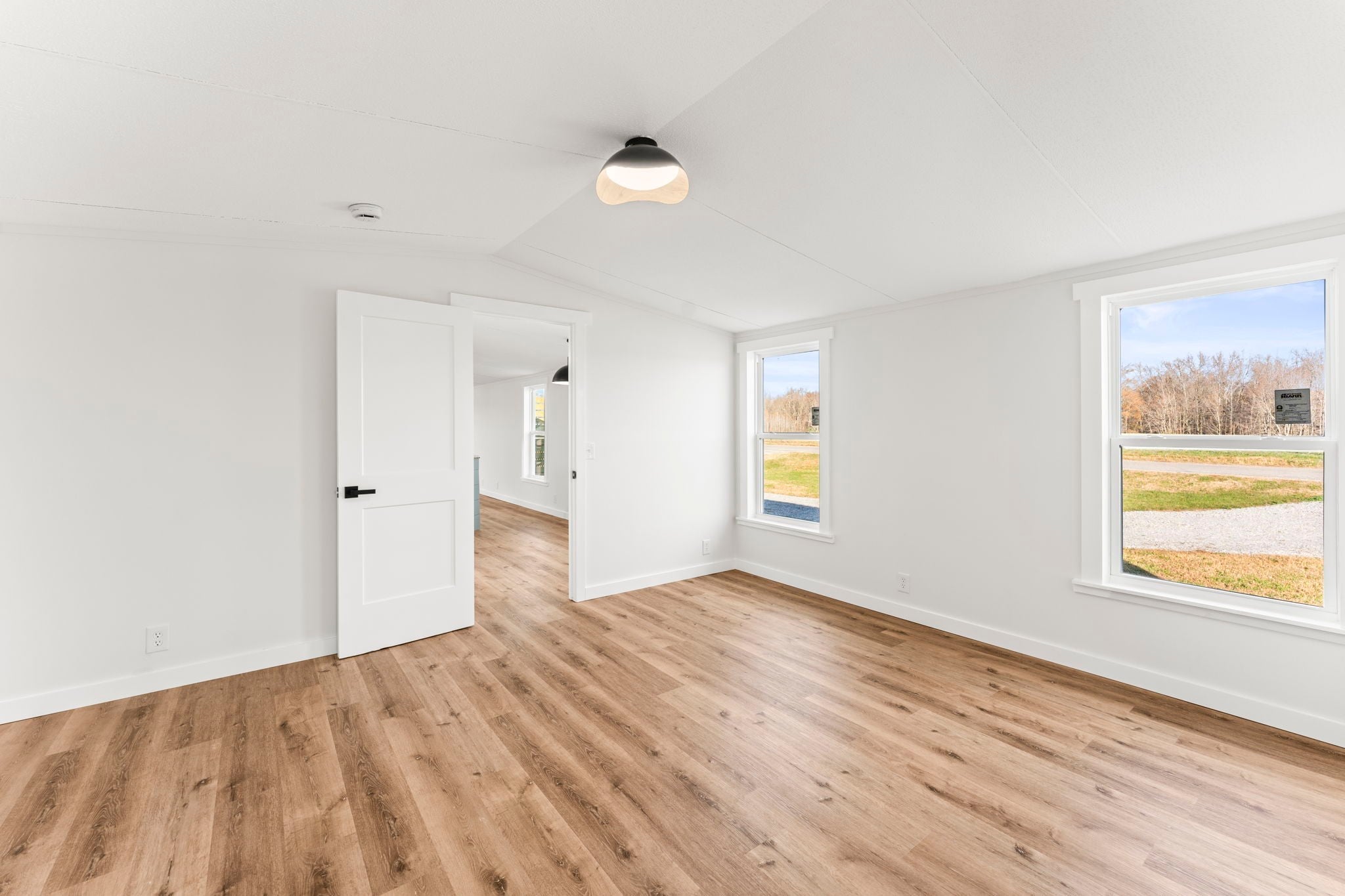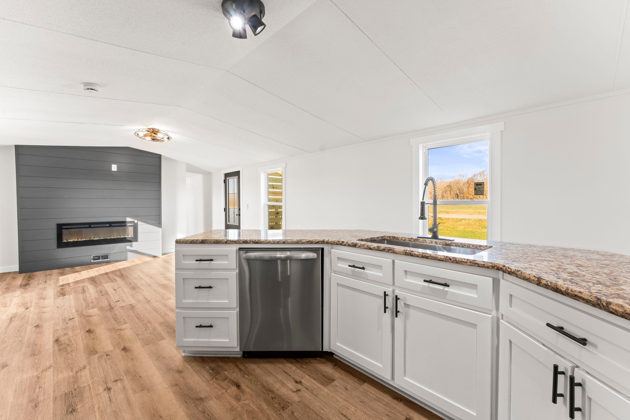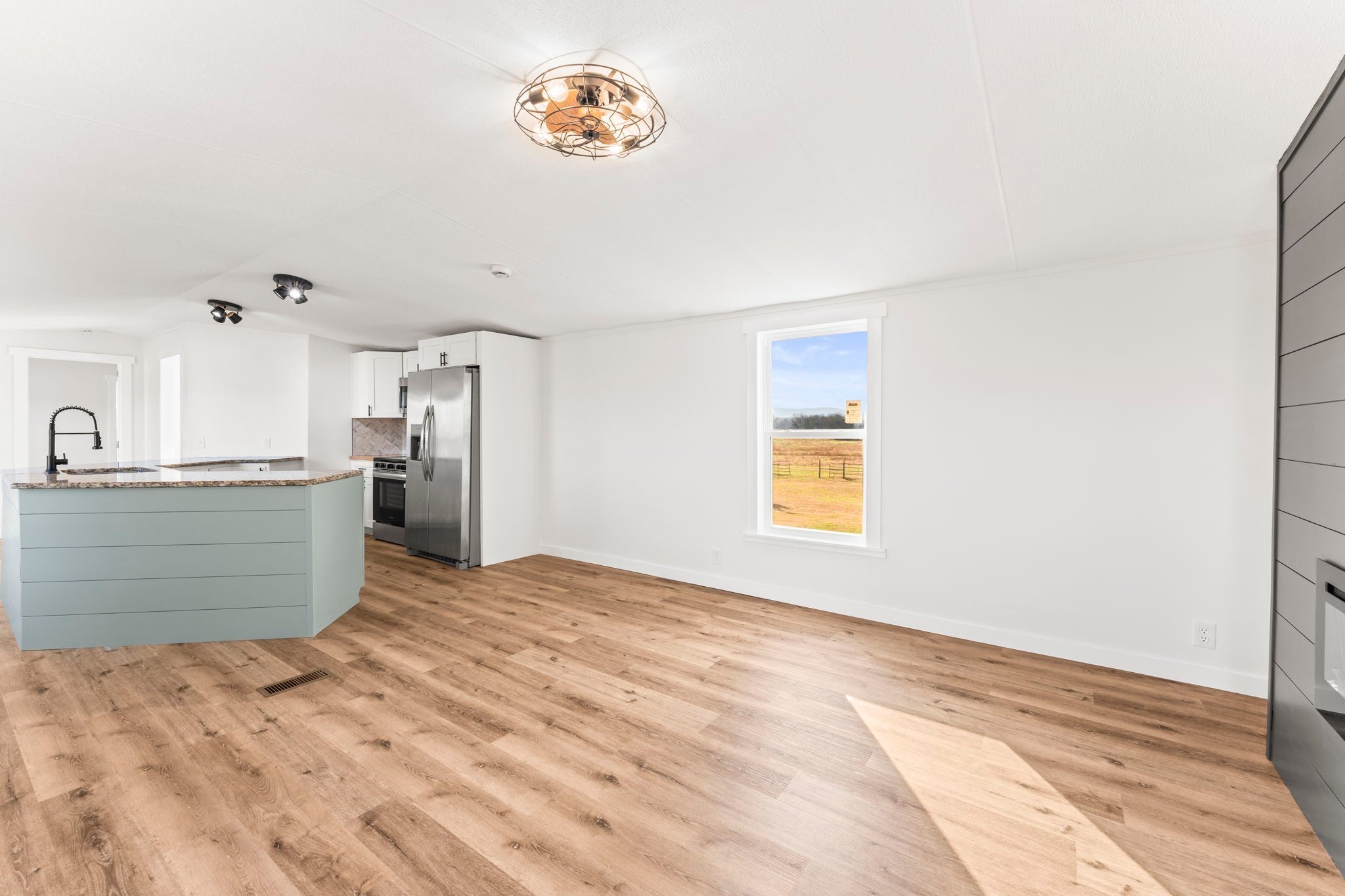 Completely re-done (EVERYTHING IS NEW!) [roof, siding, HVAC (efficient heat pump!!) windows, doors, floors, drywall, paint, flooring, trim, plumbing/elect fixtures, water heater, appliances etc!] Modern-farmhouse style, manufactured home on foundation (skirting over foundation) - wonderful location with beautiful views and desirable open and split floorplan (primary suite on one end, 2 bedrooms and bathroom at other end) Feels larger than the sq footage. Barn does not convey and is being remodeled to match style of house (black with nice wood accents) Buyer to verify anything important (schools, measurements, etc) Owner-agent. Priced to sell! You can't find anything nicer at this price. Must see to appreciate! Tax card does not reflect minor division. Property is .501 +/- acres (see survey in photos). Room to add shop in area between driveways!