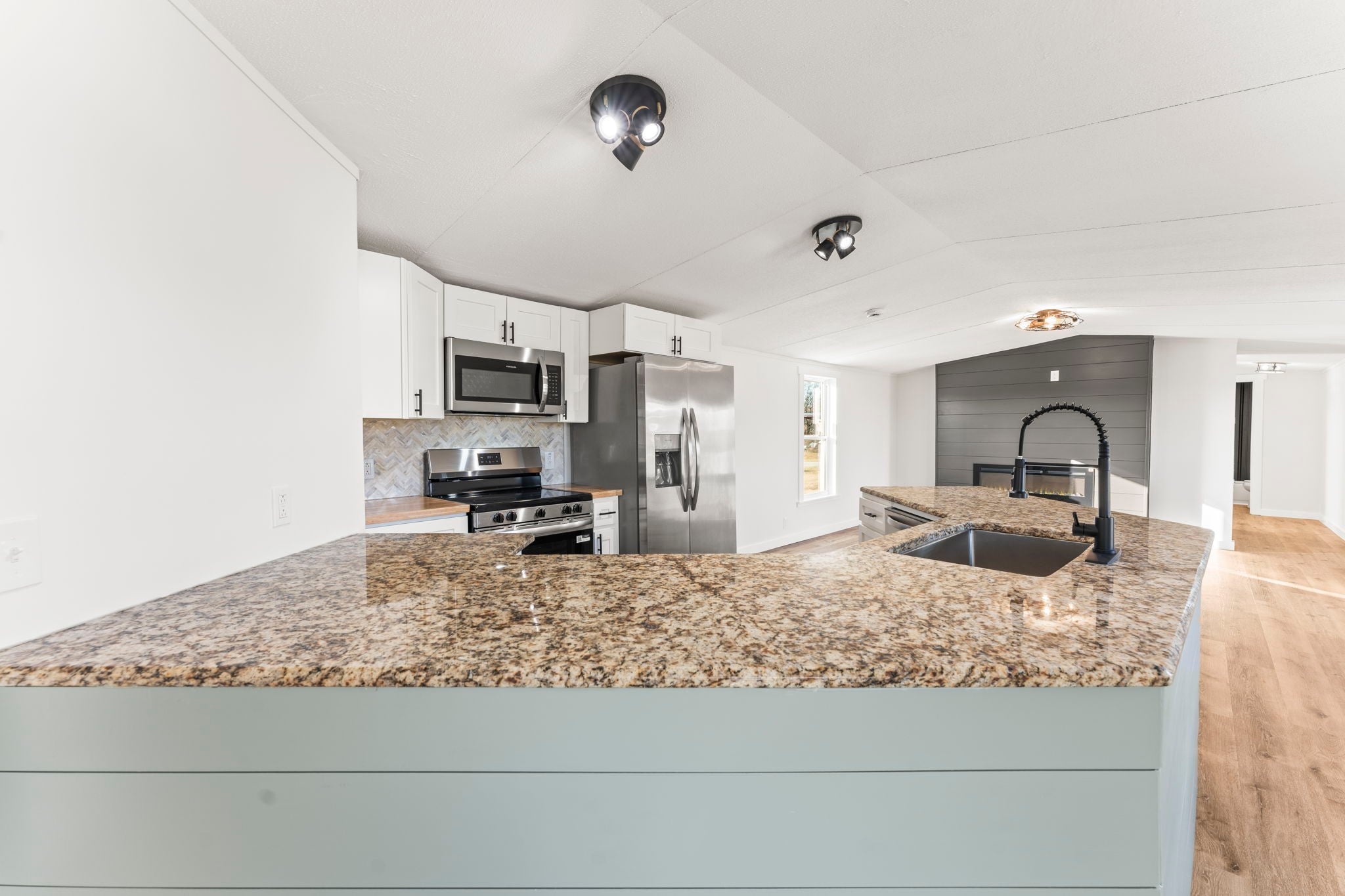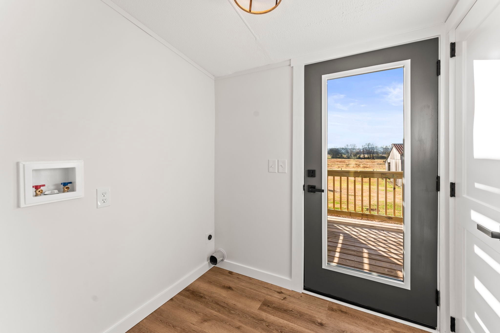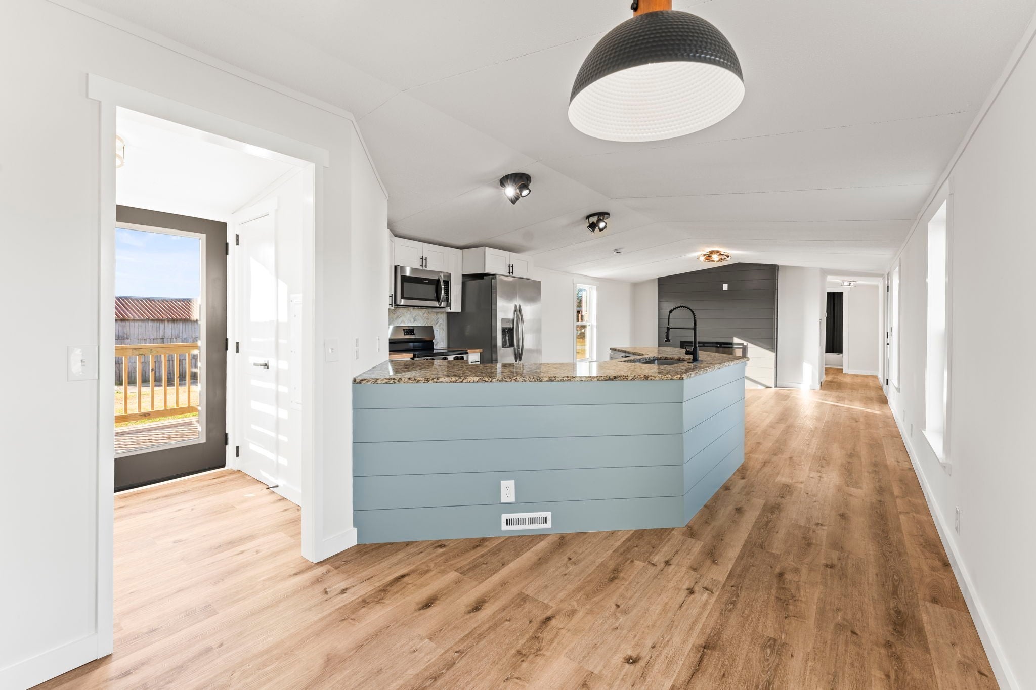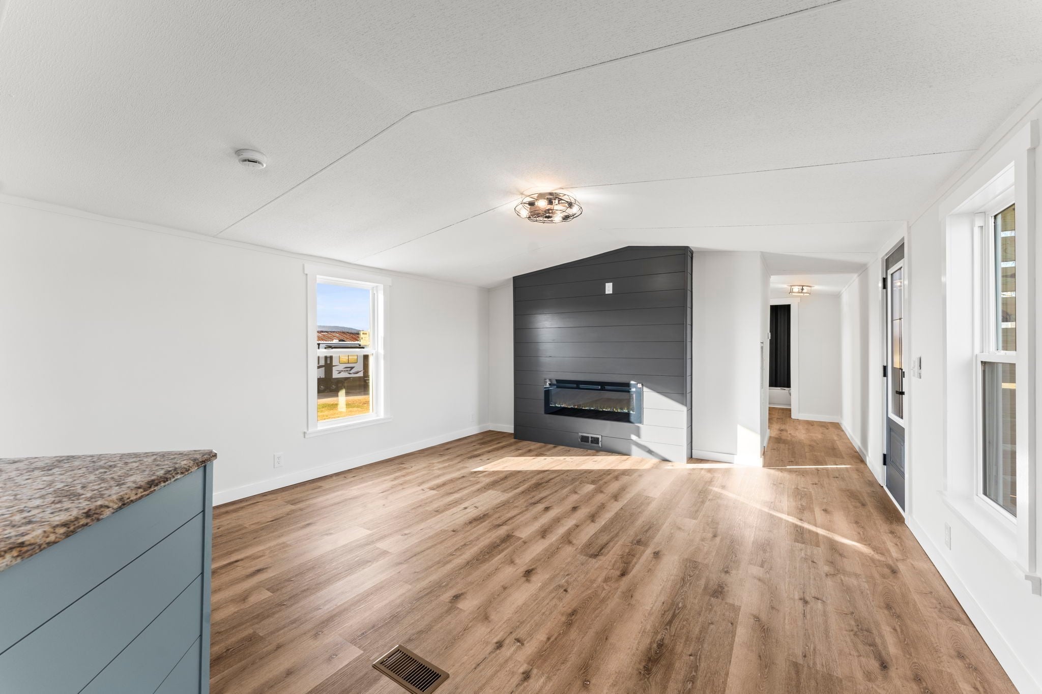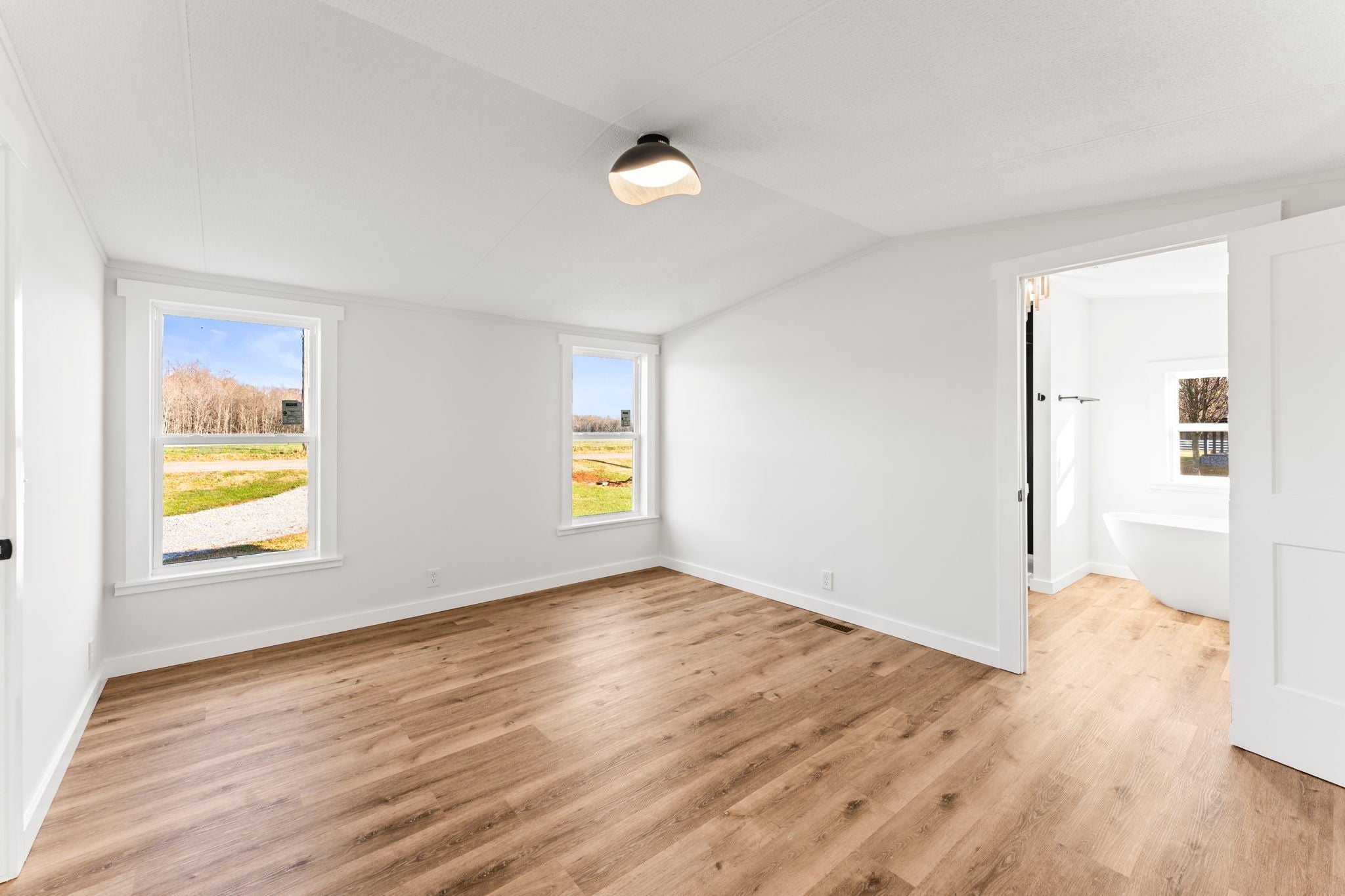 Completely re-done (EVERYTHING IS NEW!) [roof, siding, HVAC (efficient heat pump!!) windows, doors, floors, drywall, paint, flooring, trim, plumbing/elect fixtures, water heater, appliances etc!] Modern-farmhouse style, manufactured home on foundation (skirting over foundation) - wonderful location with beautiful views and desirable open and split floorplan (primary suite on one end, 2 bedrooms and bathroom at other end) Feels larger than the sq footage. Barn does not convey and is being remodeled to match style of house (black with nice wood accents) Buyer to verify anything important (schools, measurements, etc) Owner-agent. Priced to sell! You can't find anything nicer at this price. Must see to appreciate! Tax card does not reflect minor division. Property is .501 +/- acres (see survey in photos). Room to add shop in area between driveways!